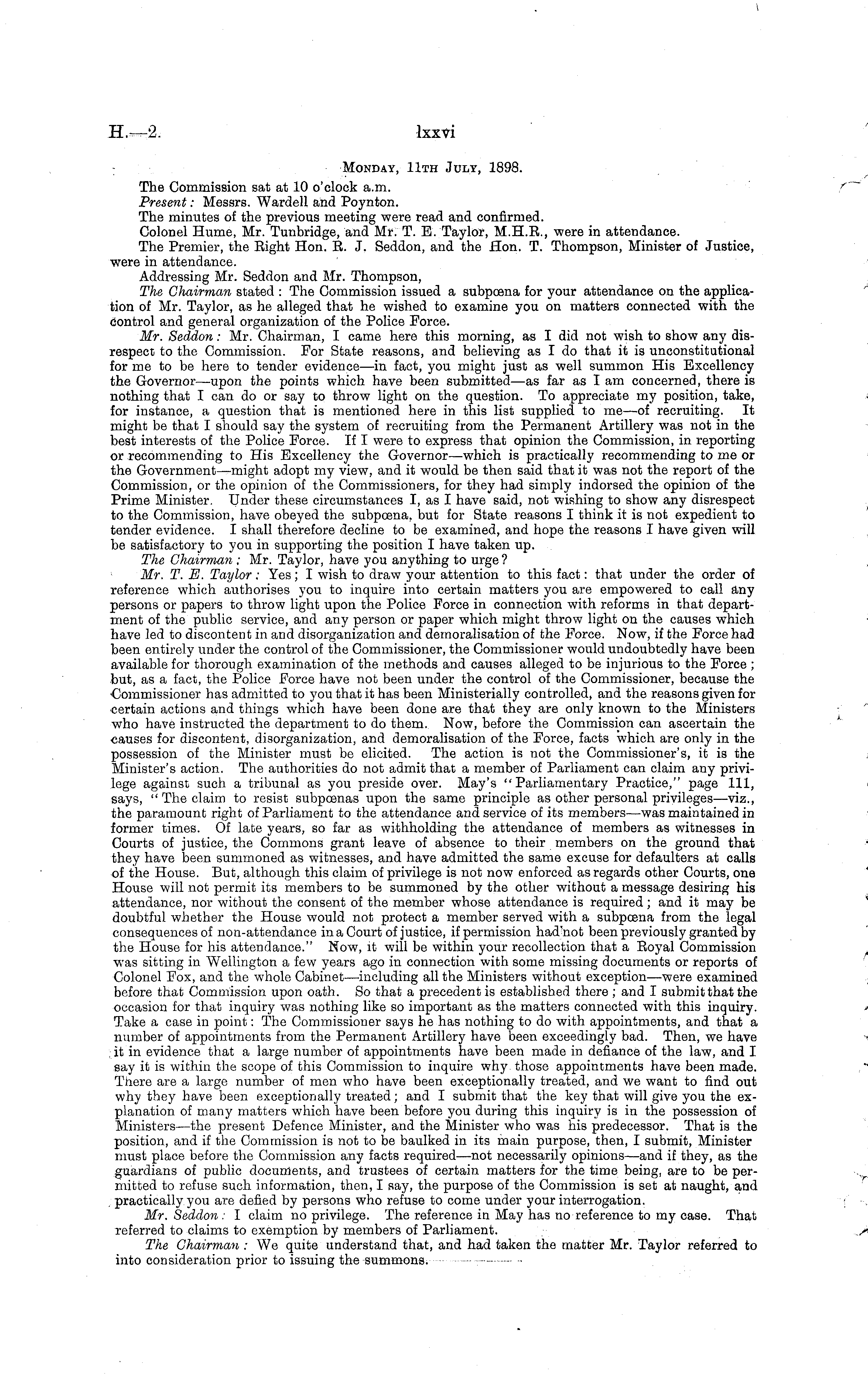 : Monday, 11th July, 1898. The Commission sat at 10 o'clock a.m. Present: Messrs. Wardell and Poynton. The minutes of the previous meeting were read and confirmed. Colonel Hume, Mr. Tunbridge, and Mr. T. E. Taylor, M.H.E., were in attendance. The Premier, the Eight Hon. B. J. Seddon, and the Hon. T. Thompson, Minister of Justice, were in attendance. Addressing Mr. Seddon and Mr. Thompson, The Chairman stated : The Commission issued a subpoena for your attendance on the application of Mr. Taylor, as he alleged that he wished to examine you on matters connected with the control and general organization of the Police Force. Mr. Seddon: Mr. Chairman, I came here this morning, as I did not wish to show any disrespect to the Commission. For State reasons, and believing as I do that it is unconstitutional for me to be here to tender evidence—in fact, you might just as well summon His Excellency the Governor—upon the points which have been submitted—as far as I am concerned, there is nothing that I can do or say to throw light on the question. To appreciate my position, take, for instance, a question that is mentioned here in this list supplied to me—of recruiting. It might be that I should say the system of recruiting from the Permanent Artillery was not in the best interests of the Police Force. If I were to express that opinion the Commission, in reporting or recommending to His Excellency the Governor—which is practically recommending to me or the Government —might adopt my view, and it would be then said that it was not the report of the Commission, or the opinion of the Commissioners, for they had simply indorsed the opinion of the Prime Minister. Under these circumstances I, as I have said, not wishing to show any disrespect to the Commission, have obeyed the subpoena, but for State reasons I think it is not expedient to tender evidence. I shall therefore decline to be examined, and hope the reasons I have given will be satisfactory to you in supporting the position I have taken up. The Chairman: Mr. Taylor, have you anything to urge ? Mr. T. E. Taylor: Yes; I wish to draw your attention to this fact: that under the order of reference which authorises you to inquire into certain matters you are empowered to call any persons or papers to throw light upon the Police Force in connection with reforms in that department of the public service, and any person or paper which might throw light on the causes which have led to discontent in and disorganization and demoralisation of the Force. Now, if the Force had been entirely under the control of the Commissioner, the Commissioner would undoubtedly have been available for thorough examination of the methods and causes alleged to be injurious to the Force ; but, as a fact, the Police Force have not been under the control of the Commissioner, because the Commissioner has admitted to you that it has been Ministerially controlled, and the reasons given for certain actions and things which have been done are that they are only known to the Ministers who have instructed the department to do them. Now, before the Commission can ascertain the causes for discontent, disorganization, and demoralisation of the Force, facts which are only in the possession of the Minister must be elicited. The action is not the Commissioner's, it is the Minister's action. The authorities do not admit that a member of Parliament can claim any privilege against such a tribunal as you preside over. May's "Parliamentary Practice," page 111, says, " The claim to resist subpoenas upon the same principle as other personal privileges—viz., the paramount right of Parliament to the attendance and service of its members—was maintained in former times. Of late years, so far as withholding the attendance of members as witnesses in Courts of justice, the Commons grant leave of absence to their members on the ground that they have been summoned as witnesses, and have admitted the same excuse for defaulters at calls of the House. But, although this claim of privilege is not now enforced as regards other Courts, one House will not permit its members to be summoned by the other without a message desiring his attendance, nor without the consent of the member whose attendance is required; and it may be doubtful whether the House would not protect a member served with a subpoena from the legal consequences of non-attendance in a Court of justice, if permission had'not been previously granted by the House for his attendance." Now, it will be within your recollection that a Eoyal Commission was sitting in Wellington a few years ago in connection with some missing documents or reports of Colonel Fox, and the whole Cabinet—including all the Ministers without exception—were examined before that Commission upon oath. So that a precedent is established there ; and I submit that the occasion for that inquiry was nothing like so important as the matters connected with this inquiry. Take a case in point: The Commissioner says he has nothing to do with appointments, and that a number of appointments from the Permanent Artillery have been exceedingly bad. Then, we have it in evidence that a large number of appointments have been made in defiance of the law, and I say it is within the scope of this Commission to inquire why those appointments have been made. There are a large number of men who have been exceptionally treated, and we want to find out why they have been exceptionally treated; and I submit that the key that will give you the explanation of many matters which have been before you during this inquiry is in the possession of Ministers—the present Defence Minister, and the Minister who was his predecessor. That is the position, and if the Commission is not to be baulked in its main purpose, then, I submit, Minister must place before the Commission any facts required—not necessarily opinions—and if they, as the guardians of public documents, and trustees of certain matters f