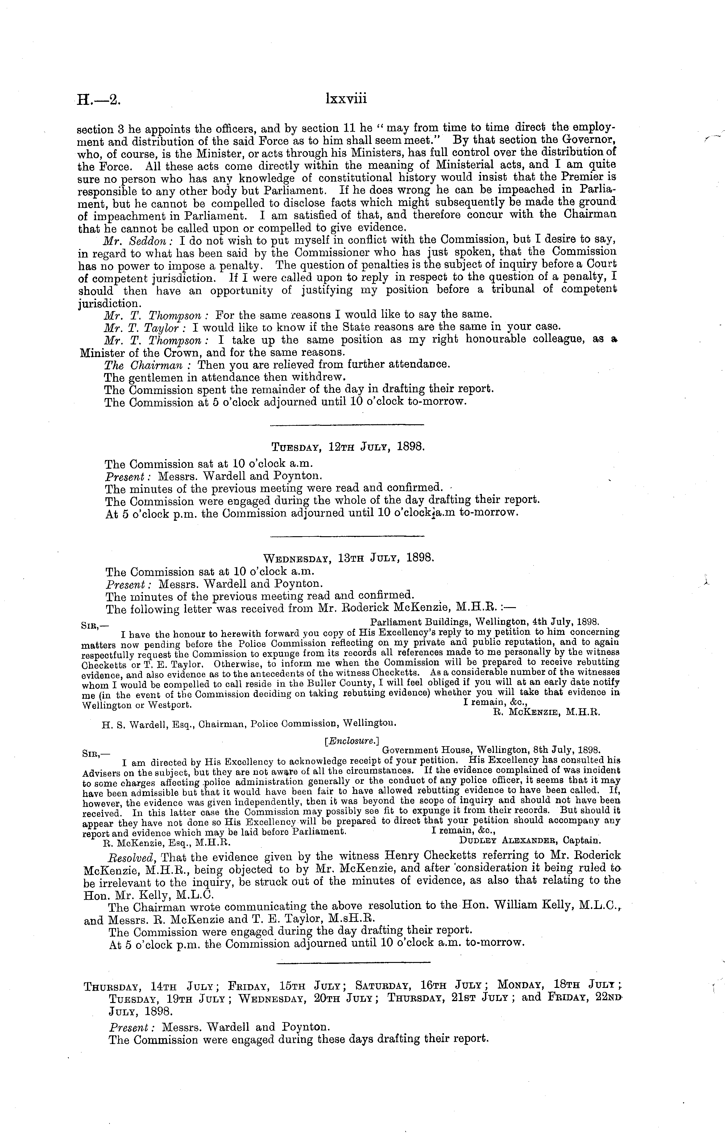 Wednesday, 13th July, 1898. The Commission sat at 10 o'clock a.m. Present: Messrs. Wardell and Poynton. The minutes of the previous meeting read and confirmed. The following letter was received from Mr. Eoderick McKenzie, M.H.E. :— g IK _ Parliament Buildings, Wellington, 4th July, 1898. I have the honour to herewith forward you copy of His Excellency's reply to my petition to him concerning matters now pending before the Police Commission reflecting on my private and public reputation, and to again respectfully request the Commission to expunge from its records all references made to me personally by the witness Checketts or T. E. Taylor. Otherwise, to inform me when the Commission will be prepared to receive rebutting evidence, and also evidence as to the antecedents of the witness Checketta. Aβ a considerable number of the witnesses whom I would be compelled to call reside in the Buller County, I will feel obliged if you will at an early date notify me (in the event of the Commission deciding on taking rebutting evidence) whether you will take that evidence in Wellington or Westport. I remain, &c & R. McKenzie, M.H.E. H. S. Wardell, Esq., Chairman, Police Commission, Wellington. [Enclosure.'] g IB Government House, Wellington, Bth July, 1898. ' lam directed by His Bxoellency to acknowledge receipt of your petition. His Excellency has consulted his Advisers on the subject, but they are not aware of all the circumstances. If the evidence oomplained of was incident to some charges affecting .police administration generally or the conduct of any police officer, it seems that it may have been admissible but that it would have been fair to have allowed rebutting evidence to have been called. If, however, the evidence was given independently, then it was beyond the scope of inquiry and should not have been received In this latter case the Commission may possibly see fit to expunge it from their records. But should it appear they have not done so His Excellency will be prepared to direct that your petition should accompany any report and evidence which may be laid before Parliament. I remain, &c, R. McKenzie, Esq., M.H.R. Dudley Alexander, Captain. Resolved, That the evidence given by the witness Henry Cheeketts referring to Mr. Eoderick McKenzie, M.H.E., being objected to by Mr. McKenzie, and after consideration it being ruled to be irrelevant to the inquiry, be struck out of the minutes of evidence, as also that relating to the Hon. Mr. Kelly, M.L.C. The Chairman wrote communicating the above resolution to the Hon. William Kelly, M.L.C.,. and Messrs. E. McKenzie and T. E. Taylor, M.sH.E. The Commission were engaged during the day drafting their report. At 5 o'clock p.m. the Commission adjourned until 10 o'clock a.m. to-morrow.