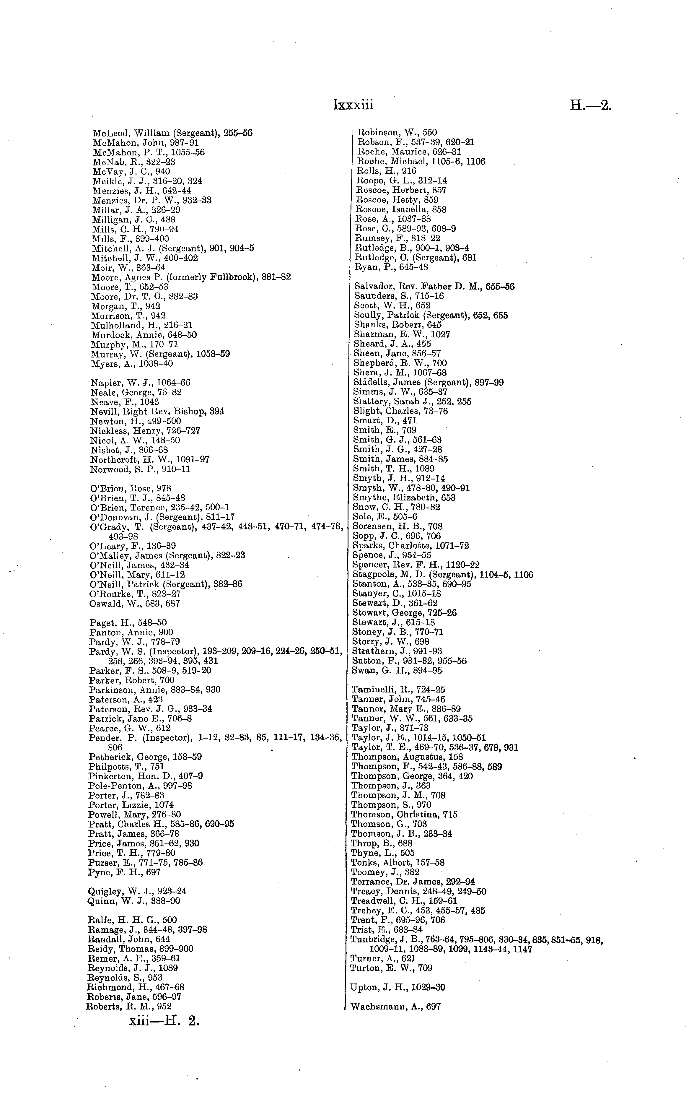 McLeod, William (Sergeant), 255-56 McMahon, John, 987-91 McMahon, P. T., 1055-56 McNab, R., 322-23 McVay, J. C, 940 Meikle, J. J., 316-20, 324 Menzies, J. H., 642-44 Menzies, Dr. P. W., 932-33 Millar, J. A., 226-29 Milligan, J. C, 488 Mills, C. H., 790-94 Mills, F., 399-400 Mitchell, A. J. (Sergeant), 901, 904-5 Mitchell, J. W., 400-402 Moir, W., 363-64 Moore, Agnes P. (formerly Fullbrook), 881-82 Moore, T., 652-53 Moore, Dr. T. C, 882-83 Morgan, T., 942 Morrison, T., 942 Mulholland, H., 216-21 Murdock, Annie, 648-50 Murphy, M., 170-71 Murray, W. (Sergeant), 1058-59 Myers, A., 1038-40 Napier, W. J., 1064-66 Neale, George, 76-82 Neave, F., 1043 Nevill, Right Rev. Bishop, 394 Newton, H., 499-500 Nickless, Henry, 726-727 Nicol, A. W., 148-50 Nisbet, J., 866-68 Northcroft, H. W., 1091-97 Norwood, S. P., 910-11 O'Brien, Rose, 978 O'Brien, T. J., 845-48 O'Brien, Terence, 235-42, 500-1 O'Donovan, J. (Sergeant), 811-17 O'Grady, T. (Sergeant), 437-42, 448-51, 470-71, 474-78, 493-98 O'Leary, F., 136-39 O'Malley, James (Sergeant), 822-23 O'Neill,"james, 432-34 O'Neill, Mary, 611-12 O'Neill, Patrick (Sergeant), 382-86 O'Rourke, T., 823-27 Oswald, W., 683, 687 Paget, H., 548-50 Panton, Annie, 900 Pardy, W. J., 778-79 Pardy, W. S. (Inspector), 193-209, 209-16, 224-26, 250-51, 258, 266, 393-94, 395, 431 Parker, F. S., 508-9, 519-20 Parker, Robert, 700 Parkinson, Annie, 883-84, 930 Paterson, A., 423 Paterson, Rev. J. G., 933-34 Patrick, Jane E., 706-8 Pearee, G. W., 612 Pender, P. (Inspector), 1-12, 82-83, 85, 111-17, 134-36, 806 Petherick, George, 158-59 Philpotts, T., 751 Pinkerton, Hon. D., 407-9 Pole-Penton, A., 997-98 Porter, J., 782-83 Porter, Lizzie, 1074 Powell, Mary, 276-80 Pratt, Charles H., 585-86, 690-95 Pratt, James, 366-78 Price, James, 861-62, 930 Price, T. H., 779-80 Purser, E., 771-75, 785-86 Pyne, F. H., 697 Quigley, W. J., 923-24 Quinn, W. J., 388-90 Ralfe, H. H. G., 500 Ramage, J., 344-48, 397-98 Randall, John, 644 Reidy, Thomas, 899-900 Remer, A. E., 359-61 Reynolds, J. J., 1089 Reynolds, S., 953 Richmond, H., 467-68 Roberts, Jane, 596-97 Roberts, R. M., 952