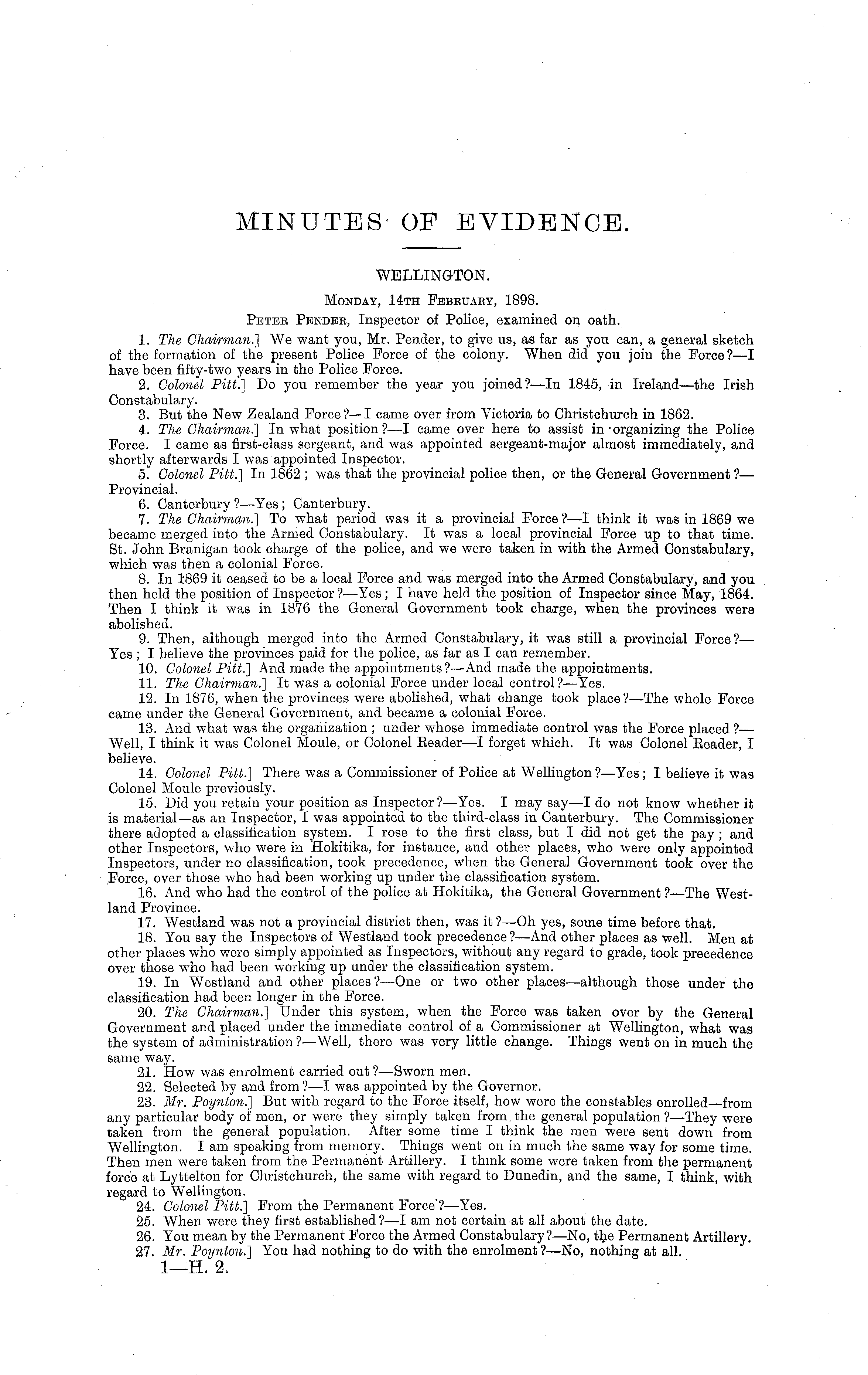 WELLINGTON. Monday, 14th Febkuary, 1898. Peter Pendeb, Inspector of Police, examined on oath. 1. The Chairman.'] We want you, Mr. Pender, to give us, as far as you can, a general sketch of the formation of the present Police Force of the colony. When did you join the Force?—l have been fifty-two years in the Police Force. 2. Colonel Pitt.] Do you remember the year you joined?—ln 1845, in Ireland—the Irish Constabulary. 3. But the New Zealand Force ?—I came over from Victoria to Christchureh in 1862. 4. The Chairman.] In what position?—l came over here to assist in-organizing the Police Force. I came as first-class sergeant, and was appointed sergeant-major almost immediately, and shortly afterwards I was appointed Inspector. 5. Colonel Pitt.] In 1862 ; was that the provincial police then, or the General Government ?— Provincial. 6. Canterbury ?—Yes; Canterbury. 7. The Chairman.] To what period was it a provincial Force ?—I think it was in 1869 we became merged into the Armed Constabulary. It was a local provincial Force up to that time. St. John Branigan took charge of the police, and we were taken in with the Armed Constabulary, which was then a colonial Force. 8. In 1869 it ceased to be a local Force and was merged into the Armed Constabulary, and you then held the position of Inspector ?—Yes; I have held the position of Inspector since May, 1864. Then I think it was in 1876 the General Government took charge, when the provinces were abolished. 9. Then, although merged into the Armed Constabulary, it was still a provincial Force ?— Yes ; I believe the provinces paid for the police, as far as I can remember. 10. Colonel Pitt.] And made the appointments?— And made the appointments. 11. The Chairman.] It was a colonial Force under local control? —Yes. 12. In 1876, when the provinces were abolished, what change took place?— The whole Force came under the General Government, and became a colonial Force. 13. And what was the organization ; under whose immediate control was the Force placed ?— Well, I think it was Colonel Moule, or Colonel Eeader —I forget which. It was Colonel Eeader, I believe. 14. Colonel Pitt.] There was a Commissioner of Police at Wellington ?—Yes ; I believe it was Colonel Moule previously. 15. Did you retain your position as Inspector?— Yes. I may say—l do not know whether it is material—as an Inspector, I was appointed to the third-class in Canterbury. The Commissioner there adopted a classification system. I rose to the first class, but I did not get the pay ; and other Inspectors, who were in Hokitika, for instance, and other places, who were only appointed Inspectors, under no classification, took precedence, when the General Government took over the Force, over those who had been working up under the classification system. 16. And who had the control of the police at Hokitika, the General Government ?—The Westland Province. 17. Westland was not a provincial district then, was it? —Oh yes, some time before that. 18. You say the Inspectors of Westland took precedence?— And other places as well. Men at other places who were simply appointed as Inspectors, without any regard to grade, took precedence over those who had been working up under the classification system. 19. In Westland and other places?— One or two other places —although those under the classification had been longer in the Force. 20. The Chairman.] Under this system, when the Force was taken over by the General Government and placed under the immediate control of a Commissioner at Wellington, what was the system of administration ?—Well, there was very little change. Things went on in much the same way. 21. How was enrolment carried out ?—Sworn men. 22. Selected by and from ?—I was appointed by the Governor. 23. Mr. Poynton.] But with regard to the Force itself, how were the constables enrolled—from any particular body of men, or were they simply taken from.the general population?— They were taken from the general population. After some time I think the men were sent down from Wellington. lam speaking from memory. Things went on in much the same way for some time. Then men were taken from the Permanent Artillery. I think some were taken from the permanent force at Lyttelton for Christchureh, the same with regard to Dunedin, and the same, I think, with regard to Wellington. 24. Colonel Pitt.] From the Permanent Force?— Yes. 25. When were they first established?—l am not certain at all about the date. 26. You mean by the Permanent Force the Armed Constabulary?—No, the Permanent Artillery. 27. Mr, Poynton.] You had nothing to do with the enrolment?—No, nothing at all.