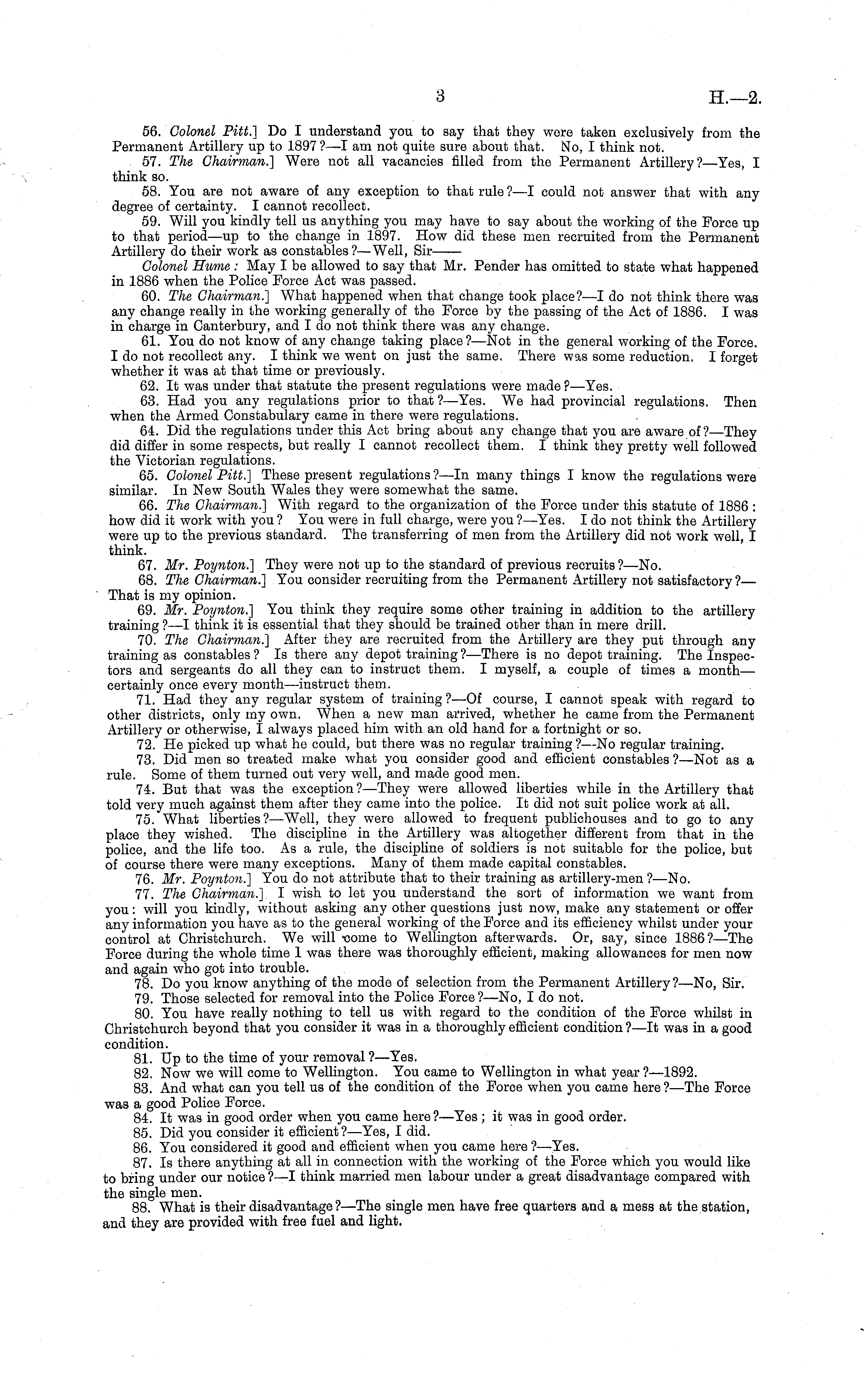56. Colonel Pitt.] Do I understand you to say that they wore taken exclusively from the Permanent Artillery up to 1897 ?—I am not quite sure about that. No, I think not. 57. The Chairman.] Were not all vacancies filled from the Permanent Artillery?— Yes, I think so. 58. You are not aware of any exception to that rule ? —I could not answer that with any degree of certainty. I cannot recollect. 59. Will you kindly tell us anything you may have to say about the working of the Force up to that period—up to the change in 1897. How did these men recruited from the Permanent Artillery do their work as constables?— Well, Sir Colonel Hume : May I be allowed to say that Mr. Pender has omitted to state what happened in 1886 when the Police Force Act was passed. 60. The Chairman.] What happened when that change took place?—l do not think there was any change really in the working generally of the Force by the passing of the Act of 1886. I was in charge in Canterbury, and I do not think there was any change. 61. You do not know of any change taking place?— Not in the general working of the Force. Ido not recollect any. I think we went on just the same. There was some reduction. I forget whether it was at that time or previously. 62. It was under that statute the present regulations were made ?—Yes. 63. Had you any regulations prior to that ?—Yes. We had provincial regulations. Then when the Armed Constabulary came in there were regulations. 64. Did the regulations under this Act bring about any change that you are aware of?— They did differ in some respects, but really I cannot recollect them. I think they pretty well followed the Victorian regulations. 65. Colonel Pitt.] These present regulations ? —ln many things I know the regulations were similar. In New South Wales they were somewhat the same. 66. The Chairman.] With regard to the organization of the Force under this statute of 1886 : how did it work with you ? You were in full charge, were you ?—Yes. Ido not think the Artillery were up to the previous standard. The transferring of men from the Artillery did not work well, I think. 67. Mr. Poynton.] They were not up to the standard of previous recruits ?—No. 68. The Chairman.] You consider recruiting from the Permanent Artillery not satisfactory ?— That is my opinion. 69. Mr. Poynton.] You think they require some other training in addition to the artillery training ? —I think it is essential that they should be trained other than in mere drill. 70. The Chairman.] After they are recruited from the Artillery are they put through any training as constables ? Is there any depot training ?—There is no depot training. The Inspectors and sergeants do all they can to instruct them. I myself, a couple of times a month— certainly once every month—instruct them. 71. Had they any regular system of training ?—Of course, I cannot speak with regard to other districts, only my own. When a new man arrived, whether he came from the Permanent Artillery or otherwise, I always placed him with an old hand for a fortnight or so. 72. He picked up what he could, but there was no regular training ? —No regular training. 73. Did men so treated make what you consider good and efficient constables ?—Not as a rule. Some of them turned out very well, and made good men. 74. But that was the exception ?—They were allowed liberties while in the Artillery that told very much against them after they came into the police. It did not suit police work at all. 75. What liberties? —Well, they were allowed to frequent publichouses and to go to any place they wished. The discipline in the Artillery was altogether different from that in the police, and the life too. As a rule, the discipline of soldiers is not suitable for the police, but of course there were many exceptions. Many of them made capital constables. 76. Mr. Poynton.] You do not attribute that to their training as artillery-men ? —No. 77. The Chairman.] I wish to let you understand the sort of information we want from you: will you kindly, without asking any other questions just now, make any statement or offer any information you have as to the general working of the Force and its efficiency whilst under your control at Christchurch. We will -come to Wellington afterwards. Or, say, since 1886?— The Force during the whole time 1 was there was thoroughly efficient, making allowances for men now and again who got into trouble. 78. Do you know anything of the mode of selection from the Permanent Artillery ?—No, Sir. 79. Those selected for removal into the Police Force ?—No, I do not. 80. You have really nothing to tell us with regard to the condition of the Force whilst in Christchurch beyond that you consider it was in a thoroughly efficient condition ?—lt was in a good condition. 81. Up to the time of your removal ?—Yes. 82. Now we will come to Wellington. You came to Wellington in what year ?—1892. 83. And what can you tell us of the condition of the Force when you came here ? —The Force was a good Police Force. 84. It was in good order when you came here?— Yes ; it was in good order. 85. Did you consider it efficient?— Yes, I did. 86. You considered it good and efficient when you came here ? —Yes. 87. Is there anything at all in connection with the working of the Force which you would like to bring under our notice ?—I think married men labour under a great disadvantage compared with the single men. 88. What is their disadvantage ?—The single men have free quarters and a mess at the station, and they are provided with free fuel and light.