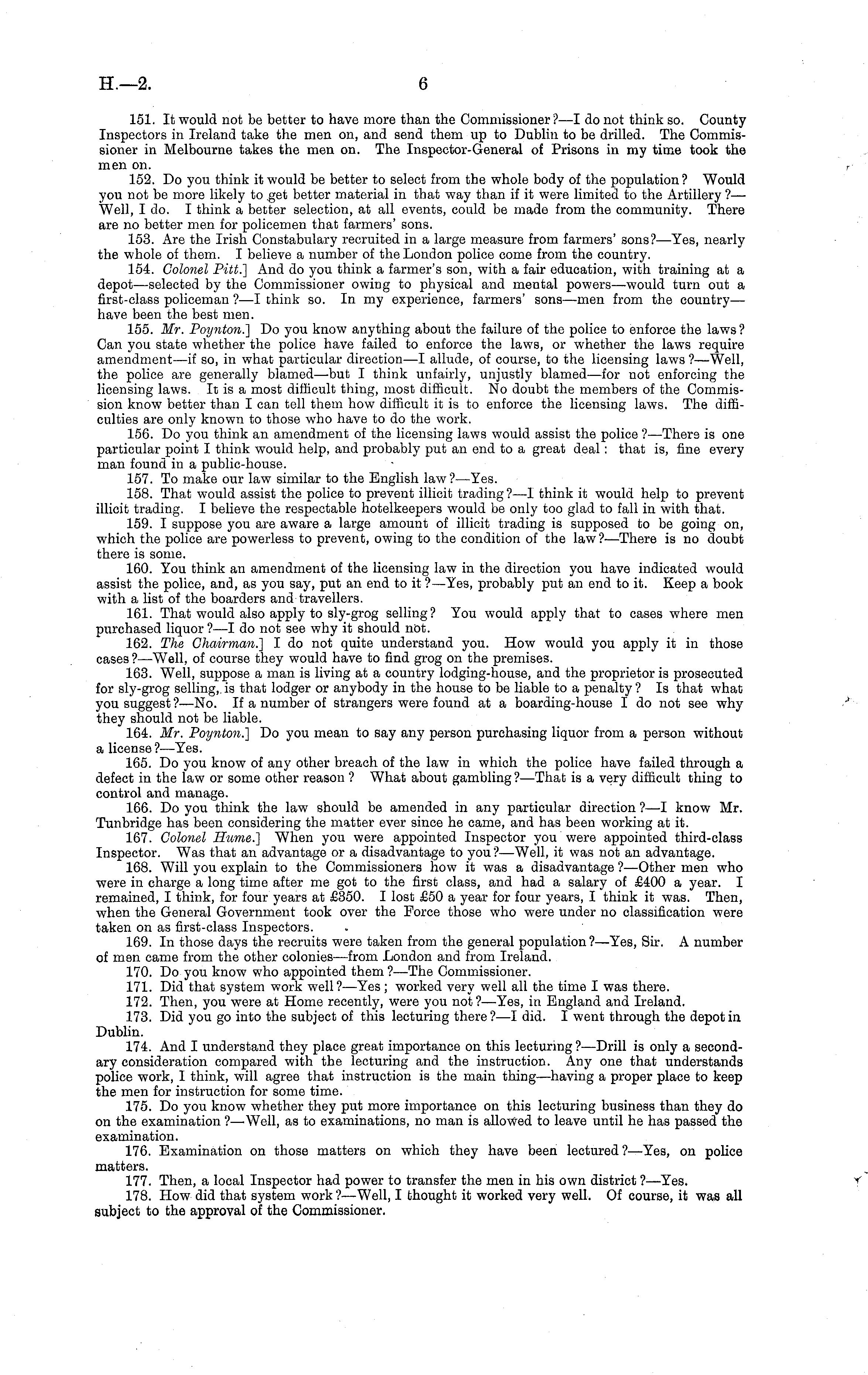 151. It would not be better to have more than the Commissioner?—l do not think so. County Inspectors in Ireland take the men on, and send them up to Dublin to be drilled. The Commissioner in Melbourne takes the men on. The Inspector-General of Prisons in my time took the men on. 152. Do you think it would be better to select from the whole body of the population? Would you not be more likely to .get better material in that way than if it were limited to the Artillery ?— Well, I do. I think a better selection, at all events, could be made from the community. There are no better men for policemen that farmers' sons. 153. Are the Irish Constabulary recruited in a large measure from farmers' sons? —Yes, nearly the whole of them. I believe a number of the London police come from the country. 154. Colonel Pitt.] And do you think a farmer's son, with a fair education, with training at a depot-—selected by the Commissioner owing to physical and mental powers—-would turn out a first-class policeman ?—I think so. In my experience, farmers' sons—men from the country— have been the best men. 155. Mr. Poynton.] Do you know anything about the failure of the police to enforce the laws? Can you state whether the police have failed to enforce the laws, or whether the laws require amendment—if so, in what particular direction—l allude, of course, to the licensing laws ?—Well, the police are generally blamed—but I think unfairly, unjustly blamed—for not enforcing the licensing laws. It is a most difficult thing, most difficult. No doubt the members of the Commission know better than I can tell them how difficult it is to enforce the licensing laws. The difficulties are only known to those who have to do the work. 156. Do you think an amendment of the licensing laws would assist the police ? —There is one particular point I think would help, and probably put an end to a great deal: that is, fine every man found in a public-house. 157. To make our law similar to the English law? —Yes. 158. That would assist the police to prevent illicit trading?—l think it would help to prevent illicit trading. I believe the respectable hotelkeepers would be only too glad to fall in with that. 159. I suppose you are aware a large amount of illicit trading is supposed to be going on, which the police are powerless to prevent, owing to the condition of the law ?—There is no doubt there is some. 160. You think an amendment of the licensing law in the direction you have indicated would assist the police, and, as you say, put an end to it ?—Yes, probably put an end to it. Keep a book with a list of the boarders and travellers. 161. That would also apply to sly-grog selling? You would apply that to cases where men purchased liquor ?—I do not see why it should not. 162. The Chairman.] I do not quite understand you. How would you apply it in those cases ?—Well, of course they would have to find grog on the premises. 163. Well, suppose a man is living at a country lodging-house, and the proprietor is prosecuted for sly-grog selling,, is that lodger or anybody in the house to be liable to a penalty ? Is that what you suggest ?—No. If a number of strangers were found at a boarding-house I do not see why they should not be liable. 164. Mr. Poynton.] Do you mean to say any person purchasing liquor from a person without a license ?—Yes. 165. Do you know of any other breach of the law in which the police have failed through a defect in the law or some other reason ? What about gambling ?—That is a very difficult thing to control and manage. 166. Do you think the law should be amended in any particular direction ?—I know Mr. Tunbridge has been considering the matter ever since he came, and has been working at it. 167. Colonel Hume.] When you were appointed Inspector you were appointed third-class Inspector. Was that an advantage or a disadvantage to you ?—Well, it was not an advantage. 168. Will you explain to the Commissioners how it was a disadvantage ? —Other men who were in charge a long time after me got to the first class, and had a salary of £400 a year. I remained, I think, for four years at £350. I lost £50 a year for four years, I think it was. Then, when the General Government took over the Force those who were under no classification were taken on as first-class Inspectors. 169. In those days the recruits were taken from the general population?— Yes, Sir. A number of men came from the other colonies—from London and from Ireland. 170. Do you know who appointed them ? —The Commissioner. 171. Did that system work well?— Yes ; worked very well all the time I was there. 172. Then, you were at Home recently, were you not ?—Yes, in England and Ireland. 173. Did you go into the subject of this lecturing there?—l did. I went through the depot in Dublin. 174. And I understand they place great importance on this lecturing ?■—Drill is only a secondary consideration compared with the lecturing and the instruction. Any one that understands police work, I think, will agree that instruction is the main thing—having a proper place to keep the men for instruction for some time. 175. Do you know whether they put more importance on this lecturing business than they do on the examination ?—Well, as to examinations, no man is allowed to leave until he has passed the examination. 176. Examination on those matters on which they have been lectured?— Yes, on police matters. 177. Then, a local Inspector had power to transfer the men in his own district ?—Yes. 178. How did that system work ?—Well, I thought it worked very well. Of course, it was all subject to the approval of the Commissioner.