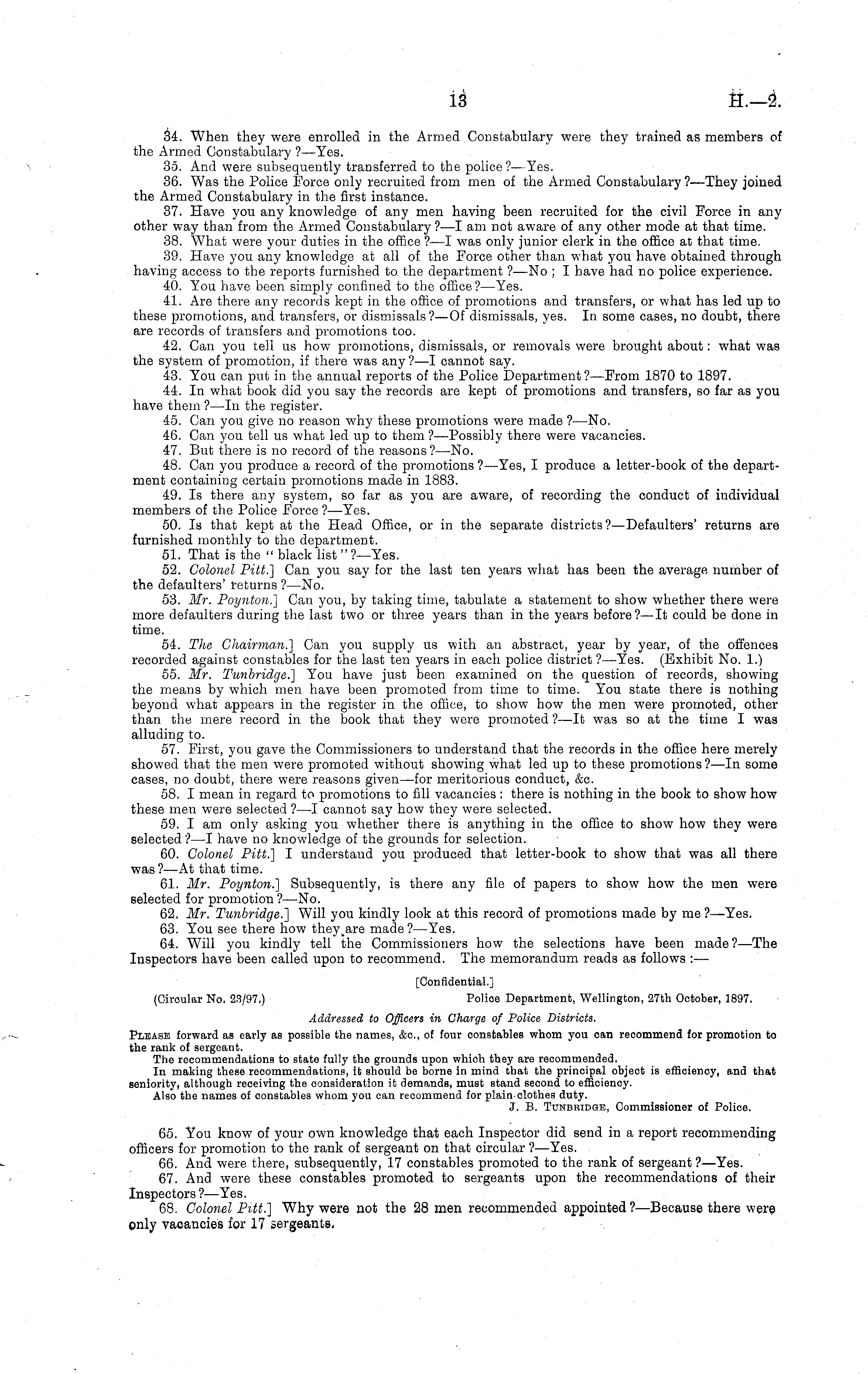 34. When they were enrolled in the Armed Constabulary were they trained as members of the Armed Constabulary ?—Yes. 35. And were subsequently transferred to the police?— Yes. 36. Was the Police Force only recruited from men of the Armed Constabulary ?—They joined the Armed Constabulary in the first instance. 37. Have you any knowledge of any men having been recruited for the civil Force in any other way than from the Armed Constabulary ?—I am not aware of any other mode at that time. 38. What were your duties in the office ?—I was only junior clerk in the office at that time. 39. Have you any knowledge at all of the Force other than what you have obtained through having access to the reports furnished to the department ?—No ; I have had no police experience. 40. You have been simply confined to the office? —Yes. 41. Are there any records kept in the office of promotions and transfers, or what has led up to these promotions, and transfers, or dismissals?—Of dismissals, yes. In some cases, no doubt, there are records of transfers and promotions too. 42. Can you tell us how promotions, dismissals, or removals were brought about: what was the system of promotion, if there was any ?—I cannot say. 43. You can put in the annual reports of the Police Department? —From 1870 to 1897. 44. In what book did you say the records are kept of promotions and transfers, so far as you have them ?—ln the register. 45. Can you give no reason why these promotions were made ? —No. 46. Can you tell us what led up to them ? —Possibly there were vacancies. 47. But there is no record of the reasons? —No. 48. Can you produce a record of the promotions ? —Yes, I produce a letter-book of the department containing certain promotions made in 1883. 49. Is there any system, so far as you are aware, of recording the conduct of individual members of the Police Force ? —Yes. 50. Is that kept at the Head Office, or in the separate districts?— Defaulters' returns are furnished monthly to the department. 51. That is the " black list " ?—Yes. 52. Colonel Pitt.] Can you say for the last ten years what has been the average number of the defaulters' returns ? —No. 53. Mr. Poynton.] Can you, by taking time, tabulate a statement to show whether there were more defaulters during the last two or three years than in the years before?—lt could be done in time. 54. The Chairman.] Can you supply us with an abstract, year by year, of the offences recorded against constables for the last ten years in each police district ?—Yes. (Exhibit No. 1.) 55. Mr. Tunbridge.] You have just been examined on the question of records, showing the means by which men have been promoted from time to time. You state there is nothing beyond what appears in the register in the office, to show how the men were promoted, other than the mere record in the book that they were promoted ?—lt was so at the time I was alluding to. 57. First, you gave the Commissioners to understand that the records in the office here merely showed that the men were promoted without showing what led up to these promotions ? —ln some cases, no doubt, there were reasons given—for meritorious conduct, &c. 58. I mean in regard to promotions to fill vacancies : there is nothing in the book to show how these men were selected ?—I cannot say how they were selected. 59. I am only asking you whether there is anything in the office to show how they were selected?—l have no knowledge of the grounds for selection. 60. Colonel Pitt.] I understand you produced that letter-book to show that was all there was ?—At that time. 61. Mr. Poynton.] Subsequently, is there any file of papers to show how the men were selected for promotion ? —No. 62. Mr. Tunbridge.'] Will you kindly look at this record of promotions made by me ?—Yes. 63. You see there how made ?—Yes. 64. Will you kindly tell the Commissioners how the selections have been made?— The Inspectors have been called upon to recommend. The memorandum reads as follows : — [Confidential.] (Giroular No. 23/97.) Police Department, Wellington, 27th October, 1897. Addressed to Officers in Charge of Police Districts. Please forward as early as possible the names, &c, of four constables whom you can recommend for promotion to the rank of sergeant. The recommendations to state fully the grounds upon which they are recommended. In making these recommendations, it should be borne in mind that the principal object is efficiency, and that seniority, although receiving the consideration it demands, must stand second to efficiency. Also the names of constables whom you can recommend for plain clothes duty. J. B. Tunbridge, Commissioner of Police. 65. You know of your own knowledge that each Inspector did send in a report recommending officers for promotion to the rank of sergeant on that circular ? —Yes. 66. And were there, subsequently, 17 constables promoted to the rank of sergeant ?—Yes. 67. And were these constables promoted to sergeants upon the recommendations of their Inspectors ? —Yes. 68. Colonel Pitt.] Why were not the 28 men recommended appointed?— Because there were only vacancies for 17 sergeants,
