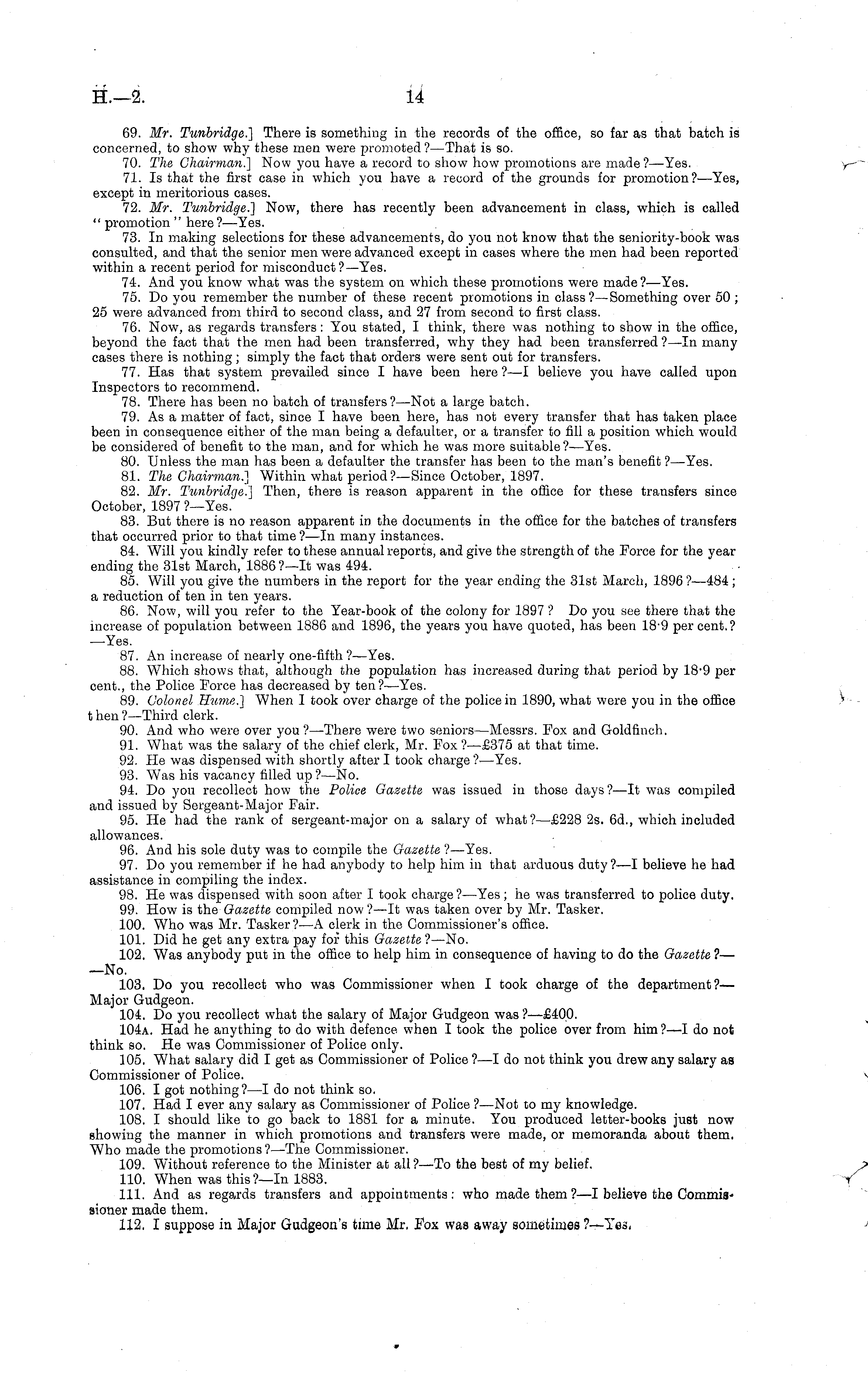 69. Mr. Tunbridge.] There is something in the records of the office, so far as that batch is concerned, to show why these men were promoted ? —That is so. 70. The Chairman.] Now you have a record to show how promotions are made? —Yes. 71. Is that the first case in which you have a record of the grounds for promotion?— Yes, except in meritorious cases. 72. Mr. Tunbridge.] Now, there has recently been advancement in class, which is called " promotion " here ?—Yes. 73. In making selections for these advancements, do you not know that the seniority-book was consulted, and that the senior men were advanced except in cases where the men had been reported within a recent period for misconduct?— Yes. 74. And you know what was the system on which these promotions were made ?—Yes. 75. Do you remember the number of these recent promotions in class?— Something over 50 ; 25 were advanced from third to second class, and 27 from second to first class. 76. Now, as regards transfers: You stated, I think, there was nothing to show in the office, beyond the fact that the men had been transferred, why they had been transferred ?—ln many cases there is nothing; simply the fact that orders were sent out for transfers. 77. Has that system prevailed since I have been here ?—I believe you have called upon Inspectors to recommend. 78. There has been no batch of transfers?— Not a large batch. 79. As a matter of fact, since I have been here, has not every transfer that has taken place been in consequence either of the man being a defaulter, or a transfer to fill a position which would be considered of benefit to the man, and for which he was more suitable ?—Yes. 80. Unless the man has been a defaulter the transfer has been to the man's benefit ? —Yes. 81. The Chairman.] Within what period ?—Since October, 1897. 82. Mr. Tunbridge.] Then, there is reason apparent in the office for these transfers since October, 1897 ?—Yes. 83. But there is no reason apparent in the documents in the office for the batches of transfers that occurred prior to that time ? —ln many instances. 84. Will you kindly refer to these annual reports, and give the strength of the Force for the year ending the 31st March, 1886?— It was 494. 85. Will you give the numbers in the report for the year ending the 31st March, 1896 ?—484; a reduction of ten in ten years. 86. Now, will you refer to the Year-book of the colony for 1897 ? Do you see there that the increase of population between 1886 and 1896, the years you have quoted, has been 189 per cent.? —Yes. 87. An increase of nearly one-fifth ?—Yes. 88. Which shows that, although the population has increased during that period by 18 - 9 per cent., the Police Force has decreased by ten?—-Yes. 89. Colonel Hume.] When I took over charge of the police in 1890, what were you in the office t hen ?—Third clerk. 90. And who were over you ?—There were two seniors—Messrs. Fox and Goldfinch. 91. What was the salary of the chief clerk, Mr. Fox ?—£375 at that time. 92. He was dispensed with shortly after I took charge ?—Yes. 93. Was his vacancy filled up ?—No. 94. Do you recollect how the Police Gazette was issued in those days?—lt was compiled and issued by Sergeant-Major Fair. 95. He had the rank of sergeant-major on a salary of what? —£228 2s. 6d., which included allowances. 96. And his sole duty was to compile the Gazette ? —Yes. 97. Do you remember if he had anybody to help him in that arduous duty?—l believe he had assistance in compiling the index. 98. He was dispensed with soon after I took charge ? —Yes ; he was transferred to police duty. 99. How is the Gazette compiled now ?—lt was taken over by Mr. Tasker. 100. Who was Mr. Tasker? —A clerk in the Commissioner's office. 101. Did he get any extra pay for this Gazette? — No. 102. Was anybody put in the office to help him in consequence of having to do the Gazette ?— —No. 103. Do you recollect who was Commissioner when I took charge of the department?— Major Gudgeon. 104. Do you recollect what the salary of Major Gudgeon was ? —£4oo. 104 a. Had he anything to do with defence when I took the police over from him ?—I do not think so. He was Commissioner of Police only. 105. What salary did I get as Commissioner of Police ? —I do not think you drew any salary as Commissioner of Police. 106. I got nothing?—l do not think so. 107. Had I ever any salary as Commissioner of Police ?—Not to my knowledge. 108. I should like to go back to 1881 for a minute. You produced letter-books just now showing the manner in which promotions and transfers were made, or memoranda about them. Who made the promotions ?—The Commissioner. 109. Without reference to the Minister at all ?—-To the best of my belief. 110. When was this ?—ln 1883. 111. And as regards transfers and appointments: who made them ?—I believe the Commissioner made them. 112. I suppose in Major Gudgeon's time Mr. Fox was away sometimes ?—Yes,