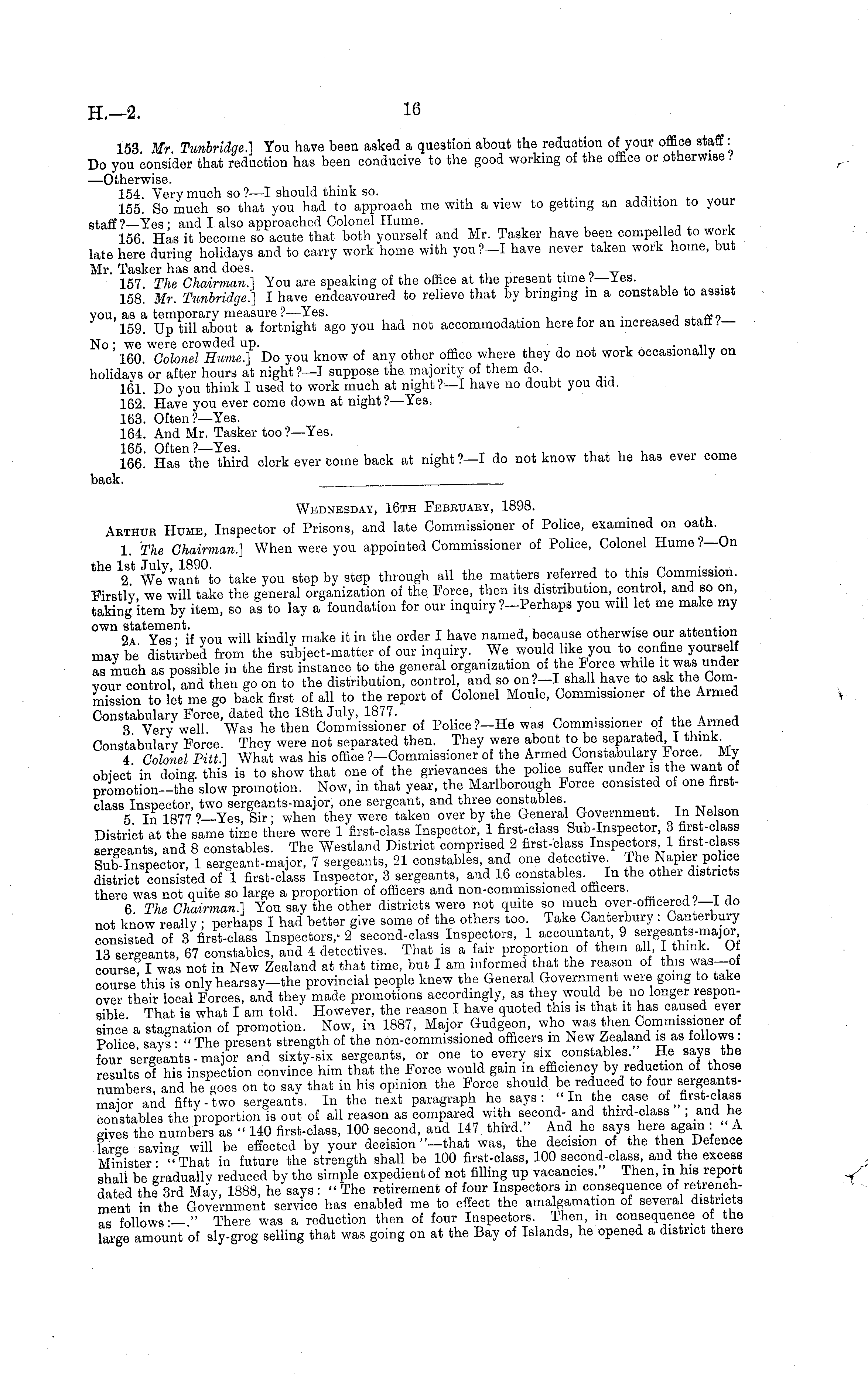 Wednesday, 16th Febbuaey, 1898. Aethub Hume, Inspector of Prisons, and late Commissioner of Police, examined on oath. 1. The Chairman.} When were you appointed Commissioner of Police, Colonel Hume ?—On * We y want°to take you step by step through all the matters referred to this Commission. Firstly we will take the general organization of the Force, then its distribution, control, and so on, taking item by item, so as to lay a foundation for our inquiry ?—Perhaps you will let me make my own s a emen kindly make it in the order I have named, because otherwise our attention may be disturbed from the subject-matter of our inquiry. We would like you to confine yourself as much as possible in the first instance to the general organization of the Force while it was under your control, and then go on to the distribution, control and so on ?-I shall have to the Commission to let me go back first of all to the report of Colonel Moule, Commissioner of the Armed ConS 3 ab Very y w ? e o ll Ce 'Wa t s c he then Commissioner of Police ?—Hβ was Commissioner of the Armed Constabulary Force. They were not separated then. They were about to be separated, I think 4 Colonel Pitt.} What was his office ?—Commissioner of the Armed Constabulary Force. My obiect in doing, this is to show that one of the grievances the police suffer under is the want of promotion—thl slow promotion. Now, in that year, the Marlborough Force consisted of one firstclass Inspector, two sergeants-major, one sergeant, and three constables sln 1877?— Yes Sir- when they were taken over by the General Government. In Nelson District at the same time there were 1 first-class Inspector, 1 first-class Sub-Inspector, 3 first-class servants, and 8 constables. The Westland District comprised 2 first-class Inspectors 1 first-class Sub-Inspector, 1 sergeant-major, 7 sergeants, 21 constables, and one The Napier police district consisted of 1 first-class Inspector, 3 sergeants, and 16 constables In the other districts there was not quite so large a proportion of officers and non-commissioned officers. 6 The Chairman.} You say the other districts were not quite so much over-officered l—L do not know really ; perhaps I had better give some of the others too. Take Canterbury : Canterbury consisted of 3 first-class Inspectors,- 2 second-class Inspectors, 1 accountant, 9 sergeants-major 13 sergeants, 67 constables, and 4 detectives. That is a fair proportion of them all I think. Ut course" I was not in New Zealand at that time, but I am informed that the reason of this was—of oourse'this is only hearsay-the provincial people knew the General Government were going to take over their local Forces, and they made promotions accordingly, as they would be_ no longer responsible That is what lam told. However, the reason I have quoted this is that it has caused ever since a stagnation of promotion. Now, in 1887, Major Gudgeon, who was then Commissioner of Police says : " The present strength of the non-commissioned officers in New Zealand is as follows . four sergeants-major and sixty-six sergeants, or one to every six constables He says the results of his inspection convince him that the Force would gam in efficiency by reduction of those numbers, and he goes on to say that in his opinion the Force should be reduced to four sergeantsmajor and fifty-two sergeants. In the next paragraph he says : ''In the case of _first-class constables the proportion is out of all reason as compared with second- and third-class ; and he rives the numbers as " 140 first-class, 100 second, and 147 third." And he says here again : A saving will be effected by your decision "-that was, the decision of the then Defence Minister- ' ? That in future the strength shall be 100 first-class, 100 second-class, and the excess shall be gradually reduced by the simple expedient of not filling up vacancies." Then, in his report dated the 3rd May, 1888, he says : " The retirement of four Inspectors in consequence of retrenchment in the Government service has enabled me to effect the amalgamation of several districts as follows •— " There was a reduction then of four Inspectors. Then, in consequence of the large amount of sly-grog selling that was going on at the Bay of Islands, he opened a district there
