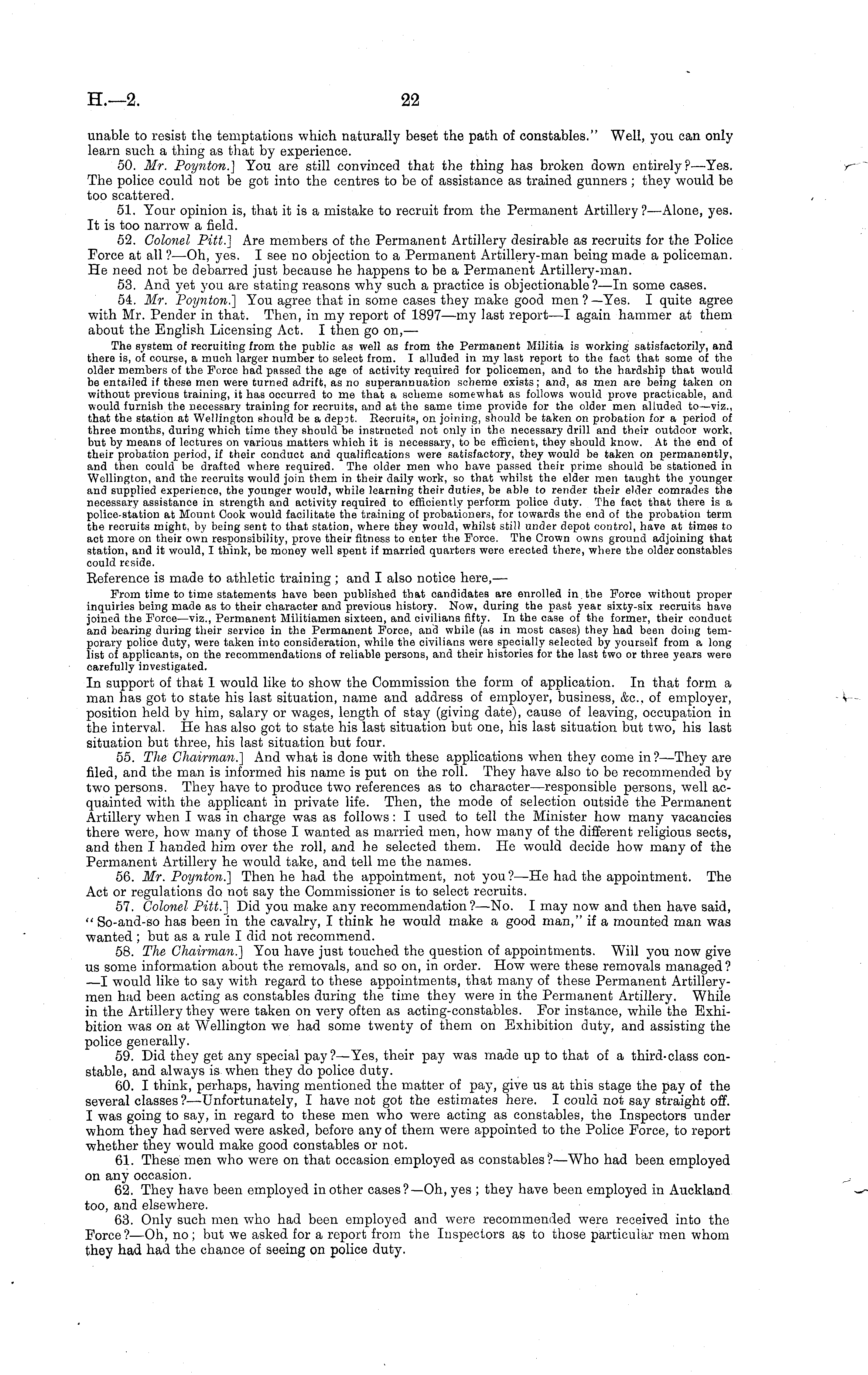 unable to resist the temptations which naturally beset the path of constables." Well, you can only learn such a thing as that by experience. 50. Mr. Poynton.) You are still convinced that the thing has broken down entirely?— Yes. The police could not be got into the centres to be of assistance as trained gunners ; they would be too scattered. 51. Your opinion is, that it is a mistake to recruit from the Permanent Artillery? —Alone, yes. It is too narrow a field. 52. Colonel Pitt.} Are members of the Permanent Artillery desirable as recruits for the Police Force at all ? —Oh, yes. I see no objection to a Permanent Artillery-man being made a policeman. He need not be debarred just because he happens to be a Permanent Artillery-man. 53. And yet you are stating reasons why such a practice is objectionable?—ln some cases. 54. Mr. Poynton.'] You agree that in some cases they make good men?— Yes. I quite agree with Mr. Pender in that. Then, in my report of 1897 —my last report—l again hammer at them about the English Licensing Act. I then go on, — The system of recruiting from the public as well as from the Permanent Militia is working satisfactorily, and there is, of course, a much larger number to select from. I alluded in my last report to the fact that some of the older members of the Force had passed the age of activity required for policemen, and to the hardship that would be entailed if these men were turned adrift, as no superannuation scheme exists; and, as men are being taken on without previous training, it has occurred to me that a scheme somewhat as follows would prove practicable, and would furnish the necessary training for recruits, and at the same time provide for the older men alluded to—viz., that the station at Wellington should be a depot. Recruits, on joining, should be taken on probation for a period of three months, during which time they should be instructed not only in the necessary drill and their outdoor work, but by means of lectures on various matters which it is necessary, to be efficient, they should know. At the end of their probation period, if their conduct and qualifications were satisfactory, they would be taken on permanently, and then could be drafted where required. The older men who have passed their prime should be stationed in Wellington, and the recruits would join them in their daily work, so that whilst the elder men taught the younger and supplied experience, the younger would, while learning their duties, be able to render their elder comrades the necessary assistance in strength and activity required to efficiently perform police duty. The fact that there is a police-station at Mount Cook would facilitate the training of probationers, for towards the end of the probation term the recruits might, by being sent to that station, where they would, whilst still under depot control, have at times to act more on their own responsibility, prove their fitness to enter the Force. The Crown owns ground adjoining that station, and it would, I think, be money well spent if married quarters were erected there, where the older constables could reside. Reference is made to athletic training ; and I also notice here, — From time to time statements have been published that candidates are enrolled in the Force without proper inquiries being made as to their character and previous history. Now, during the past year sixty-six recruits have joined the Force—viz., Permanent Militiamen sixteen, and civilians fifty. In the case of the former, their conduct and bearing during their service in the Permanent Force, and while (as in most cases) they had been doing temporary police duty, were taken into consideration, while the civilians were specially selected by yourself from a long list of applicants, on the recommendations of reliable persons, and their histories for the last two or three years were carefully investigated. In support of that 1 would like to show the Commission the form of application. In that form a man has got to state his last situation, name and address of employer, business, &c. of employer, position held by him, salary or wages, length of stay (giving date), cause of leaving, occupation in the interval. He has also got to state his last situation but one, his last situation but two, his last situation but three, his last situation but four. 55. The Chairman.'] And what is done with these applications when they come in?— They are filed, and the man is informed his name is put on the roll. They have also to be recommended by two persons. They have to produce two references as to character —responsible persons, well acquainted with the applicant in private life. Then, the mode of selection outside the Permanent Artillery when I was in charge was as follows: I used to tell the Minister how many vacancies there were, how many of those I wanted as married men, how many of the different religious sects, and then I handed him over the roll, and he selected them. He would decide how many of the Permanent Artillery he would take, and tell me the names. 56. Mr. Poynton.'] Then he had the appointment, not you?—He had the appointment. The Act or regulations do not say the Commissioner is to select recruits. 57. Colonel Pitt.'] Did you make any recommendation? —No. I may now and then have said, " So-and-so has been in the cavalry, I think he would make a good man," if a mounted man was wanted ; but as a rule I did not recommend. 58. The Chairman.] You have just touched the question of appointments. Will you now give us some information about the removals, and so on, in order. How were these removals managed ? —I would like to say with regard to these appointments, that many of these Permanent Artillerymen had been acting as constables during the time they were in the Permanent Artillery. While in the Artillery they were taken on very often as acting-constables. For instance, while the Exhibition was on at Wellington we had some twen