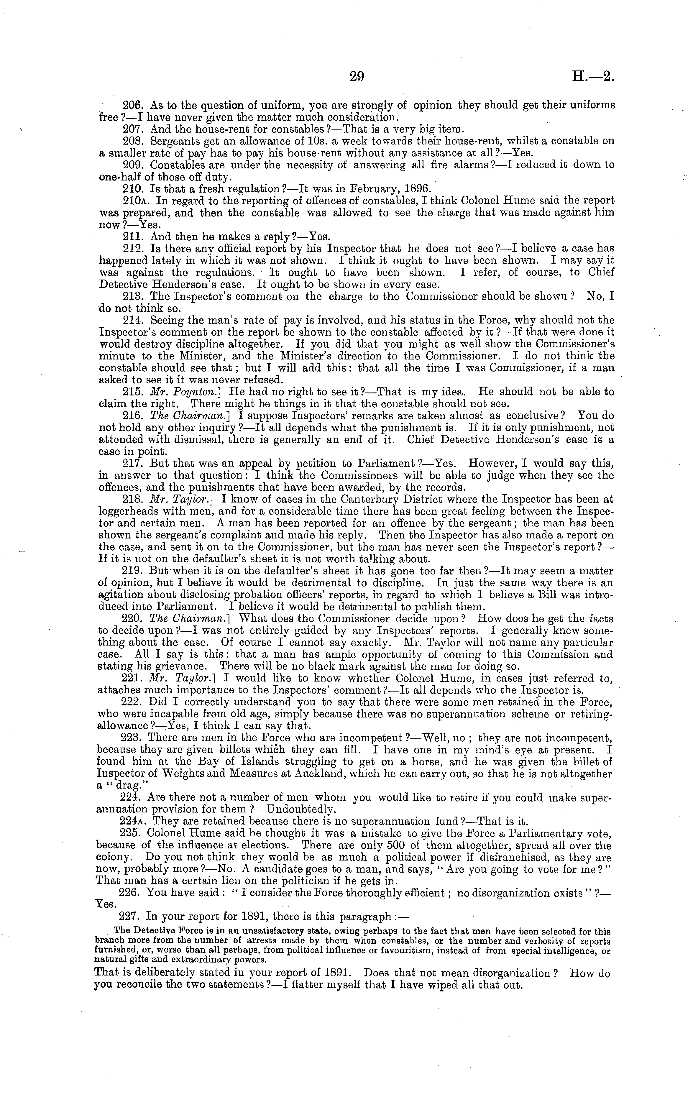 206. As to the question of uniform, you are strongly of opinion they should get their uniforms free ?—I have never given the matter much consideration. 207. And the house-rent for constables?— That is a very big item. 208. Sergeants get an allowance of 10s. a week towards their house-rent, whilst a constable on a smaller rate of pay has to pay his house-rent without any assistance at all? —Yes. 209. Constables are under the necessity of answering all fire alarms ? —I reduced it down to one-half of those off duty. 210. Is that a fresh regulation ?—lt was in February, 1896. 210 a. In regard to the reporting of offences of constables, I think Colonel Hume said the report was prepared, and then the constable was allowed to see the charge that was made against him now ?—Yes. 211. And then he makes a reply?— Yes. 212. Is there any official report by his Inspector that he does not see ? —I believe a case has happened lately in which it was not shown. I think it ought to have been shown. I may say it was against the regulations. It ought to have been shown. I refer, of course, to Chief Detective Henderson's case. It ought to be shown in every case. 213. The Inspector's comment on the charge to the Commissioner should be shown ?—No, I do not think so. 214. Seeing the man's rate of pay is involved, and his status in the Force, why should not the Inspector's comment on the report be shown to the constable affected by it ? —lf that were done it would destroy discipline altogether. If you did that you might as well show the Commissioner's minute to the Minister, and the Minister's direction to the Commissioner. I do not think the constable should see that; but I will add this: that all the time I was Commissioner, if a man asked to see it it was never refused. 215. Mr. Poynton.] He had no right to see it ?—That is my idea. He should not be able to claim the right. There might be things in it that the constable should not see. 216. The Chairman.] I suppose Inspectors' remarks are taken almost as conclusive? You do not hold any other inquiry ?■ —It all depends what the punishment is. If it is only punishment, not attended with dismissal, there is generally an end of it. Chief Detective Henderson's case is a case in point. 217. But that was an appeal by petition to Parliament ?—Yes. However, I would say this, in answer to that question: I think the Commissioners will be able to judge when they see the offences, and the punishments that have been awarded, by the records. 218. Mr. Taylor.] I know of cases in the Canterbury District where the Inspector has been at loggerheads with men, and for a considerable time there has been great feeling between the Inspector and certain men. A man has been reported for an offence by the sergeant; the man has been shown the sergeant's complaint and made his reply. Then the Inspector has also made a report on the case, and sent it on to the Commissioner, but the man has never seen the Inspector's report ?—■ If it is not on the defaulter's sheet it is not worth talking about. 219. But when it is on the defaulter's sheet it has gone too far then?—lt may seem a matter of opinion, but I believe it would be detrimental to discipline. In just the same way there is an agitation about disclosing probation officers' reports, in regard to which I believe a Bill was introduced into Parliament. I believe it would be detrimental to publish them. 220. The Chairman.] What does the Commissioner decide upon ? How does he get the facts to decide upon ? —I was not entirely guided by any Inspectors' reports. I generally knew something about the case. Of course I cannot say exactly. Mr. Taylor will not name any particular case. All I say is this: that a man has ample opportunity of coming to this Commission and stating his grievance. There will be no black mark against the man for doing so. 221. Mr. Taylor.] I would like to know whether Colonel Hume, in cases just referred to, attaches much importance to the Inspectors' comment? —It all depends who the Inspector is. 222. Did I correctly understand you to say that there were some men retained in the Force, who were incapable from old age, simply because there was no superannuation scheme or retiringallowance ?—Yes, I think I can say that. 223. There are men in the Force who are incompetent ?—Well, no ; they are not incompetent, because they are given billets which they can fill. I have one in my mind's eye at present. I found him at the Bay of Islands struggling to get on a horse, and he was given the billet of Inspector of Weights and Measures at Auckland, which he can carry out, so that he is not altogether a " drag." 224. Are there not a number of men whom you would like to retire if you could make superannuation provision for them ? —Undoubtedly. 224 a. They are retained because there is no superannuation fund ? —That is it. 225. Colonel Hume said he thought it was a mistake to give the Force a Parliamentary vote, because of the influence at elections. There are only 500 of them altogether, spread all over the colony. Do you not think they would be as much a political power if disfranchised, as they are now, probably more ?—No. A candidate goes to a man, and says, " Are you going to vote for me ? " That man has a certain lien on the politician if he gets in. 226. You have said :" I consider the Force thoroughly efficient; no disorganization exists "?— Yes. 227. In your report for 1891, there is this paragraph :— The Detective Force is in an unsatisfactory state, owing perhaps to the fact that men have been selected for this branch more from the number of arrests made by them when constables, or the number and verbosity of reports furnished, or, worse than all perhaps, from political influence or favouritism, instead of from special intelligence, or natural gifts and extraordinary powers. That is deliberately stated in your report of 1891. Does that not mean disorganization ? How do you 