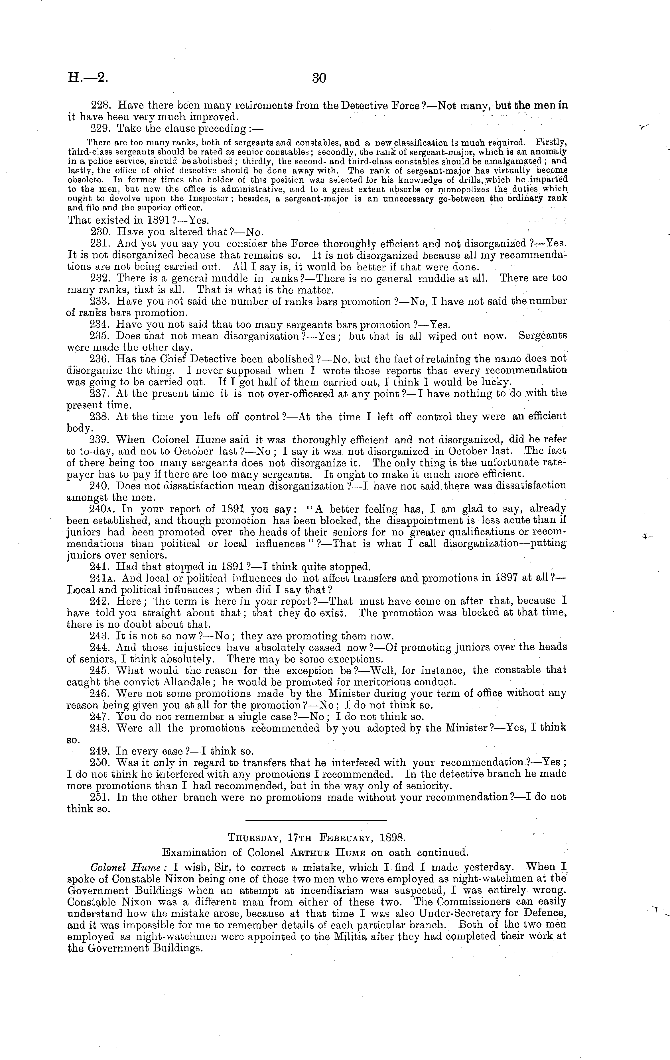 Thuksday, 17th Febeuaby, 1898. Examination of Colonel Aethue Hume on oath continued. Colonel Hume: I wish, Sir, to correct a mistake, which I find I made yesterday. When I spoke of Constable Nixon being one of those two men who were employed as night-watchmen at the Government Buildings when an attempt at incendiarism was suspected, I was entirely wrong. Constable Nixon was a different man from either of these two. The Commissioners can easily understand how the mistake arose, because at that time I was also Under-Secretary for Defence, and it was impossible for me to remember details of each particular branch. Both of the two men employed as night-watchmen were appointed to the Militia after they had completed their work at the Government Buildings.