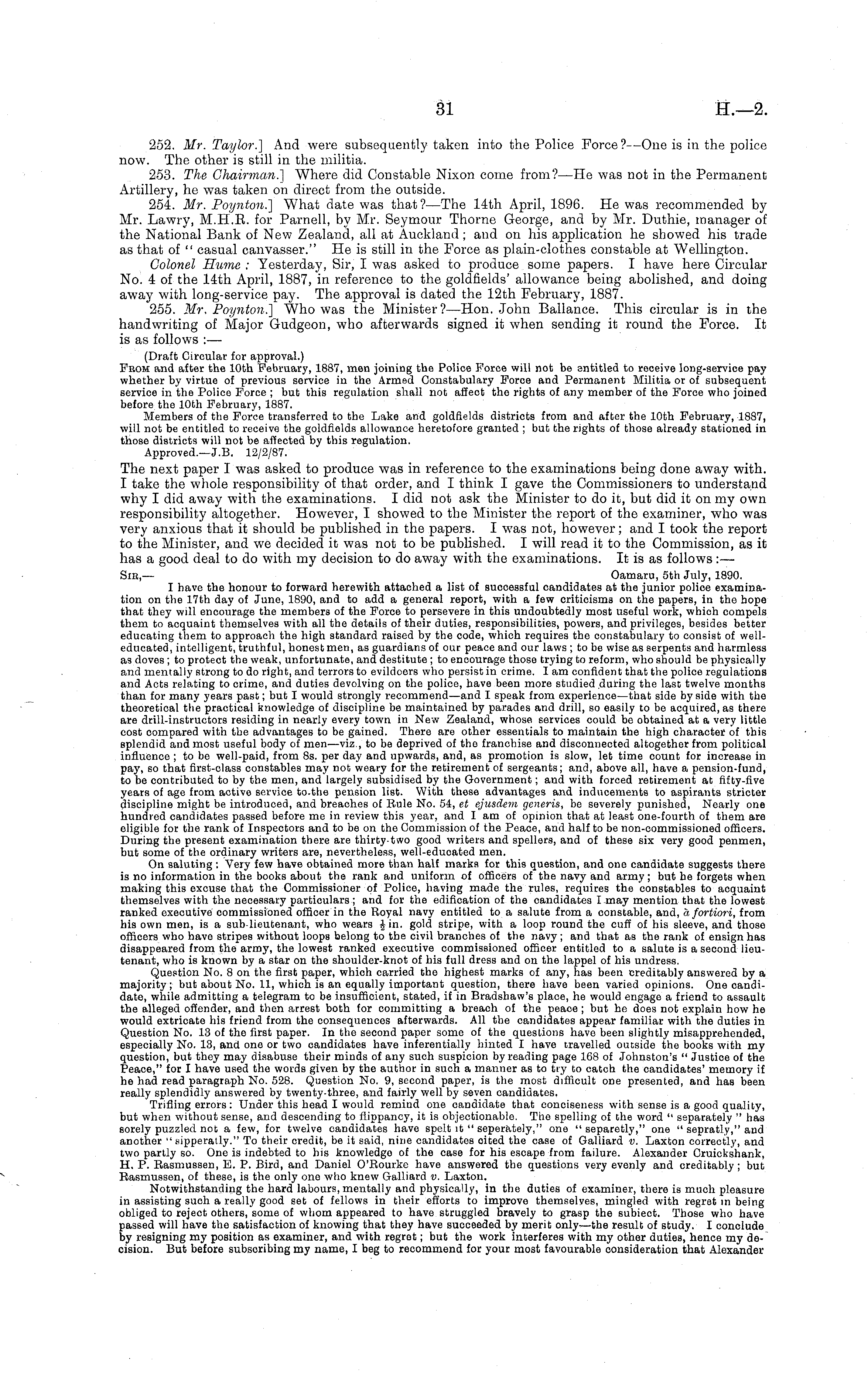 252. Mr. Taylor.] And were subsequently taken into the Police Force ?—One is in the police now. The other is still in the militia. 253. The Chairman.] Where did Constable Nixon come from?—He was not in the Permanent Artillery, he was taken on direct from the outside. 254. Mr. Poynton.] What date was that?— The 14th April, 1896. He was recommended by Mr. Lawry, M.H.E. for Parnell, by Mr. Seymour Thorne George, and by Mr. Duthie, manager of the National Bank of New Zealand, all at Auckland; and on his application he showed his trade as that of " casual canvasser." He is still in the Force as plain-clothes constable at Wellington. Colonel Hume : Yesterday, Sir, I was asked to produce some papers. I have here Circular No. 4 of the 14th April, 1887, in reference to the goldfields' allowance being abolished, and doing away with long-service pay. The approval is dated the 12th February, 1887. 255. Mr. Poynton.] Who was the Minister?— Hon. John Ballance. This circular is in the handwriting of Major Gudgeon, who afterwards signed it when sending it round the Force. It is as follows :— (Draft Circular for approval.) Fkom and after the 10th February, 1887, men joining the Police Force will not be entitled to receive long-service pay whether by virtue of previous service in the Armed Constabulary Force and Permanent Militia or of subsequent service in the Police Force ; but this regulation shall not affect the rights of any member of the Force who joined before the 10th February, 1887. Members of the Force transferred to the Lake and goldfields districts from and after the 10th February, 1887, will not be entitled to receive the goldfields allowance heretofore granted ; but the rights of those already stationed in those districts will not be affected by this regulation. Approved.—J.B. 12/2/87. The next paper I was asked to produce was in reference to the examinations being done away with. I take the whole responsibility of that order, and I think I gave the Commissioners to understand why I did away with the examinations. I did not ask the Minister to do it, but did it on my own responsibility altogether. However, I showed to the Minister the report of the examiner, who was very anxious that it should be published in the papers. I was not, however; and I took the report to the Minister, and we decided it was not to be published. I will read it to the Commission, as it has a good deal to do with my decision to do away with the examinations. It is as follows :— Sib,— Oamaru, sth July, 1890. I have the honour to forward herewith attached a list of successful candidates at the junior police examination on the 17th day of June, 1890, and to add a general report, with a few criticisms on the papers, in the hope that they will encourage the members of the Force to persevere in this undoubtedly most useful work, which compels them to acquaint themselves with all the details of their duties, responsibilities, powers, and privileges, besides better educating them to approach the high standard raised by the code, which requires the constabulary to consist of welleducated, intelligent, truthful, honest men, as guardians of our peace and our laws ; to be wise as serpents and harmless as doves ; to protect the weak, unfortunate, and destitute ; to encourage those trying to reform, who should be physically and mentally strong to do right, and terrors to evildoers who persist in crime. I am confident that the police regulations and Acts relating to crime, and duties devolving on the police, have been more studied during the last twelve months than for many years past; but I would strongly recommend—and I speak from experience—that side by side with the theoretical the practical knowledge of discipline be maintained by parades and drill, so easily to be acquired, as there are drill-instructors residing in nearly every town in New Zealand, whose services could be obtained at a very little cost compared with the advantages to be gained. There are other essentials to maintain the high character of this splendid and most useful body of men—viz., to be deprived of the franchise and disconnected altogether from political influence ; to be well-paid, from Bs. per day and upwards, and, as promotion is slow, let time count for increase in pay, so that first-class constables may not weary for the retirement of sergeants; and, above all, have a pension-fund, to be contributed to by the men, and largely subsidised by the Government; and with forced retirement at fifty-five years of age from active service to.the pension list. With these advantages and inducements to aspirants stricter discipline might be introduced, and breaches of Rule No. 54, et ejusdem generis, be severely punished. Nearly one hundred candidates passed before me in review this year, and I am of opinion that at least one-fourth of them are eligible for the rank of Inspectors and to be on the Commission of the Peace, and half to be non-commissioned officers. During the present examination there are thirty-two good writers and spellers, and of these six very good penmen, but some of the ordinary writers are, nevertheless, well-educated men. On saluting : Very few have obtained more than half marks for this question, and one candidate suggests there is no information in the books about the rank and uniform of officers of the navy and army; but he forgets when making this excuse that the Commissioner of Police, having made the rules, requires the constables to acquaint themselves with the necessary particulars ; and for the edification of the candidates I may mention that the lowest ranked executive commissioned officer in the Royal navy entitled to a salute from a constable, and, a fortiori, from his own men, is a sub-lieutenant, who wears Jin. gold stripe, with a loop round the cuff of his sleeve, and those officers who have stripes without loops belong to the civil branches of the navy; and that as the rank of ensign has disappeared from 