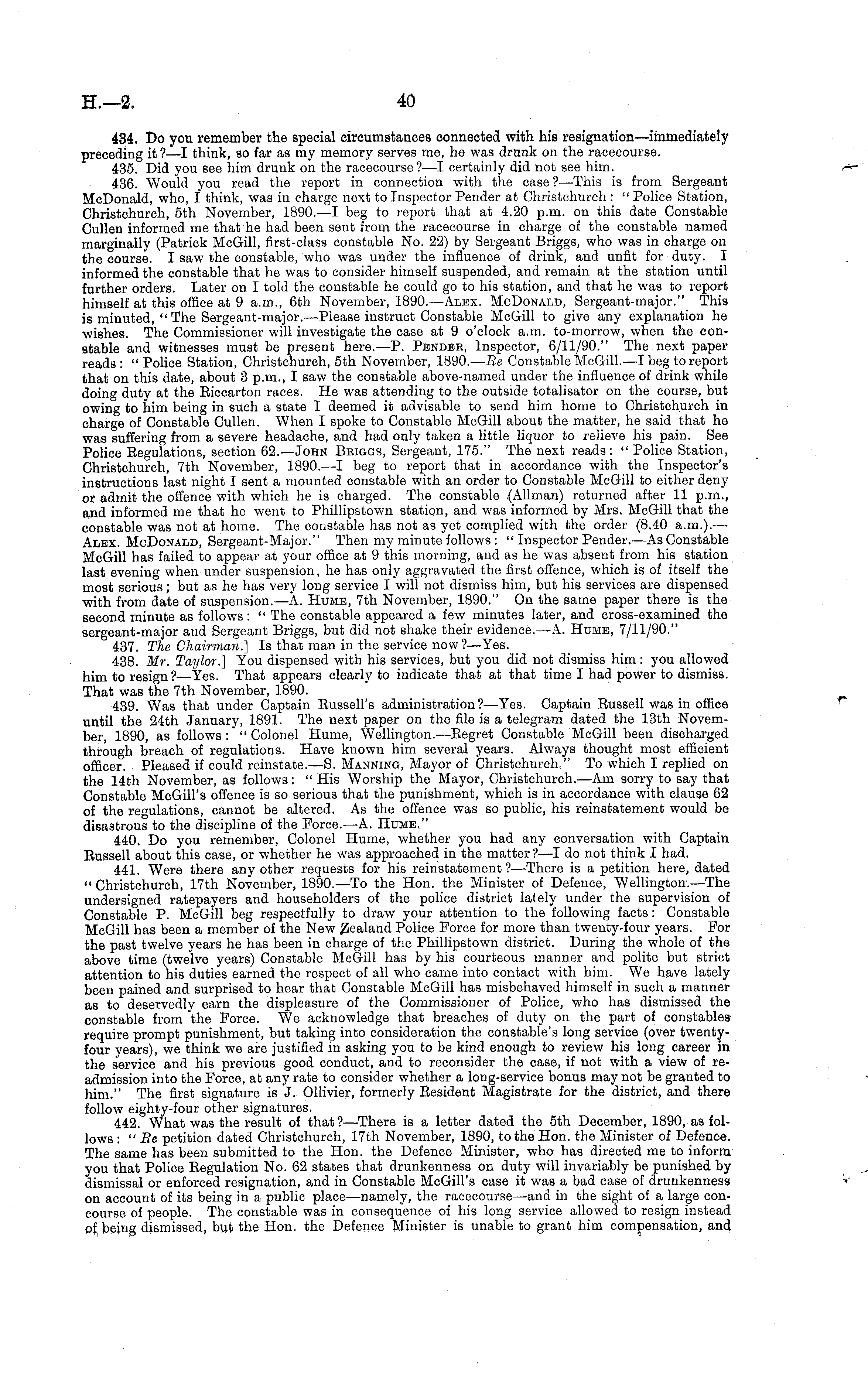 434. Do you remember the special circumstances connected with his resignation—immediately preceding it ?—I think, so far as my memory serves me, he was drunk on the racecourse. 435. Did you see him drunk on the racecourse? —I certainly did not see him. 436. Would you read the report in connection with the case ? —This is from Sergeant McDonald, who, I think, was in charge next to Inspector Pender at Christchurch : "Police Station, Christchurch, sth November, 1890. —I beg to report that at 4.20 p.m. on this date Constable Cullen informed me that he had been sent from the racecourse in charge of the constable named marginally (Patrick McGill, first-class constable No. 22) by Sergeant Briggs, who was in charge on the course. I saw the constable, who was under the influence of drink, and unfit for duty. I informed the constable that he was to consider himself suspended, and remain at the station until further orders. Later on I told the constable he could go to his station, and that he was to report himself at this office at 9 a.m., 6th November, 1890. —Alex. McDonald, Sergeant-major." This is minuted, " The Sergeant-major.—Please instruct Constable McGill to give any explanation he wishes. The Commissioner will investigate the case at 9 o'clock a.m. to-morrow, when the constable and witnesses must be present here.—P. Pendee, Inspector, 6/11/90." The next paper reads : " Police Station, Christchurch, sth November, 1890. — Re Constable McGill.—l beg to report that on this date, about 3 p.m., I saw the constable above-named under the influence of drink while doing duty at the Biccarton races. He was attending to the outside totalisator on the course, but owing to him being in such a state I deemed it advisable to send him home to Christchurch in charge of Constable Cullen. When I spoke to Constable McGill about the matter, he said that he was suffering from a severe headache, and had only taken a little liquor to relieve his pain. See Police Begulations, section 62. —John Beiggs, Sergeant, 175." The next reads: " Police Station, Christchurch, 7th November, 1890. —I beg to report that in accordance with the Inspector's instructions last night I sent a mounted constable with an order to Constable McGill to either deny or admit the offence with which he is charged. The constable (Allrnan) returned after 11 p.m., and informed me that he went to Phillipstown station, and was informed by Mrs. McGill that the constable was not at home. The constable has not as yet complied with the order (8.40 a.m.). — Alex. McDonald, Sergeant-Major." Then my minute follows : " Inspector Pender.—As Constable McGill has failed to appear at your office at 9 this morning, and as he was absent from his station last evening when under suspension, he has only aggravated the first offence, which is of itself the most serious; but as he has very long service I will not dismiss him, but his services are dispensed with from date of suspension.—A. Hume, 7th November, 1890." On the same paper there is the second minute as follows : " The constable appeared a few minutes later, and cross-examined the sergeant-major aud Sergeant Briggs, but did not shake their evidence.—A. Hume, 7/11/90." 437. The Chairman.] Is that man in the service now ?—Yes. 438. Mr. Taylor.] You dispensed with his services, but you did not dismiss him: you allowed him to resign?— Yes. That appears clearly to indicate that at that time I had power to dismiss. That was the 7th November, 1890. 439. Was that under Captain Bussell's administration?— Yes. Captain Bussell was in office until the 24th January, 1891. The next paper on the file is a telegram dated the 13th November, 1890, as follows: "Colonel Hume, Wellington.—Begret Constable McGill been discharged through breach of regulations. Have known him several years. Always thought most efficient officer. Pleased if could reinstate.—S. Manning, Mayor of Christchurch." To which I replied on the 14th November, as follows: "His Worship the Mayor, Christchurch.—Am sorry to say that Constable McGill's offence is so serious that the punishment, which is in accordance with clause 62 of the regulations, cannot be altered. As the offence was so public, his reinstatement would be disastrous to the discipline of the Force.- —A. Hume." 440. Do you remember, Colonel Hume, whether you had any conversation with Captain Bussell about this case, or whether he was approached in the matter? —I do not think I had. 441. Were there any other requests for his reinstatement ? —There is a petition here, dated " Christchurch, 17th November, 1890.—T0 the Hon. the Minister of Defence, Wellington.—The undersigned ratepayers and householders of the police district lately under the supervision of Constable P. McGill beg respectfully to draw your attention to the following facts: Constable McGill has been a member of the New Zealand Police Force for more than twenty-four years. For the past twelve years he has been in charge of the Phillipstown district. During the whole of the above time (twelve years) Constable McGill has by his courteous manner and polite but strict attention to his duties earned the respect of all who came into contact with him. We have lately been pained and surprised to hear that Constable McGill has misbehaved himself in such a manner as to deservedly earn the displeasure of the Commissioner of Police, who has dismissed the constable from the Force. We acknowledge that breaches of duty on the part of constables require prompt punishment, but taking into consideration the constable's long service (over twentyfour years), we think we are justified in asking you to be kind enough to review his long career in the service and his previous good conduct, and to reconsider the case, if not with a view of readmission into the Force, at any rate to consider whether a long-service bonus may not be granted to him." The first signature is J. Ollivier, formerly Eesident Magistra