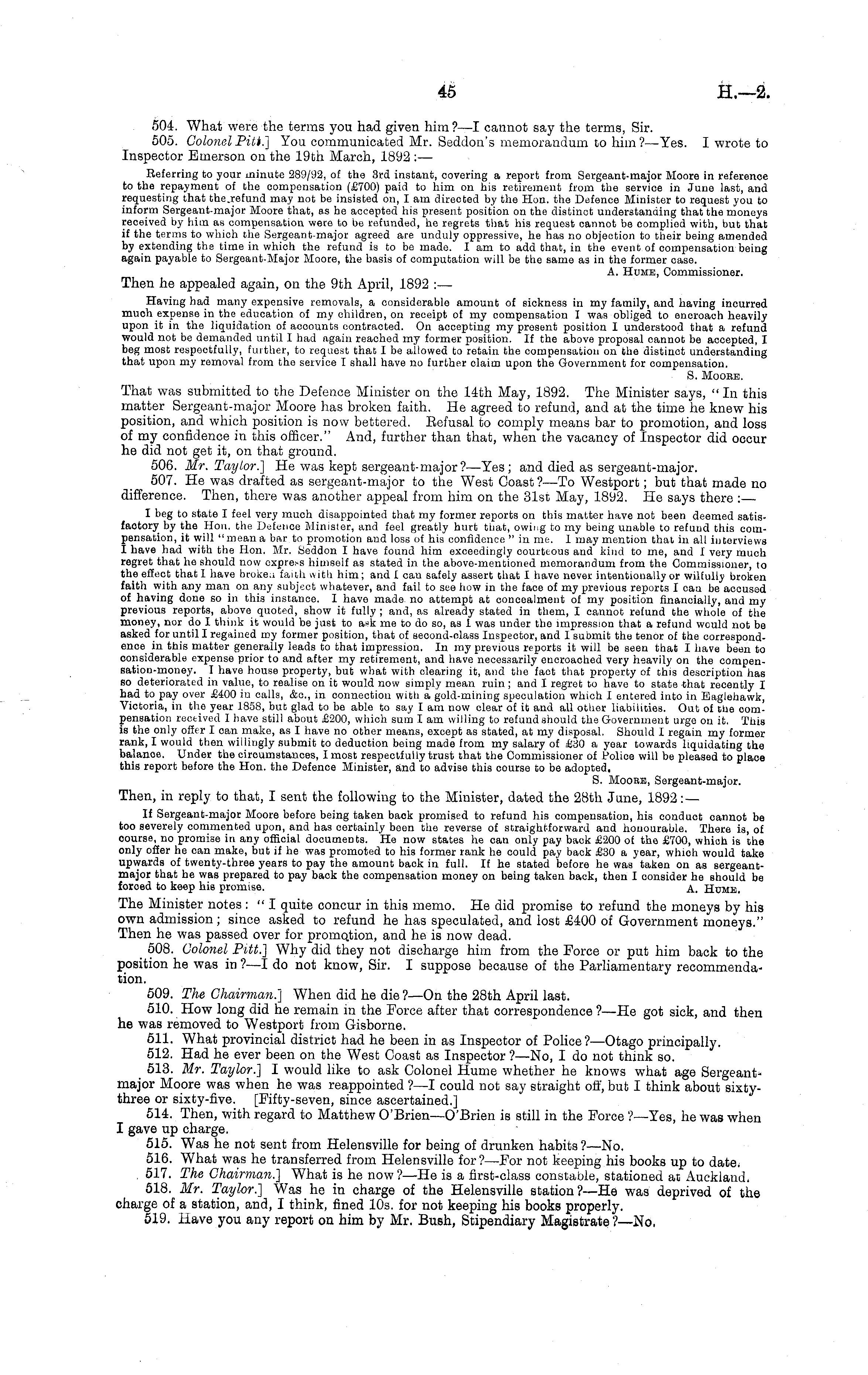504. What were the terms you had given him ? —I cannot say the terms, Sir. 505. Colonel Pitt.] You communicated Mr. Seddon's memorandum to him?— Yes. I wrote to Inspector Emerson on the 19th March, 1892 :— Eeferring to your minute 289/92, o£ the 3rd instant, covering a report from Sergeant-major Moore in reference to the repayment of the compensation (£700) paid to him on his retirement from the service in June last, and requesting that the .refund may not be insisted on, I am directed by the Hon. the Dsfence Minister to request you to inform Sergeant-major Moore that, a,s he accepted his present position on the distinct understanding that the moneys received by him as compensation were to be refunded, he regrets that his request cannot be complied with, but that if the terms to which the Sergeant-major agreed are unduly oppressive, he has no objection to their being amended by extending the time in which the refund is to be made. I am to add that, in the event of compensation being again payable to Sergeant-Major Moore, the basis of computation will be the same as in the former case. A. Hume, Commissioner. Then he appealed again, on the 9th April, 1892 :— Having had many expensive removals, a considerable amount of sickness in my family, and having incurred much expense in the education of my children, on receipt of my compensation I was obliged to encroach heavily upon it in the liquidation of accounts contracted. On accepting my present position I understood that a refund would not be demanded until I had again reached my former position. If the above proposal cannot be accepted, I beg most respectfully, further, to request that I be allowed to retain the compensation on the distinct understanding that upon my removal from the service I shall have no further claim upon the Government for compensation. S. Moobe. That was submitted to the Defence Minister on the 14th May, 1892. The Minister says, "In this matter Sergeant-major Moore has broken faith. He agreed to refund, and at the time he knew his position, and which position is novv bettered. Eefusal to comply means bar to promotion, and loss of my confidence in this officer." And, further than that, when the vacancy of Inspector did occur he did not get it, on that ground. 506. Mr. Taylor.] He was kept sergeant-major?— Yes; and died as sergeant-major. 507. He was drafted as sergeant-major to the West Coast ?—To Westport; but that made no difference. Then, there was another appeal from him on the 31st May, 1892. He says there :— I beg to state I feel very much disappointed that my former reports on this matter have not been deemed satisfactory by the Hon. the Defence Minister, and feel greatly hurt that, owing to my being unable to refund this compensation, it will "mean a bar to promotion and loss of his confidence "in me. 1 may mention that in all interviews I have had with the Hon. Mr. Seddon I have found him exceedingly courteous and kind to me, and I very much regret that he should now oxpre.-s himself as stated in the above-mentioned memorandum from the Commissioner, to the effect that I have broke, i faith with him; and I can safely assert that I have never intentionally or wilfully broken faith with any man on any subject whatever, and fail to see how in the face of my previous reports I can be accused of having done so in this instance. I have made no attempt at concealment of my position financially, and my previous reports, above quoted, show it fully ; and, as already stated in them, I cannot refund the whole of the money, nor do I think it would be just to ask me to do so, as I was under the impression that a refund would not be asked for until I regained my former position, that of second-class Inspector, and 1 submit the tenor of the correspondence in this matter generally leads to that impression. In my previous reports it will be seen that I have been to considerable expense prior to and after my retirement, and have necessarily encroached very heavily on the compen-sation-money. I have house property, but what with clearing it, and the fact that property of this description'tias so deteriorated in value, to realise on it would now simply mean ruin ; and I regret to have to state that recently I had to pay over £400 in calls, &c., in connection with a gold-mining speculation which I entered into in Baglehawk, Victoria, in the year 1858, but glad to be able to say lam now clear of it and all other liabilities. Out of cue compensation received I have still about £200, which sum lam willing to refund should the Government urge on it. This is the only offer I can make, as I have no other means, except as stated, at my disposal. Should I regain my former rank, I would then willingly submit to deduction being made from my salary of £30 a year towards liquidating the balanoe. Under the circumstances, I most respectfully trust that the Commissioner of Police will be pleased to place this report before the Hon. the Defence Minister, and to advise this course to be adopted. S. Moobe, Sergeant-major. Then, in reply to that, I sent the following to the Minister, dated the 28th June, 1892 : — If Sergeant-major Moore before being taken baok promised to refund his compensation, his conduct cannot be too severely commented upon, and has certainly been the reverse of straightforward and honourable. There is, of course, no promise in any official documents. He now states he can only pay back £200 of the £700, which is the only offer he can make, but if he was promoted to his former rank he could pay back £30 a year, which would take upwards of twenty-three years to pay the amount back in full. If he stated before he was taken on as sergeantmajor that he was prepared to pay back the compensation money on being taken back, then I consider he should be forced to keep his promise. A. Hume. The Minister notes :"I quite concur in this memo. He did promise to refund the moneys by his own admission; since asked to refun