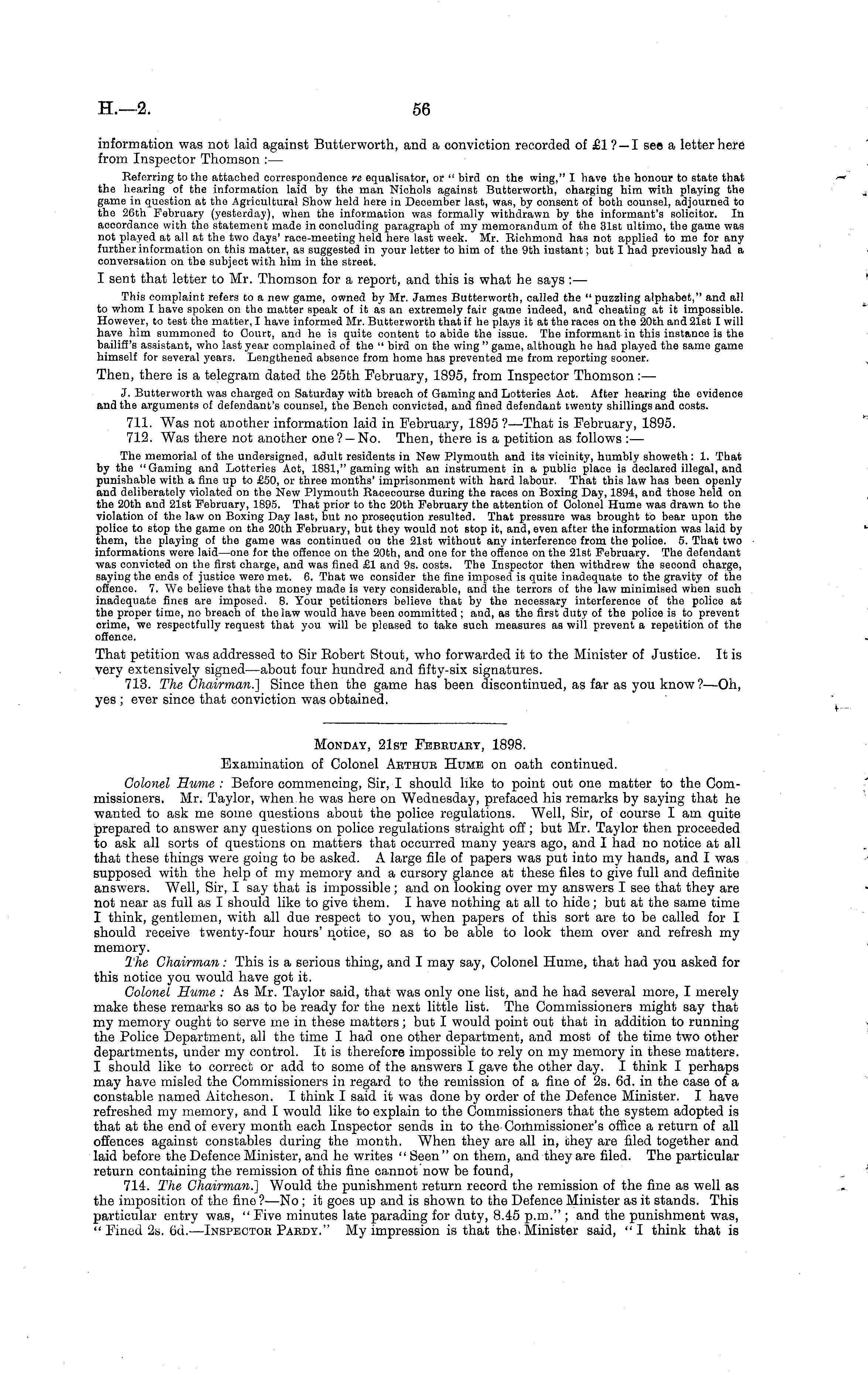 Monday, 21st Febbuary, 1898. Examination of Colonel Aethub Hume on oath continued. Colonel Hume : Before commencing, Sir, I should like to point out one matter to the Commissioners. Mr. Taylor, when he was here on Wednesday, prefaced his remarks by saying that he wanted to ask me some questions about the police regulations. Well, Sir, of course lam quite prepared to answer any questions on police regulations straight off; but Mr. Taylor then proceeded to ask all sorts of questions on matters that occurred many years ago, and I had no notice at all that these things were going to be asked. A large file of papers was put into my hands, and I was supposed with the help of my memory and a cursory glance at these files to give full and definite answers. Well, Sir, I say that is impossible ; and on looking over my answers I see that they are not near as full as I should like to give them. I have nothing at all to hide; but at the same time I think, gentlemen, with all due respect to you, when papers of this sort are to be called for I should receive twenty-four hours' notice, so as to be able to look them over and refresh my memory. The Chairman: This is a serious thing, and I may say, Colonel Hume, that had you asked for this notice you would have got it. Colonel Hume : As Mr. Taylor said, that was only one list, and he had several more, I merely make these remarks so as to be ready for the next little list. The Commissioners might say that my memory ought to serve me in these matters; but I would point out that in addition to running the Police Department, all the time I had one other department, and most of the time two other departments, under my control. It is therefore impossible to rely on my memory in these matters. I should like to correct or add to some of the answers I gave the other day. I think I perhaps may have misled the Commissioners in regard to the remission of a fine of 2s. 6d. in the case of a constable named Aitcheson. I think I said it was done by order of the Defence Minister. I have refreshed my memory, and I would like to explain to the Commissioners that the system adopted is that at the end of every month each Inspector sends in to the Corhmissioner's office a return of all offences against constables during the month. When they are all in, iihey are filed together and laid before the Defence Minister, and he writes " Seen" on them, and they are filed. The particular return containing the remission of this fine ca,nnot now be found, 714. The Chairman.'] Would the punishment return record the remission of the fine as well as the imposition of the fine ?—No ;it goes up and is shown to the Defence Minister as it stands. This particular entry was, " Five minutes late parading for duty, 8.45 p.m." ; and the punishment was, " Fined 2s. 6d.—lnspectob Pardy." My impression is that the. Minister said, "I think that is