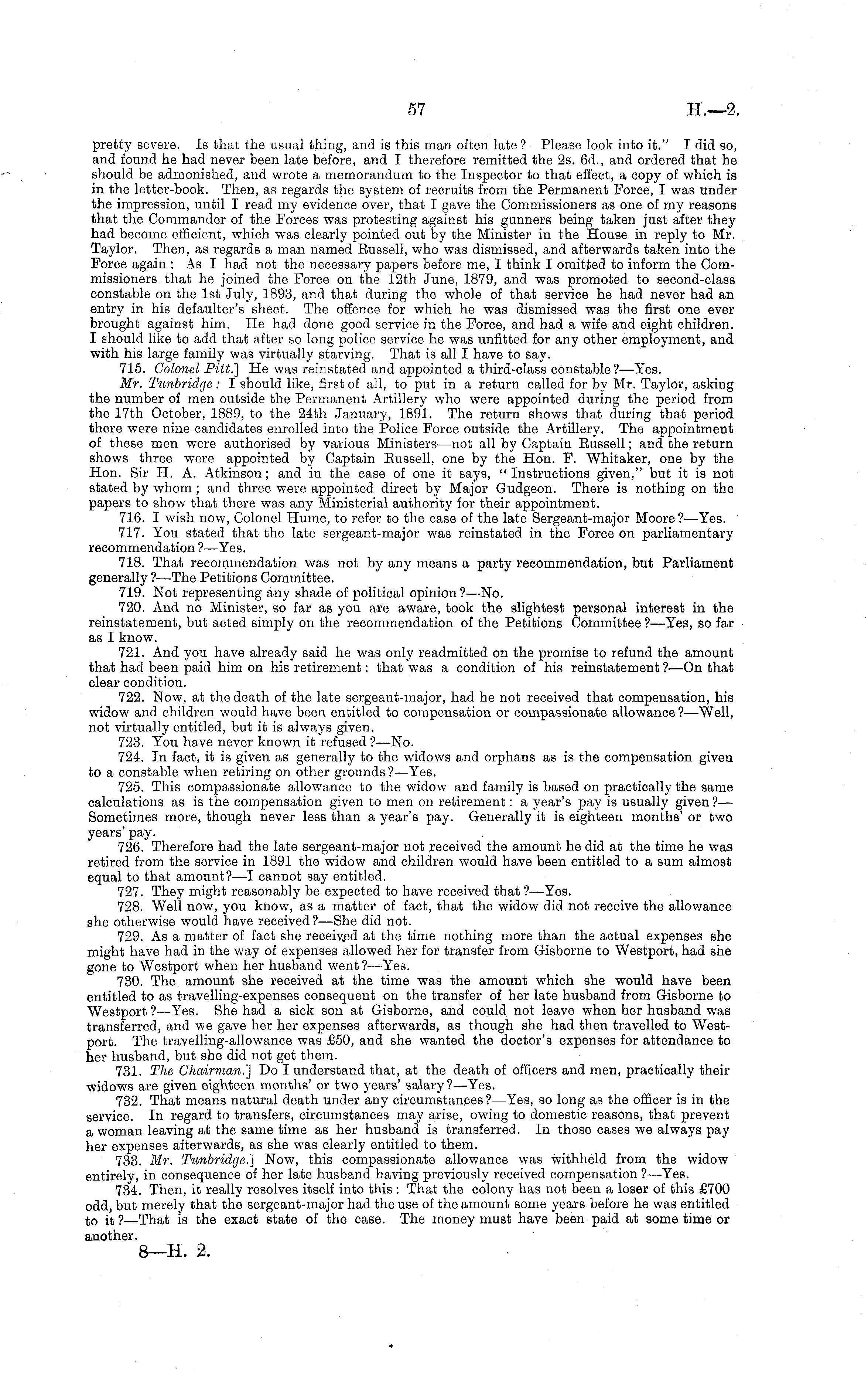 pretty severe. Is that the usual thing, and is this man often late ? ■ Please look into it." I did so, and found he had never been late before, and I therefore remitted the 2s. 6d., and ordered that he should be admonished, and wrote a memorandum to the Inspector to that effect, a copy of which is in the letter-book. Then, as regards the system of recruits from the Permanent Force, I was under the impression, until I read my evidence over, that I gave the Commissioners as one of my reasons that the Commander of the Forces was protesting against his gunners being taken just after they had become efficient, which was clearly pointed out by the Minister in the House in reply to Mr. Taylor. Then, as regards a man named Eussell, who was dismissed, and afterwards taken into the Force again : As I had not the necessary papers before me, I think I omitted to inform the Commissioners that he joined the Force on the 12th June, 1879, and was promoted to second-class constable on the Ist July, 1893, and that during the whole of that service he had never had an entry in his defaulter's sheet. The offence for which he was dismissed was the first one ever brought against him. He had done good service in the Force, and had a wife and eight children. I should like to add that after so long police service he was unfitted for any other employment, and with his large family was virtually starving. That is all I have to say. 715. Colonel Pitt.] He was reinstated and appointed a third-class constable?— Yes. Mr. Tunbridge : I should like, first of all, to put in a return called for by Mr. Taylor, asking the number of men outside the Permanent Artillery who were appointed during the period from the 17th October, 1889, to the 24th January, 1891. The return shows that during that period there were nine candidates enrolled into the Police Force outside the Artillery. The appointment of these men were authorised by various Ministers—not all by Captain Eussell; and the return shows three were appointed by Captain Eussell, one by the Hon. F. Whitaker, one by the Hon. Sir H. A. Atkinson; and in the case of one it says, "Instructions given," but it is not stated by whom ; and three were appointed direct by Major Gudgeon. There is nothing on the papers to show that there was any Ministerial authority for their appointment. 716. I wish now, Colonel Hume, to refer to the case of the late Sergeant-major Moore?— Yes. 717. You stated that the late sergeant-major was reinstated in the Force on parliamentary recommendation ?—Yes. 718. That recommendation was not by any means a party recommendation, but Parliament generally ?—The Petitions Committee. 719. Not representing any shade of political opinion ?—No. 720. And no Minister, so far as you are aware, took the slightest personal interest in the reinstatement, but acted simply on the recommendation of the Petitions Committee ?—Yes, so far as I know. 721. And you have already said he was only readmitted on the promise to refund the amount that had been paid him on his retirement: that was a condition of his reinstatement ?—On that clear condition. 722. Now, at the death of the late sergeant-major, had he not received that compensation, his widow and children would have been entitled to compensation or compassionate allowance ? —Well, not virtually entitled, but it is always given. 723. You have never known it refused ? —No. 724. In fact, it is given as generally to the widows and orphans as is the compensation given to a constable when retiring on other grounds? —Yes. 725. This compassionate allowance to the widow and family is based on practically the same calculations as is the compensation given to men on retirement: a year's pay is usually given ?— Sometimes more, though never less than a year's pay. Generally it is eighteen months' or two years' pay. 726. Therefore had the late sergeant-major not received the amount he did at the time he was retired from the service in 1891 the widow and children would have been entitled to a sum almost equal to that amount? —I cannot say entitled. 727. They might reasonably be expected to have received that ?—Yes. 728. Well now, you know, as a matter of fact, that the widow did not receive the allowance she otherwise would have received?— She did not. 729. As a matter of fact she received at the time nothing more than the actual expenses she might have had in the way of expenses allowed her for transfer from Gisborne to Westport, had she gone to Westport when her husband went ? —Yes. 730. The amount she received at the time was the amount which she would have been entitled to as travelling-expenses consequent on the transfer of her late husband from Gisborne to Westport ? —Yes. She had a sick son at Gisborne, and could not leave when her husband was transferred, and we gave her her expenses afterwards, as though she had then travelled to Westport. The travelling-allowance was £50, and she wanted the doctor's expenses for attendance to her husband, but she did not get them. 731. The Chairman.'] Do I understand that, at the death of officers and men, practically their widows are given eighteen months' or two years' salary?— Yes. 732. That means natural death under any circumstances? —Yes, so long as the officer is in the service. In regard to transfers, circumstances may arise, owing to domestic reasons, that prevent a woman leaving at the same time as her husband is transferred. In those cases we always pay her expenses afterwards, as she was clearly entitled to them. 733. Mr. Tunbridge.] Now, this compassionate allowance was withheld from the widow entirely, in consequence of her late husband having previously received compensation ?—Yes. 734. Then, it really resolves itself into this : That the colony has not been a loser of this £700 odd, but merely that the sergeant-major had the use of the amount some years before he was entitled to it ?—That is the exact state of the case. The money must