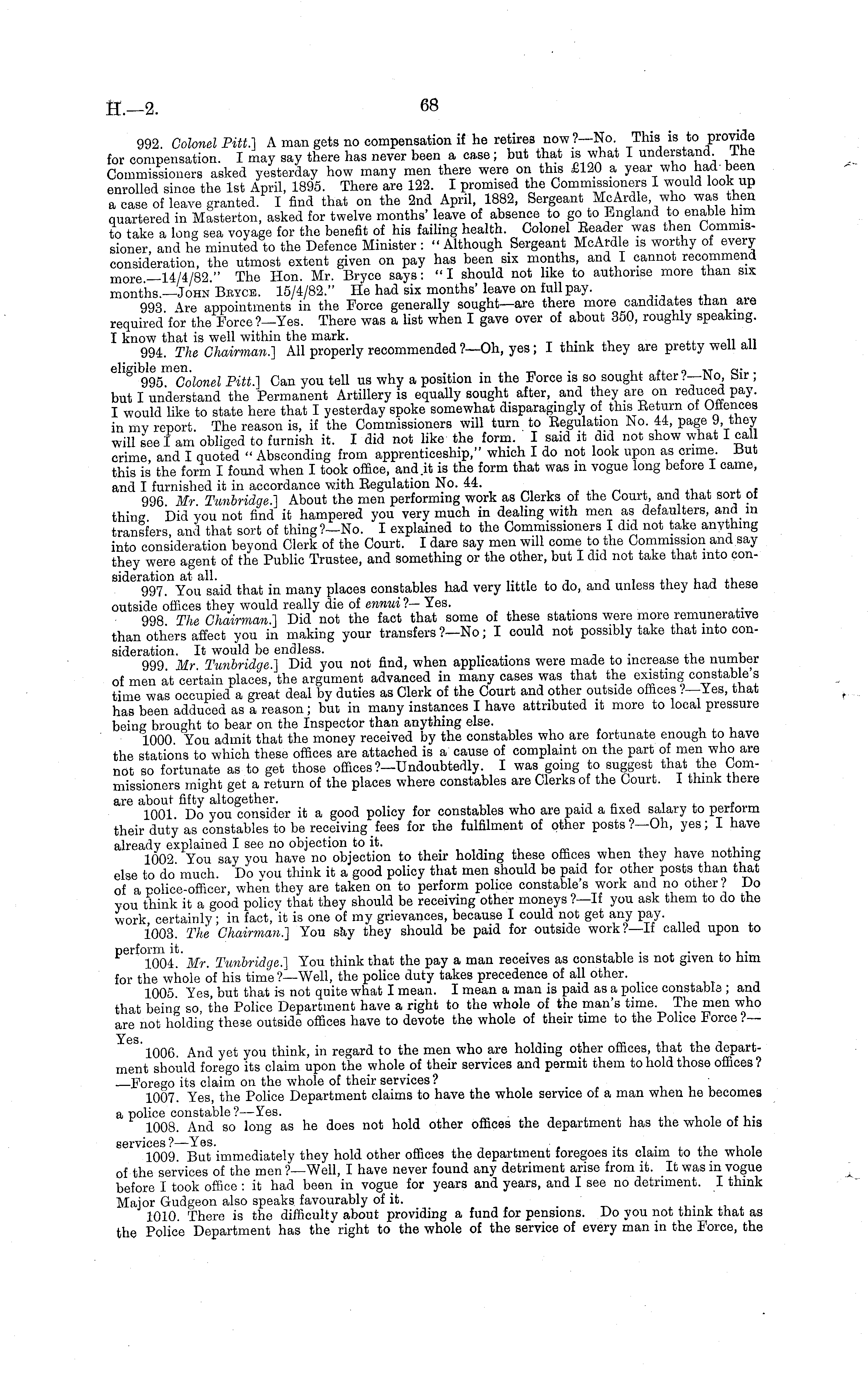 992 Colonel Pitt.] A man gets no compensation if he retires now?—No, This is to provide for compensation. I may say there has never been a case ; but that is what I understand The Commissioners asked yesterday how many men there were on this £120 a year who had-been enrolled since the Ist April, 1895. There are 122. I promised the Commissioners I would look up a case of leave granted. I find that on the 2nd April, 1882, Sergeant McArdle who was then quartered in Masterton, asked for twelve months' leave of absence to go to England to enable him to take a long sea voyage for the benefit of his failing health. Colonel Eeader was then Commissioner and he minuted to the Defence Minister : " Although Sergeant McArdle is worthy of every consideration, the utmost extent given on pay has been six months, and I cannot recommend more —14/4/82." The Hon. Mr. Bryce says: "I should not like to authorise more than six months—John Beycb. 15/4/82." He had six months'leave on full pay. 993 Are appointments in the Force generally sought—are there more candidates than are required for the Force ?—Yes. There was a list when I gave over of about 350, roughly speaking. I know that is well within the mark. . 994. The Chairman.] All properly recommended ?—Oh, yes; I think they are pretty well all eligible men. . , ~ „ XT fl . 995 Colonel Pitt.] Can you tell us why a position in the Force is so sought after >— No, bir , but I understand the Permanent Artillery is equally sought after, and they are on reduced pay. I would like to state here that I yesterday spoke somewhat disparagingly of this Beturn of Offences in my report. The reason is, if the Commissioners will turn to Eegulation No. 44, page 9, they will see lam obliged to furnish it. I did not like the form. I said it did not show what I call crime, and I quoted " Absconding from apprenticeship," which Ido not look upon as crime. But this is the form I found when I took office, and.it is the form that was in vogue long before I came, and I furnished it in accordance with Eegulation No. 44. 996 Mr Tunbridge.] About the men performing work as Clerks of the Court, and that sort ot thing Did you not find it hampered you very much in dealing with men as defaulters, and m transfers, and that sort of thing?— No. I explained to the Commissioners I did not take anything into consideration beyond Clerk of the Court. I dare say men will come to the Commission and say they were agent of the Public Trustee, and something or the other, but I did not take that into consideration at all. , n -. , ~ , -, ~ 997. You said that in many places constables had very little to do, and unless they had these outside offices they would really die of ennui ?— Yes. 998 The Chairman.] Did not the fact that some of these stations were more remunerative than others affect you in making your transfers ?—No; I could not possibly take that into consideration. It would be endless. , ~ . ,i r. 999 Mr Tunbridge ] Did you not find, when applications were made to increase the number of men at certain places, the argument advanced in many cases was that the existing constable s time was occupied a great deal by duties as Clerk of the Court and other outside offices ?—Yes, that has been adduced as a reason ; but in many instances I have attributed it more to local pressure being brought to bear on the Inspector than anything else. 1000 You admit that the money received by the constables who are fortunate enough to have the stations to which these offices are attached is a cause of complaint on the part of men who are not so fortunate as to get those offices?— Undoubtedly. I was going to suggest that the Commissioners might get a return of the places where constables are Clerks of the Court. I think there are about fifty altogether. .■,*■,, c 1001 Do you consider it a good policy for constables who are paid a fixed salary to perform their duty as constables to be receiving fees for the fulfilment of other posts?—Oh, yes; I have already explained I see no objection to it. ~,.., oa v i.i. t. tu--1002 You say you have no objection to their holding these offices when they have nothing else to do much. Do you think it a good policy that men should be paid for other posts than that of a police-officer, when they are taken on to perform police constable's work and no other ? Do you think it a good policy that they should be receiving other moneys ?—lf you ask them to do the work certainly; in fact, it is one of my grievances, because I could not get any pay. 1003. The Chairman.] You say they should be paid for outside work?—lf called upon to perform it. . ~, . . ", ~ 1004. Mr. Tunbridge.] You think that the pay a man receives as constable is not given to him for the whole of his time ?—Well, the police duty takes precedence of all other. 1005. Yes, but that is not quite what I mean. I mean a man is paid as a police constable ; and that bein* so, the Police Department have a right to the whole of the man's time. The men who are not holding these outside offices have to devote the whole of their time to the Police Force ?— Yes. 1006. And yet you think, in regard to the men who are holding other offices, that the department should forego its claim upon the whole of their services and permit them to hold those offices ? Forego its claim on the whole of their services ? . ■ 1007. Yes, the Police Department claims to have the whole service of a man when he becomes a police constable ?—Yes. . . 1008. And so long as he does not hold other offices the department has the whole of his RPI'VIOGS jLQS. 1009. But immediately they hold other offices the department foregoes its claim to the whole of the services of the men ?—Well, I have never found any detriment arise from it. It was in vogue before I took office :it had been in vogue for years and years, and I see no detriment. I think Major Gudgeon also speaks favourably of it. 1010. There is the difficulty about providing