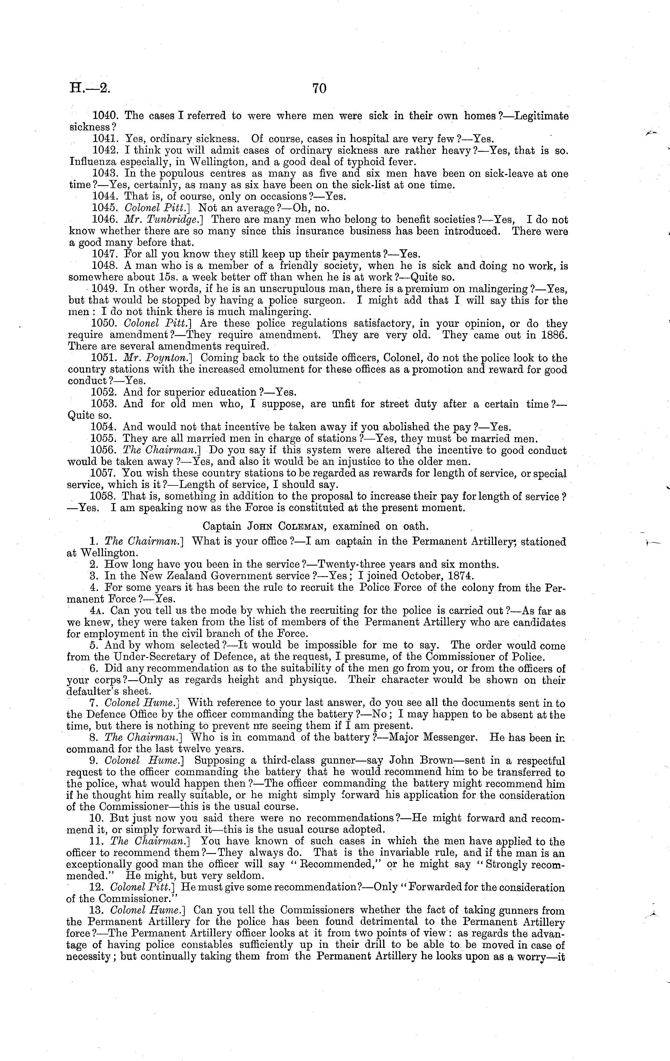 1040. The cases I referred to were where men were sick in their own homes ? —Legitimate sickness ? 1041. Yes, ordinary sickness. Of course, cases in hospital are very few?— Yes. 1042. I think you will admit cases of ordinary sickness are rather heavy?— Yes, that is so. Influenza especially, in Wellington, and a good deal of typhoid fever. 1043. In the populous centres as many as five and six men have been on sick-leave at one time ?—Yes, certainly, as many as six have been on the sick-list at one time. 1044. That is, of course, only on occasions ? —Yes. 1045. Colonel Pitt.'] Not an average ?—Oh, no. 1046. Mr. Tunbridge.] There are many men who belong to benefit societies ?—Yes, I do not know whether there are so many since this insurance business has been introduced. There were a good many before that. 1047. For all you know they still keep up their payments ?—Yes. 1048. A man who is a member of a friendly society, when he is sick and doing no work, is somewhere about 15s. a week better off than when he is at work ?—Quite so. 1049. In other words, if he is an unscrupulous man, there is a premium on malingering ? —Yes, but that would be stopped by having a police surgeon. I might add that I will say this for the men : I do not think there is much malingering. 1050. Colonel Pitt.] Are these police regulations satisfactory, in your opinion, or do they require amendment ?—They require amendment. They are very old. They came out in 1886. There are several amendments required. 1051. Mr. Poynton.] Coming back to the outside officers, Colonel, do not the police look to the country stations with the increased emolument for these offices as a promotion and reward for good conduct ? —Yes. 1052. And for superior education ?—Yes. 1053. And for old men who, I suppose, are unfit for street duty after a certain time ?—■ Quite so. 1054. And would not that incentive be taken away if you abolished the pay ?—Yes. 1055. They are all married men in charge of stations ? —Yes, they must be married men. 1056. The Chairman.] Do you say if this system were altered the incentive to good conduct would be taken away ?—Yes, and also it would be an injustice to the older men. 1057. You wish these country stations to be regarded as rewards for length of service, or special service, which is it ? —Length of service, I should say. 1058. That is, something in addition to the proposal to increase their pay for length of service ? —Yes. I am speaking now as the Force is constituted at the present moment. Captain John Coleman, examined on oath. 1. The Chairman.] What is your office ?—I am captain in the Permanent Artillery, stationed at Wellington. 2. How long have you been in the service?— Twenty-three years and six months. 3. In the New Zealand Government service ? —Yes; I joined October, 1874. 4. For some years it has been the rule to recruit the Police Force of the colony from the Permanent Force ?—Yes. 4a. Can you tell us the mode by which the recruiting for the police is carried out ?—As far as we knew, they were taken from the list of members of the Permanent Artillery who are candidates for employment in the civil branch of the Force. 5. And by whom selected ? —lt would be impossible for me to say. The order would come from the Under-Secretary of Defence, at the request, I presume, of the Commissioner of Police. 6. Did any recommendation as to the suitability of the men go from you, or from the officers of your corps?— Only as regards height and physique. Their character would be shown on their defaulter's sheet. 7. Colonel Hume.] With reference to your last answer, do you see all the documents sent in to the Defence Office by the officer commanding the battery ? —No ; I may happen to be absent at the time, but there is nothing to prevent me seeing them if I am present. 8. The Chairman.] Who is in command of the battery ? —Major Messenger. He has been in command for the last twelve years. 9. Colonel Hume.] Supposing a third-class gunner—say John Brown—sent in a respectful request to the officer commanding the battery that he would recommend him to be transferred to the police, what would happen then ?—The officer commanding the battery might recommend him if he thought him. really suitable, or he might simply forward his application for the consideration of the Commissioner —this is the usual course. 10. But just now you said there were no recommendations?—He might forward and recommend it, or simply forward it—this is the usual course adopted. 11. The Chairman.] You have known of such cases in which the men have applied to the officer to recommend them ?—They always do. That is the invariable rule, and if the man is an exceptionally good man the officer will say " Eecommended," or he might say " Strongly recommended." He might, but very seldom. 12. Colonel Pitt.] He must give some recommendation?— Only "Forwarded for the consideration of the Commissioner." 13. Colonel Hume.] Can you tell the Commissioners whether the fact of taking gunners from the Permanent Artillery for the police has been found detrimental to the Permanent Artillery force? —The Permanent Artillery officer looks at it from two points of view : as regards the advantage of having police constables sufficiently up in their drill to be able to be moved in case of necessity; but continually taking them from the Permanent Artillery he looks upon as a worry—it