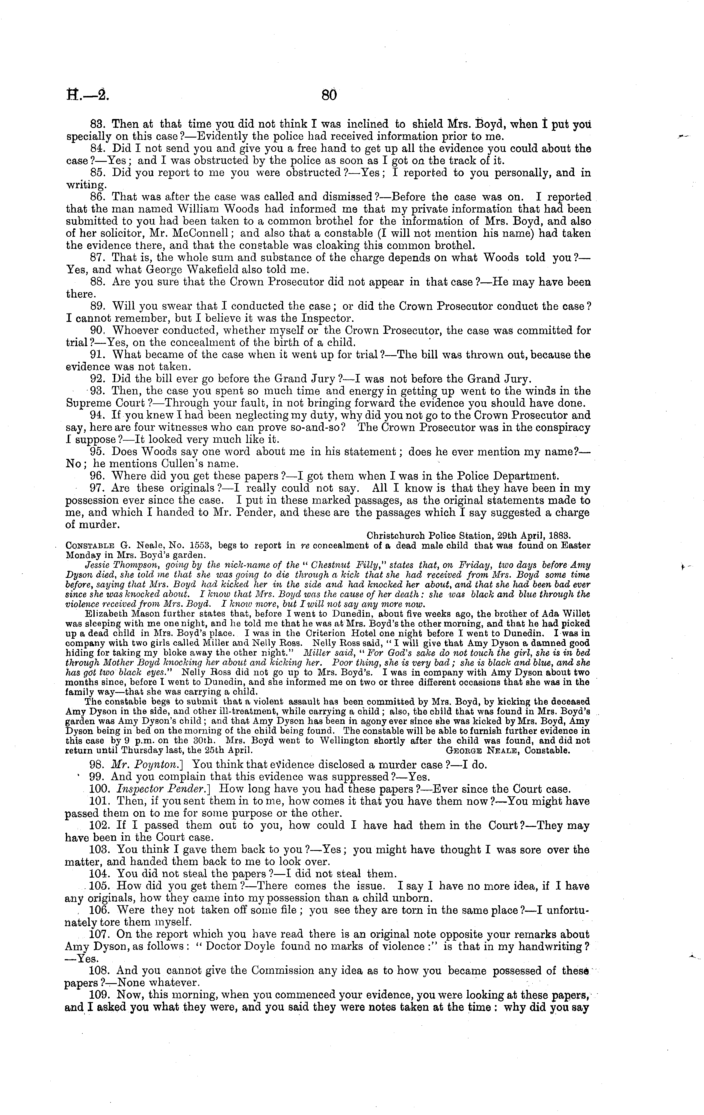 83. Then at that time you did not think I was inclined to shield Mrs. Boyd, when I put you specially on this case? —Evidently the police had received information prior to me. 84. Did I not send you and give you a free hand to get up all the evidence you could about the case ?—Yes; and I was obstructed by the police as soon as I got on the track of it. 85. Did you report to me you were obstructed ? —Yes; I reported to you personally, and in writing. 86. That was after the case was called and dismissed ?—Before the case was on. I reported that the man named William Woods had informed me that my private information that had been submitted to you had been taken to a common brothel for the information of Mrs. Boyd, and also of her solicitor, Mr. McConnell; and also that a constable (I will not mention his name) had taken the evidence there, and that the constable was cloaking this common brothel. 87. That is, the whole sum and substance of the charge depends on what Woods told you?— Yes, and what George Wakefield also told me. 88. Are you sure that the Crown Prosecutor did not appear in that case ?—He may have been there. 89. Will you swear that I conducted the case; or did the Crown Prosecutor conduct the case ? I cannot remember, but I believe it was the Inspector. 90. Whoever conducted, whether myself or the Crown Prosecutor, the case was committed for trial ?—-Yes, on the concealment of the birth of a child. 91. What became of the case when it went up for trial?— The bill was thrown out, because the evidence was not taken. 92. Did the bill ever go before the Grand Jury ?—I was not before the Grand Jury. 93. Then, the case you spent so much time and energy in getting up went to the winds in the Supreme Court ?—Through your fault, in not bringing forward the evidence you should have done. 94. If you knew I had been neglecting my duty, why did you not go to the Crown Prosecutor and say, here are four witnesses who can prove so-and-so? The Crown Prosecutor was in the conspiracy I suppose ?—lt looked very much like it. 95. Does Woods say one word about me in his statement; does he ever mention my name?— No; he mentions Cullen's name. 96. Where did you get these papers ?—I got them when I was in the Police Department. ■ 97. Are these originals ?—I really could not say. All I know is that they have been in my possession ever since the case. I put in these marked passages, as the original statements made to me, and which I handed to Mr. Pender, and these are the passages which I say suggested a charge of murder. Christchuroh Police Station, 29th April, 1883. Constable G. Neale, No. 1553, begs to report in re concealment of a dead male child that was found on Easter Monday in Mrs. Boyd's garden. Jessie Thompson, going by the nick-name of the " Chestnut Filly," states that, on Friday, two days before Amy Dyson died, she told me that she was going to die through a kick that she had received from Mrs. Boyd some time before, saying that Mrs. Boyd had kicked her in the side and had knocked her about, and that she had been bad ever since she was knocked about. I know that Mrs. Boyd was the cause of her death: she was black and blue through the violence received from Mrs. Boyd. I know more, but I will not say any more now. Elizabeth Mason further states that, before I went to Dunedin, about five weeks ago, the brother of Ada Willet was sleeping with me one night, and he told me that he was at Mrs. Boyd's the other morning, and that he had picked up a dead child in Mrs. Boyd's place. I was in the Criterion Hotel one night before I went to Dunedin. I was in company with two girls called Miller and Nelly Ross. Nelly Ross said, " I will give that Amy Dyson a damned good hiding for taking my bloke away the other night." Miller said, " For God's sake do not touch the girl, she is in bed through Mother Boyd knocking her about and kicking her. Poor thing, she is very bad; she is black and blue, and she has got two black eyes." Nelly Ross did not go up to Mrs. Boyd's. I was in company with Amy Dyson about two months since, before I went to Dunedin, and she informed me on two or three different occasions that she was in the family way —that she was carrying a child. The constable begs to submit that a violent assault has been committed by Mrs. Boyd, by kicking the deceased Amy Dyson in the side, and other ill-treatment, while carrying a child ; also, the child that was found in Mrs. Boyd's garden was Amy Dyson's child ; and that Amy Dyson has been in agony ever since she was kicked by Mrs. Boyd, Amy Dyson being in bed on the morning of the child being found. The constable will be able to furnieh further evidence in this case by 9 p.m. on the 30th. Mrs. Boyd went to Wellington shortly after the child was found, and did not return until Thursday last, the 25th April. Geoegb Neale, Constable. 98. Mr. Poynton.] You think that evidence disclosed a murder case ? —I do. ' 99. And you complain that this evidence was suppressed ?—Yes. 100. Inspector Pender.] How long have you had these papers ?—Ever since the Court case. 101. Then, if you sent them in to me, how comes it that you have them now ?—You might have passed them on to me for some purpose or the other. 102. If I passed them out to you, how could I have had them in the Court?— They may have been in the Court case. 103. You think I gave them back to you ?—Yes; you might have thought I was sore over the matter, and handed them back to me to look over. 104. You did not steal the papers ? —I did not steal them. . 105. How did you get them ?—There comes the issue. I say I have no more idea, if I have any originals, how they came into my possession than a child unborn. , 106. Were they not taken off some file ; you see they are torn in the same place ?—I unfortunately tore them myself. 107. On the report which you have read there is an original note opposite your remarks about Amy Dyson, as follows : " Doctor Doyle found 