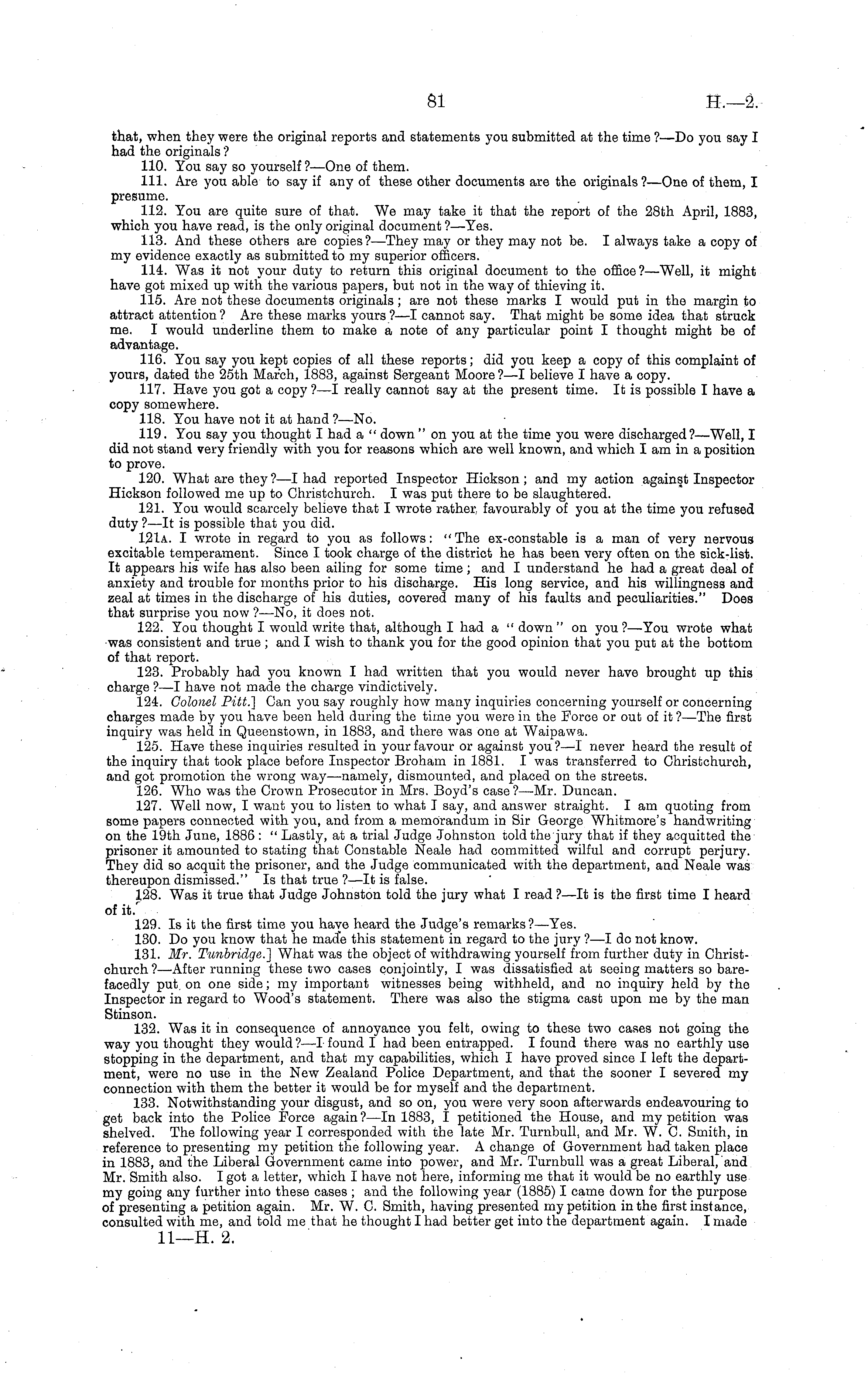 that, when they were the original reports and statements you submitted at the time ?—Do you say I had the originals ? 110. You say so yourself ?—One of them. 111. Are you able to say if any of these other documents are the originals ?—One of them, I presume. 112. You are quite sure of that. We may take it that the report of the 28th April, 1883, which you have read, is the only original document ?—Yes. 113. And these others are copies?— They may or they may not be. I always take a copy of my evidence exactly as submitted to my superior officers. 114. Was it not your duty to return this original document to the office?— Well, it might have got mixed up with the various papers, but not in the way of thieving it. 115. Are not these documents originals; are not these marks I would put in the margin to attract attention? Are these marks yours?—l cannot say. That might be some idea that struck me. I would underline them to make a note of any particular point I thought might be of advantage. 116. You say you kept copies of all these reports; did you keep a copy of this complaint of yours, dated the 25th March, 1883, against Sergeant Moore ?—I believe I have a copy. 117. Have you got a copy ? —I really cannot say at the present time. It is possible I have a copy somewhere. 118. You have not it at hand ?—No. 119. You say you thought I had a " down "on you at the time you were discharged?— Well, I did not stand very friendly with you for reasons which are well known, and which I am in a position to prove. 120. What are they ?—I had reported Inspector Hickson ; and my action against Inspector Hickson followed me up to Christchurch. I was put there to be slaughtered. 121. You would scarcely believe that I wrote rather, favourably of you at the time you refused duty ?—lt is possible that you did. 121 a. I wrote in regard to you as follows: "The ex-constable is a man of very nervous excitable temperament. Since I took charge of the district he has been very often on the sick-list. It appears his wife has also been ailing for some time; and I understand he had a great deal of anxiety and trouble for months prior to his discharge. His long service, and his willingness and zeal at times in the discharge of his duties, covered many of his faults and peculiarities." Does that surprise you now ? —No, it does not. 122. You thought I would write that, although I had a " down " on you ?—You wrote what -was consistent and true ; and I wish to thank you for the good opinion that you put at the bottom of that report. 123. Probably had you known I had written that you would never have brought up this charge ? —I have not made the charge vindictively. 124. Colonel Pitt.] Can you say roughly how many inquiries concerning yourself or concerning charges made by you have been held during the time you were in the Force or out of it ?—The first inquiry was held, in Queenstown, in 1883, and there was one at Waipawa. 125. Have these inquiries resulted in your favour or against you? —1 never heard the result of the inquiry that took place before Inspector Broham in 1881. I was transferred to Christchurch, and got promotion the wrong way—namely, dismounted, and placed on the streets. 126. Who was the Crown Prosecutor in Mrs. Boyd's case?— Mr. Duncan. 127. Well now, I want you to listen to what I say, and answer straight. I am quoting from some papers connected with you, and from a memorandum in Sir George Whitmore's handwriting on the 19th June, 1886 : " Lastly, at a trial Judge Johnston told the jury that if they acquitted the prisoner it amounted to stating that Constable Neale had committed wilful and corrupt perjury. They did so acquit the prisoner, and the Judge communicated with the department, and Neale was thereupon dismissed." Is that true ?—lt is false. 128. Was it true that Judge Johnston told the jury what I read ?—lt is the first time I heard of it.' 129. Is it the first time you have heard the Judge's remarks?— Yes. 130. Do you know that he made this statement in regard to the jury ?—I do not know. 131. Mr. Tunbridge.] What was the object of withdrawing yourself from further duty in Christchurch? —After running these two cases conjointly, I was dissatisfied at seeing matters so barefacedly put. on one side; my important witnesses being withheld, and no inquiry held by the Inspector in regard to Wood's statement. There was also the stigma cast upon me by the man Stinson. 132. Was it in consequence of annoyance you felt, owing to these two cases not going the way you thought they would?—l found I had been entrapped. I found there was no earthly use stopping in the department, and that my capabilities, which I have proved since I left the department, were no use in the New Zealand Police Department, and that the sooner I severed my connection with them the better it would be for myself and the department. 133. Notwithstanding your disgust, and so on, you were very soon afterwards endeavouring to get back into the Police Force again?—ln 1883, I petitioned the House, and my petition was shelved. The following year I corresponded with the late Mr. Turnbull, and Mr. W. C. Smith, in reference to presenting my petition the following year. A change of Government had taken place in 1883, and the Liberal Government came into power, and Mr. Turnbull was a great Liberal, and Mr. Smith also. I got a letter, which I have not here, informing me that it would be no earthly use my going any further into these cases ; and the following year (1885) I came down for the purpose of presenting a petition again. Mr. W. C. Smith, having presented my petition in the first instance, consulted with me, and told me that he thought I had better get into the department again. I made