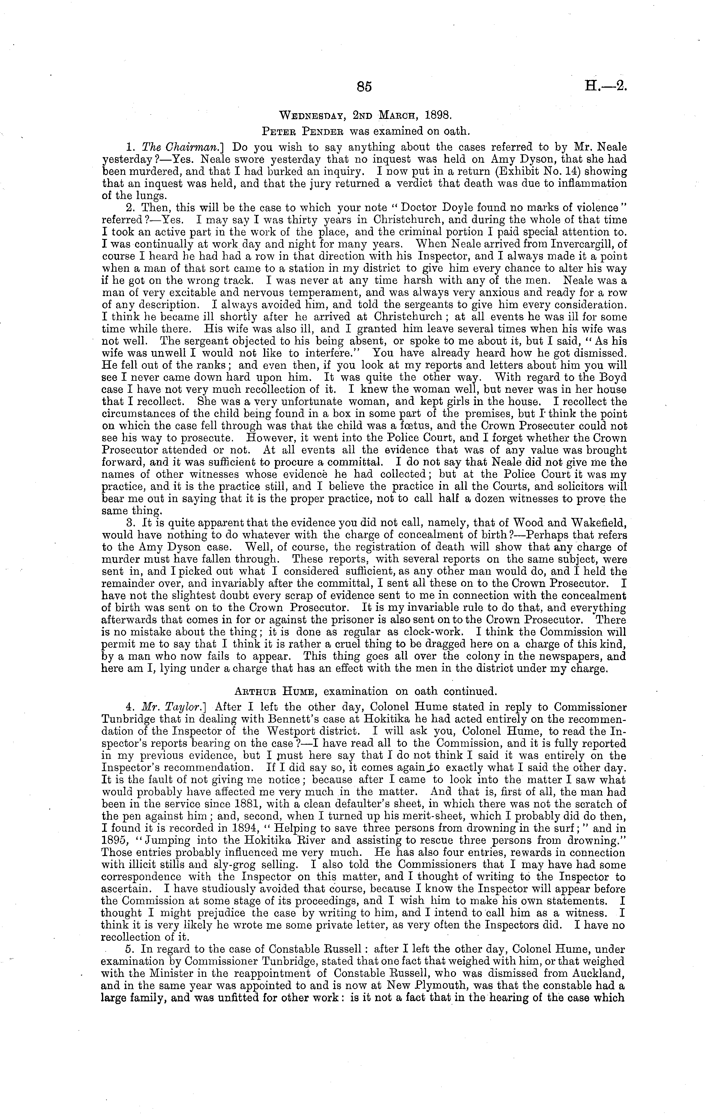 Wednesday, 2nd March, 1898. Petbe Pendeh was examined on oath. 1. The Chairman.'] Do you wish to say anything about the cases referred to by Mr. Neale yesterday ?—Yes. Neale swore yesterday that no inquest was held on Amy Dyson, that she had been murdered, and that I had burked an inquiry. I now put in a return (Exhibit No. 14) showing that an inquest was held, and that the jury returned a verdict that death was due to inflammation of the lungs. 2. Then, this will be the case to which your note " Doctor Doyle found no marks of violence " referred ?—Yes. I may say I was thirty years in Christchurch, and during the whole of that time I took an active part in the work of the place, and the criminal portion I paid special attention to. I was continually at work day and night for many years. When Neale arrived from Invercargill, of course I heard he had had a row in that direction with his Inspector, and I always made it a point when a man of that sort came to a station in my district to give him every chance to alter his way if he got on the wrong track. I was never at any time harsh with any of the men. Neale was a man of very excitable and nervous temperament, and was always very anxious and ready for a row of any description. I always avoided him, and told the sergeants to give him every consideration. I think he became ill shortly after he arrived at Christchurch ; at all events he was ill for some time while there. His wife was also ill, and I granted him leave several times when his wife was not well. The sergeant objected to his being absent, or spoke to me about it, but I said, "As his wife was unwell I would not like to interfere." You have already heard how he got dismissed. He fell out of the ranks; and even then, if you look at my reports and letters about him you will see I never came down hard upon him. It was quite the other way. With regard to the Boyd case I have not very much recollection of it. I knew the woman well, but never was in her house that I recollect. She was a very unfortunate woman, and kept girls in the house. I recollect the circumstances of the child being found in a box in some part of the premises, but I think the point on which the case fell through was that the child was a foetus, and the Crown Prosecuter could not see his way to prosecute. However, it went into the Police Court, and I forget whether the Crown Prosecutor attended or not. At all events all the evidence that was of any value was brought forward, and it was sufficient to procure a committal. Ido not say that Neale did not give me the names of other witnesses whose evidence he had collected; but at the Police Court it was my practice, and it is the practice still, and I believe the practice in all the Courts, and solicitors will bear me out in saying that it is the proper practice, not to call half a dozen witnesses to prove the same thing. 3. It is quite apparent that the evidence you did not call, namely, that of Wood and Wakefield, would have nothing to do whatever with the charge of concealment of birth ?—Perhaps that refers to the Amy Dyson case. Well, of course, the registration of death will show that any charge of murder must have fallen through. These reports, with several reports on the same subject, were sent in, and I picked out what I considered sufficient, as any other man would do, and I held the remainder over, and invariably after the committal, I sent all these on to the Crown Prosecutor. I have not the slightest doubt every scrap of evidence sent to me in connection with the concealment of birth was sent on to the Crown Prosecutor. It is my invariable rule to do that, and everything afterwards that comes in for or against the prisoner is also sent on to the Crown Prosecutor. There is no mistake about the thing; it is done as regular as clock-work. I think the Commission will permit me to say that I think it is rather a cruel thing to be dragged here on a charge of this kind, by a man who now fails to appear. This thing goes all over the colony in the newspapers, and here am I, lying under a charge that has an effect with the men in the district under my charge. Arthur Hume, examination on oath continued. 4. Mr. Taylor.] After I left the other day, Colonel Hume stated in reply to Commissioner Tunbridge that in dealing with Bennett's case at Hokitika he had acted entirely on the recommendation of the Inspector of the Westport district. I will ask you, Colonel Hume, to read the Inspector's reports bearing on the case ?—I have read all to the Commission, and it is fully reported in my previous evidence, but I jnust here say that 1 do not think I said it was entirely on the Inspector's recommendation. If I did say so, it comes again _fco exactly what I said the other day. It is the fault of not giving me notice; because after I came to look into the matter I saw what would probably have affected me very much in the matter. And that is, first of all, the man had been in the service since 1881, with a clean defaulter's sheet, in which there was not the scratch of the pen against him; and, second, when I turned up his merit-sheet, which I probably did do then, I found it is recorded in 1894, " Helping to save three persons from drowning in the surf; " and in 1895, "Jumping into the Hokitika River and assisting to rescue three persons from drowning." Those entries probably influenced me very much. He has also four entries, rewards in connection with illicit stills and sly-grog selling. I also told the Commissioners that I may have had some correspondence with the Inspector on this matter, and I thought of writing to the Inspector to ascertain. I have studiously avoided that course, because I know the Inspector will appear before the Commission at some stage of its proceedings, and I wish him to make his own statements. I thought I might prejudice the case by writing to him, and I intend to call him as a witness. I think it is very likely he wrote me some private letter, as 