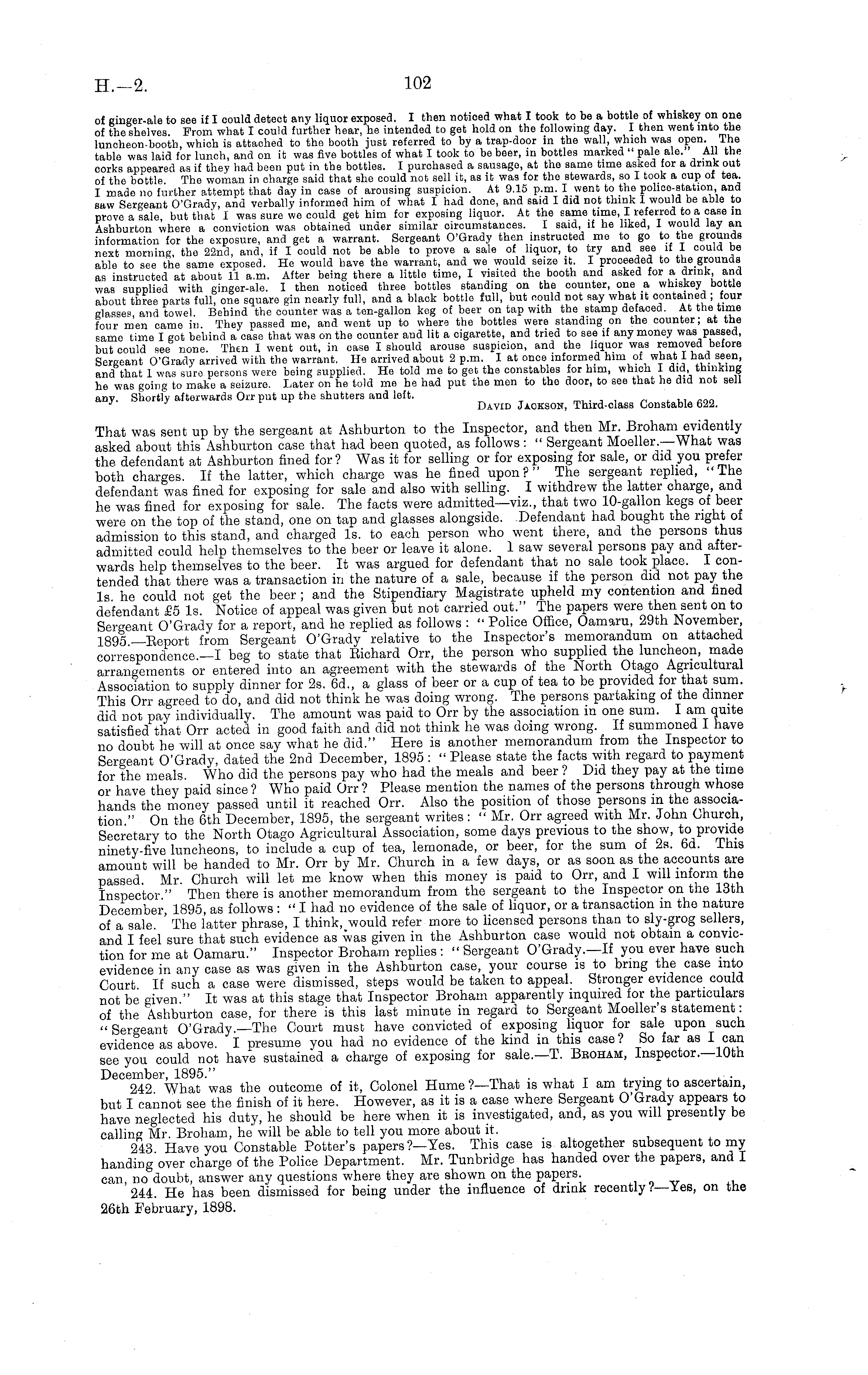 of Ringer-ale to see if I could detect any liquor exposed. I then noticed what I took to be a bottle of whiskey on one of the shelves From what I could further hear, he intended to get hold on the following day. I then went into the luncheon-booth, which is attached to the booth just referred to by a trap-door in the wall, which was open. The table was laid for lunch, and on it was five bottles of what I took to be beer, in bottles marked " pale ale. All the corks appeared as if they had been put in the bottles. I purchased a sausage, at the same time asked for a drink out of the bottle The woman in charge said that she could not sell it, as it waa for the stewards, so I took a cup of tea. I made no further attempt that day in case of arousing suspicion. At 9.15 p.m. I went to the police-station, and saw Sergeant O'Gradv, and verbally informed him of what I ha,d done, and said I did not think I would be able to prove a sale but that I was sure we could get him for exposing liquor. At the same time, I referred to a case in Ashburton where a conviction was obtained under similar circumstances. I said, if he liked, 1 would lay an information for the exposure, and get a warrant. Sergeant O'Grady then instructed me to go to the grounds next morning, the 22nd, and, if I could not be able to prove a sale of liquor, to try and see if I could be able to see the same exposed. He would have the warrant, and we would seize it. I proceeded to the grounds as instructed at about 11 a.m. After being there a little time, I visited the booth and asked for a drink, and was supplied with ginger-ale. I then noticed three bottles standing on the counter, one a whiskey bottle about three parts full, one square gin nearly full, and a black bottle full, but could not say what it contained ; four glasses and towel Behind the counter was a ten-gallon keg of beer on tap with the stamp defaced. At the time four men came in They passed me, and went up to where the bottles were standing on the counter; at the same time I got behind a case that was on the counter and lit a cigarette, and tried to see if any money was passed, but could pee none. Then I went out, in case I should arouse suspicion, and the liquor was removed before Sergeant O'Gracly arrived with the warrant. He arrived about 2 p.m. lat once informed him of what I had seen, and that 1 was sure persons were being supplied. He told me to get the constables for him, which I did, thinking he was going to make a seizure. Later on he told me he had put the men to the door, to see that he did not sell any. Shortly afterwards Orr put up the shutters and left. • ? • * r i- David Jackson, Third-class Constable 622. That was sent up by the sergeant at Ashburton to the Inspector, and then Mr. Broham evidently asked about this Ashburton case that had been quoted, as follows: " Sergeant Moeller.—What was the defendant at Ashburton fined for? Was it for selling or for exposing for sale, or did you prefer both charges. If the latter, which charge was he fined upon?" The sergeant replied, "The defendant was fined for exposing for sale and also with selling. I withdrew the latter charge and he was fined for exposing for sale. The facts were admitted—viz., that two 10-gallon kegs of beer were on the top of the stand, one on tap and glasses alongside. Defendant had bought the right of admission to this stand, and charged Is. to each person who went there, and the persons thus admitted could help themselves to the beer or leave it alone. 1 saw several persons pay and afterwards help themselves to the beer. It was argued for defendant that no sale took place. I contended that there was a transaction in the nature of a sale, because if the person did not pay the Is he could not get the beer ; and the Stipendiary Magistrate upheld my contention and fined defendant £5 Is. Notice of appeal was given but not carried out." The papers were then sent on to Sergeant O'Grady for a report, and he replied as follows : " Police Office, Oamaru, 29th November, 1895—Eeport from Sergeant O'Grady relative to the Inspector's memorandum on attached correspondence.—l beg to state that Bichard Orr, the person who supplied the luncheon, made arrangements or entered into an agreement with the stewards of the North Otago Agricultural Association to supply dinner for 2s. 6d., a glass of beer or a cup of tea to be provided for that sum. This Orr agreed to do, and did not think he was doing wrong. The persons partaking oi the dinner did not pay individually. The amount was paid to Orr by the association in one sum. lam quite satisfied that Orr acted in good faith and did not think he was doing wrong. If summoned I have no doubt he will at once say what he did." Here is another memorandum from the Inspector to Sergeant O'Grady, dated the 2nd December, 1895 : " Please state the facts with regard to payment for the meals Who did the persons pay who had the meals and beer ? Did they pay at the time or have they paid since ? Who paid Orr ? Please mention the names of the persons through whose hands the money passed until it reached Orr. Also the position of those persons m the association " On the 6th December, 1895, the sergeant writes : " Mr. Orr agreed with Mr. John Church, Secretary to the North Otago Agricultural Association, some days previous to the show, to provide ninety-five luncheons, to include a cup of tea, lemonade, or beer, for the sum of 2s. bd. Ihis amount will be handed to Mr. Orr by Mr. Church in a few days, or as soon as the accounts are passed Mr. Church will let me know when this money is paid to Orr, and I will inform the Inspector " Then there is another memorandum from the sergeant to the Inspector on the 13th December 1895, as follows : " I had no evidence of the sale of liquor, or a transaction in the nature of a sale The latter phrase, I think, would refer more to licensed persons than to sly-grog sellers, and I feel sure that such evidence as was given in the Ashburton