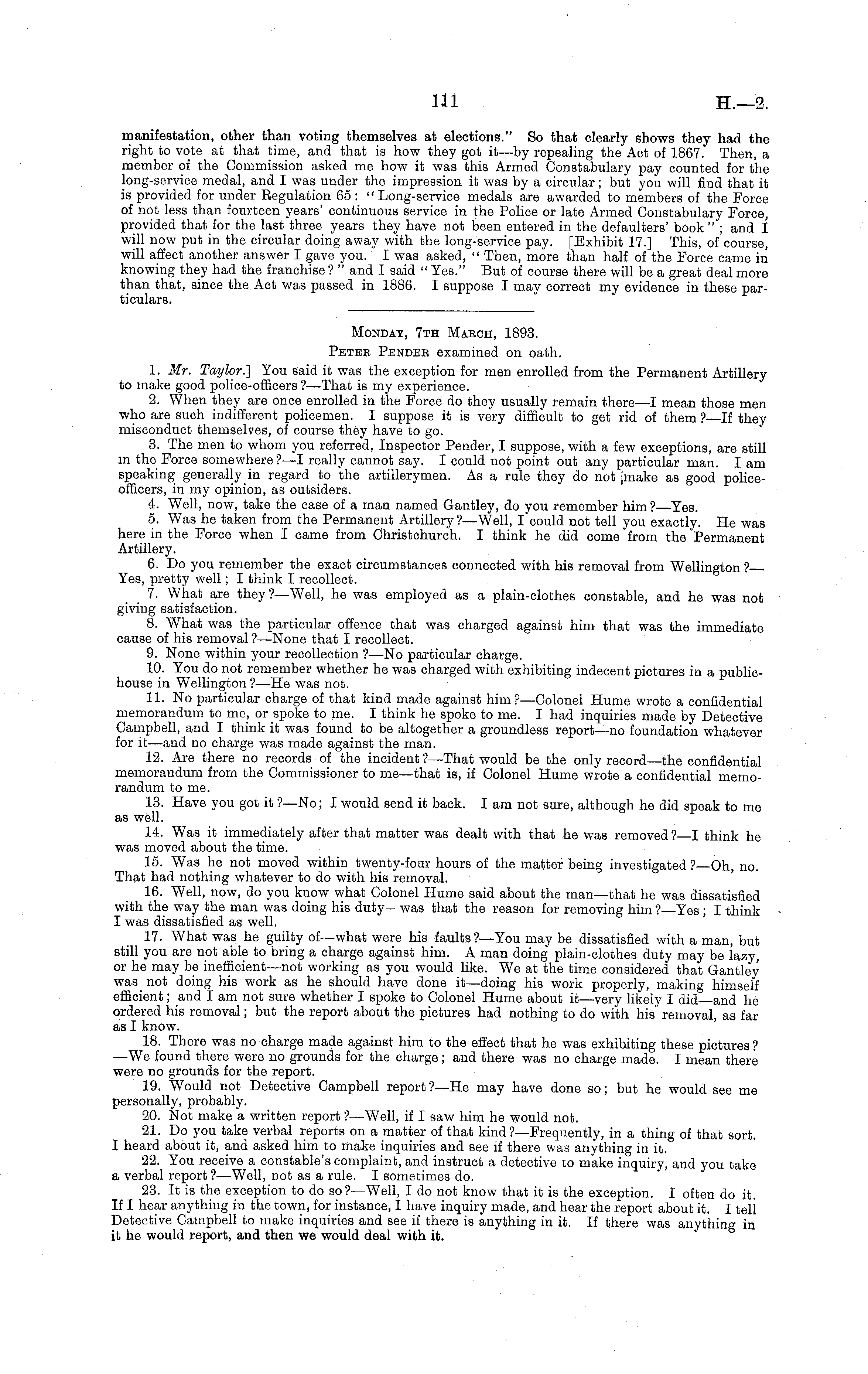 Monday, 7th Maech, 1893. Petee Pendee examined on oath. 1. Mr. Taylor.] You said it was the exception for men enrolled from the Permanent Artillery to make good police-officers ?—That is my experience. 2. When they are once enrolled in the Force do they usually remain there—l mean those men who are such indifferent policemen. I suppose it is very difficult to get rid of them ? If they misconduct themselves, of course they have to go. 3. The men to whom you referred, Inspector Pender, I suppose, with a few exceptions, are still m the Force somewhere?—l really cannot say. I could not point out any particular man. lam speaking generally in regard to the artillerymen. As a rule they do not as good policeofficers, in my opinion, as outsiders. 4. Well, now, take the case of a man named Gantley, do you remember him?— Yes. 5. Was he taken from the Permanent Artillery? —Well, I could not tell you exactly. He was here in the Force when I came from Christchurch. I think he did come from the Permanent Artillery. 6. Do you remember the exact circumstances connected with his removal from Wellington ? Yes, pretty well; I think I recollect. 7. What are they?— Well, he was employed as a plain-clothes constable, and he was not giving satisfaction. 8. What was the particular offence that was charged against him that was the immediate cause of his removal ?—-None that I recollect. 9. None within your recollection ?—No particular charge. 10. You do not remember whether he was charged with exhibiting indecent pictures in a publichouse in Wellington ?—He was not. 11. No particular charge of that kind made against him?— Colonel Hume wrote a confidential memorandum to me, or spoke to me. I think he spoke to me. I had inquiries made by Detective Campbell, and I think it was found to be altogether a groundless report—no foundation whatever for it—and no charge was made against the man. 12. Are there no records of the incident?— That would be the only record—the confidential memorandum from the Commissioner to me—that is, if Colonel Hume wrote a confidential memorandum to me. 13. Have you got it ?—No; I would send it back. lam not sure, although he did speak to me as well. 14. Was it immediately after that matter was dealt with that he was removed?—l think he was moved about the time. 15. Was he not moved within twenty-four hours of the matter being investigated ? Oh, no. That had nothing whatever to do with his removal. 16. Well, now, do you know what Colonel Hume said about the man—that he was dissatisfied with the way the man was doing his duty— was that the reason for removing him ? Yes ; I think I was dissatisfied as well. 17. What was he guilty of—what were his faults?— You may be dissatisfied with a man, but still you are not able to bring a charge against him. A man doing plain-clothes duty may be lazy, or he may be inefficient—not working as you would like. We at the time considered that Gantley was not doing his work as he should have done it—doing his work properly, making himself efficient; and lam not sure whether I spoke to Colonel Hume about it—very likely I did and he ordered his removal; but the report about the pictures had nothing to do with his removal, as far as I know. 18. There was no charge made against him to the effect that he was exhibiting these pictures ? —We found there were no grounds for the charge; and there was no charge made. I mean there were no grounds for the report. 19. Would not Detective Campbell report ?—He may have done so; but he would see me personally, probably. 20. Not make a written report ?—Well, if I saw him he would not. 21. Do you take verbal reports on a matter of that kind?— Frequently, in a thing of that sort. I heard about it, and asked him to make inquiries and see if there was anything in it. 22. You receive a constable's complaint, and instruct a detective to make inquiry, and you take a verbal report ?—Well, not as a rule. I sometimes do. 23. It is the exception to do so ? —Well, Ido not know that it is the exception. I often do it. If I hear anything in the town, for instance, I have inquiry made, and hear the report about it. I teli Detective Campbell to make inquiries and see if there is anything in it. If there was anything in it he would report, and then we would deal with it.