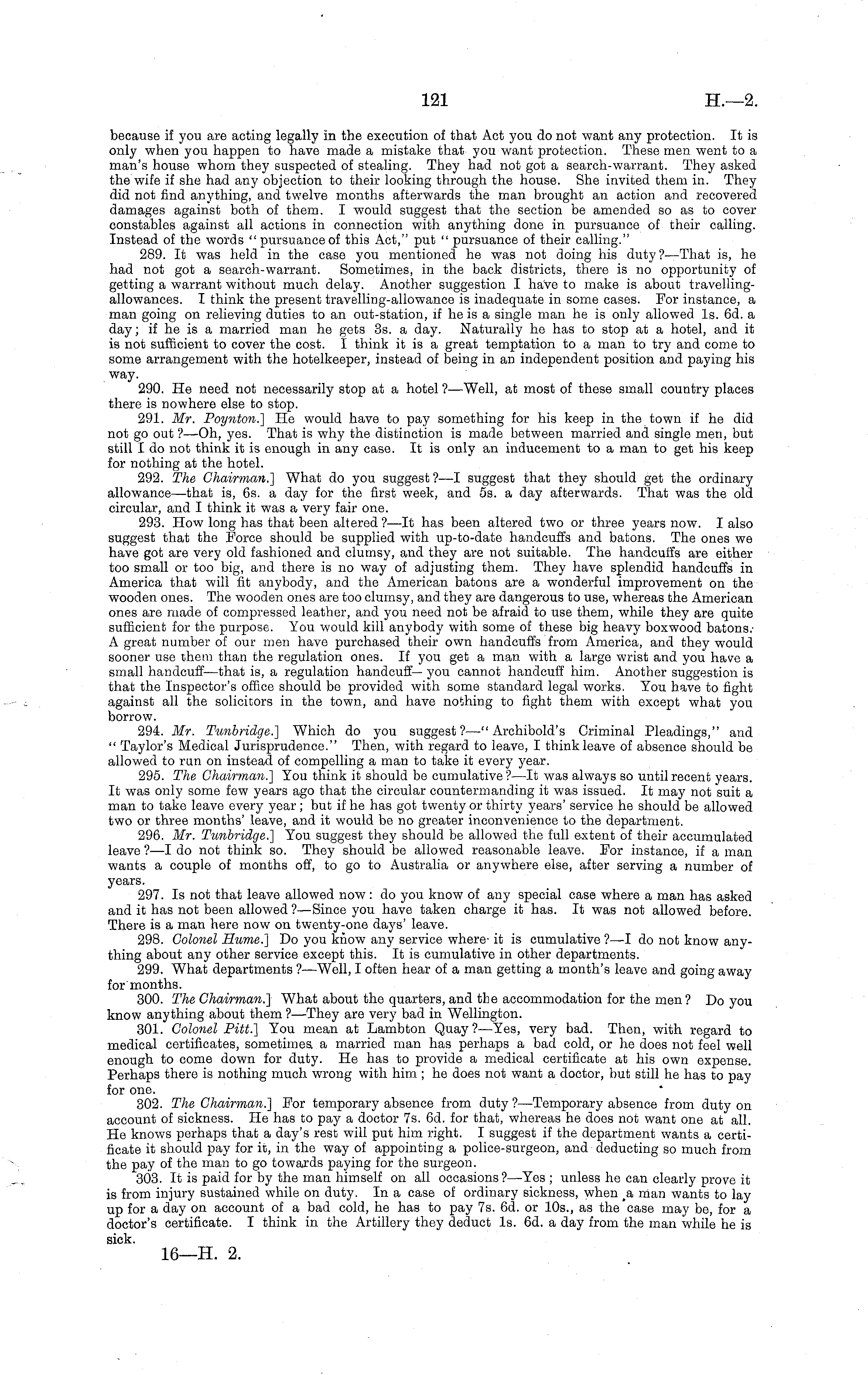 because if you are acting legally in the execution of that Act you do not want any protection. It is only when you happen to have made a mistake that you want protection. These men went to a man's house whom they suspected of stealing. They had not got a search-warrant. They asked the wife if she had any objection to their looking through the house. She invited them in. They did not find anything, and twelve months afterwards the man brought an action and recovered damages against both of them. I would suggest that the section be amended so as to cover constables against all actions in connection with anything done in pursuance of their calling. Instead of the words "pursuance of this Act," put " pursuance of their calling." 289. It was held in the case you mentioned he was not doing his duty?— That is, he had not got a search-warrant. Sometimes, in the back districts, there is no opportunity of getting a warrant without much delay. Another suggestion I have to make is about travellingallowances. I think the present travelling-allowance is inadequate in some cases. For instance, a man going on relieving duties to an out-station, if he is a single man he is only allowed Is. 6d. a day; if he is a married man he gets 3s. a day. Naturally he has to stop at a hotel, and it is not sufficient to cover the cost. I think it is a great temptation to a man to try and come to some arrangement with the hotelkeeper, instead of being in an independent position and paying his way. 290. He need not necessarily stop at a hotel ? —Well, at most of these small country places there is nowhere else to stop. 291. Mr. Poynton.] He would have to pay something for his keep in the town if he did not go out ?—Oh, yes. That is why the distinction is made between married and single men, but still Ido not think it is enough in any case. It is only an inducement to a man to get his keep for nothing at the hotel. 292. The Chairman.] What do you suggest ? —I suggest that they should get the ordinary allowance —that is, 6s. a day for the first week, and ss. a day afterwards. That was the old circular, and I think it was a very fair one. 293. How long has that been altered?—lt has been altered two or three years now. I also suggest that the Force should be supplied with up-to-date handcuffs and batons. The ones we have got are very old fashioned and clumsy, and they are not suitable. The handcuffs are either too small or too big, and there is no way of adjusting them. They have splendid handcuffs in America that will fit anybody, and the American batons are a wonderful improvement on the wooden ones. The wooden ones are too clumsy, and they are dangerous to use, whereas the American ones are made of compressed leather, and you need not be afraid to use them, while they are quite sufficient for the purpose. You would kill anybody with some of these big heavy boxwood batons.A great number of our men have purchased their own handcuffs from America, and they would sooner use them than the regulation ones. If you get a man with a large wrist and you have a small handcuff —that is, a regulation handcuff— you cannot handcuff him. Another suggestion is that the Inspector's office should be provided with some standard legal works. You have to fight against all the solicitors in the town, and have nothing to fight them with except what you borrow. 294. Mr. Tunbridge.] Which do you suggest?—" Archibold's Criminal Pleadings," and " Taylor's Medical Jurisprudence." Then, with regard to leave, I think leave of absence should be allowed to run on instead of compelling a man to take it every year. 295. The Chairman.] You think it should be cumulative ?—lt was always so until recent years. It was only some few years ago that the circular countermanding it was issued. It may not suit a man to take leave every year; but if he has got twenty or thirty years' service he should be allowed two or three months' leave, and it would be no greater inconvenience to the department. 296. Mr. Tunbridge.] You suggest they should be allowed the full extent of their accumulated leave ? —I do not think so. They should be allowed reasonable leave. For instance, if a man wants a couple of months off, to go to Australia or anywhere else, after serving a number of years. 297. Is not that leave allowed now : do you know of any special case where a man has asked and it has not been allowed ?—Since you have taken charge it has. It was not allowed before. There is a man here now on twenty-one days' leave. 298. Colonel Hume.] Do you know any service where- it is cumulative?—l do not know anything about any other service except this. It is cumulative in other departments. 299. What departments ?—Well, I often hear of a man getting a month's leave and going away for'months. 300. The Chairman.] What about the quarters, and the accommodation for the men? Do you know anything about them ? —They are very bad in Wellington. 301. Colonel Pitt.] You mean at Lambton Quay ?—Yes, very bad. Then, with regard to medical certificates, sometimes, a married man has perhaps a bad cold, or he does not feel well enough to come down for duty. He has to provide a medical certificate at his own expense. Perhaps there is nothing much wrong with him ; he does not want a doctor, but still he has to pay for one. 302. The Chairman.] For temporary absence from duty ? —Temporary absence from duty on account of sickness. He has to pay a doctor 7s. 6d. for that, whereas he does not want one at all. He knows perhaps that a day's rest will put him right. I suggest if the department wants a certificate it should pay for it, in the way of appointing a police-surgeon, and deducting so much from the pay of the man to go towards paying for the surgeon. 303. It is paid for by the man himself on all occasions?— Yes ; unless he can clearly prove it is from injury sustained while on duty. In a case of ordinary sickness, when a man wants to lay up for a day on account of a 