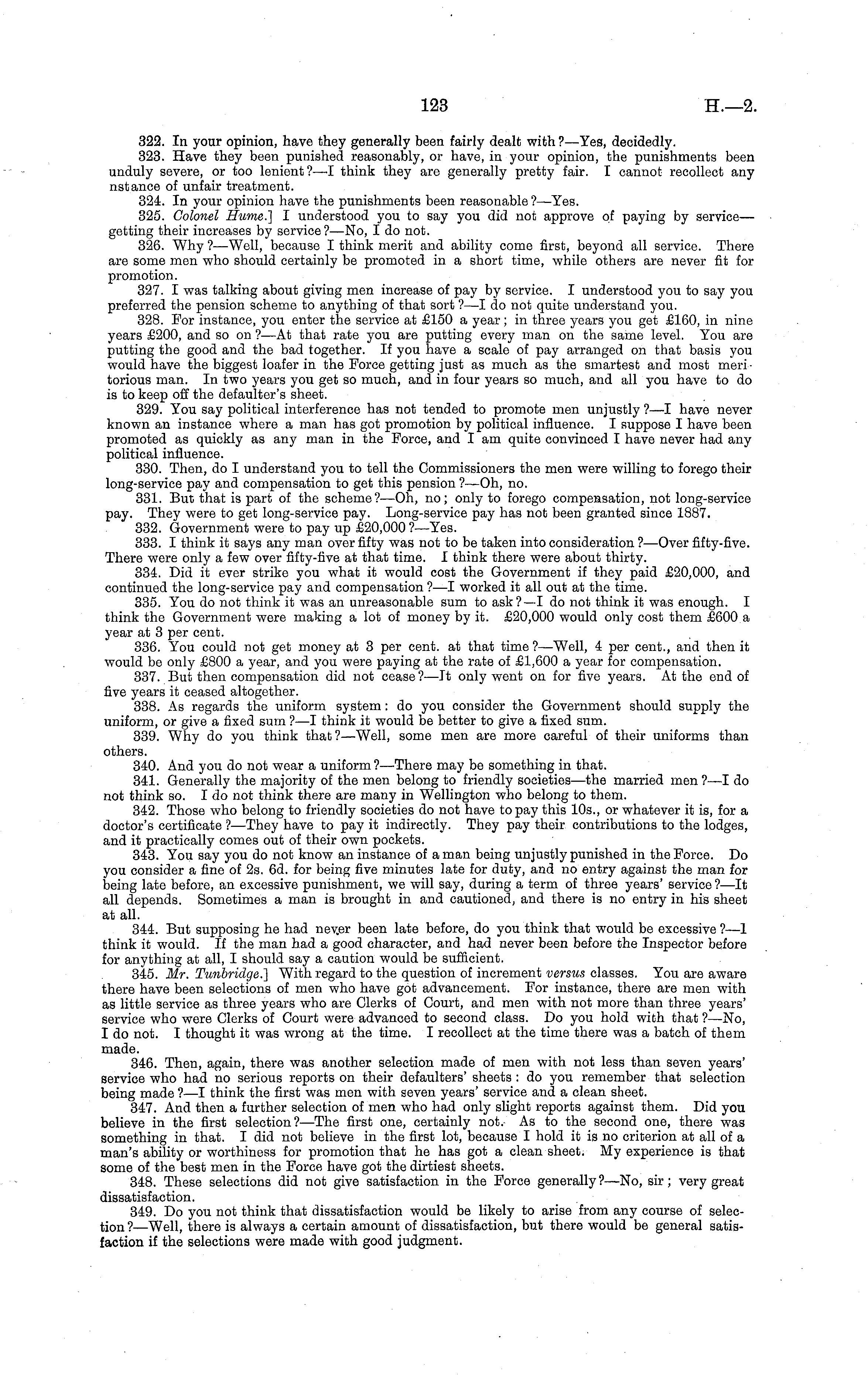 322. In your opinion, have they generally been fairly dealt with?— Yes, decidedly. 323. Have they been punished reasonably, or have, in your opinion, the punishments been unduly severe, or too lenient?—l think they are generally pretty fair. I cannot recollect any nstanee of unfair treatment. 324. In your opinion have the punishments been reasonable ?—Yes. 325. Colonel Hume.] I understood you to say you did not approve of paying by service— getting their increases by service ? —No, I do not. 326. Why ? —Well, because I think merit and ability come first, beyond all service. There are some men who should certainly be promoted in a short time, while others are never fit for promotion. 327. I was talking about giving men increase of pay by service. I understood you to say you preferred the pension scheme to anything of that sort ?—I do not quite understand you. 328. For instance, you enter the service at £150 a year; in three years you get £160, in nine years £200, and so on ? —At that rate you are putting every man on the same level. You are putting the good and the bad together. If you have a scale of pay arranged on that basis you would have the biggest loafer in the Force getting just as much as the smartest and most meritorious man. In two years you get so much, and in four years so much, and all you have to do is to keep off the defaulter's sheet. 329. You say political interference has not tended to promote men unjustly ?—I have never known an instance where a man has got promotion by political influence. I suppose I have been promoted as quickly as any man in the Force, and I am quite convinced I have never had any political influence. 330. Then, do I understand you to tell the Commissioners the men were willing to forego their long-service pay and compensation to get this pension ?—Oh, no. 331. But that is part of the scheme? —Oh, no; only to forego compensation, not long-service pay. They were to get long-service pay. Long-service pay has not been granted since 1887. 332. Government were to pay up £20,000 ?—Yes. 333. I think it says any man over fifty was not to be taken into consideration ?—Over fifty-five. There were only a few over fifty-five at that time. I think there were about thirty. 334. Did it ever strike you what it would cost the Government if they paid £20,000, and continued the long-service pay and compensation ?—I worked it all out at the time. 335. You do not think it was an unreasonable sum to ask?—l do not think it was enough. I think the Government were making a lot of money by it. £20,000 would only cost them £600 a year at 3 per cent. 336. You could not get money at 3 per cent, at that time?— Well, 4 per cent., and then it would be only £800 a year, and you were paying at the rate of £1,600 a year for compensation. 337. But then compensation did not cease?—lt only went on for five years. At the end of five years it ceased altogether. 338. As regards the uniform system: do you consider the Government should supply the uniform, or give a fixed sum ? —I think it would be better to give a fixed sum. 339. Why do you think that?— Well, some men are more careful of their uniforms than others. 340. And you do not wear a uniform?— There may be something in that. 341. Generally the majority of the men belong to friendly societies —the married men ? —I do not think so. Ido not think there are many in Wellington who belong to them. 342. Those who belong to friendly societies do not have to pay this 10s., or whatever it is, for a doctor's certificate ?—They have to pay it indirectly. They pay their contributions to the lodges, and it practically comes out of their own pockets. 343. You say you do not know an instance of a man being unjustly punished in the Force. Do you consider a fine of 2s. 6d. for being five minutes late for duty, and no entry against the man for being late before, an excessive punishment, we will say, during a term of three years' service ?—lt all depends. Sometimes a man is brought in and cautioned, and there is no entry in his sheet at all. 344. But supposing he had never been late before, do you think that would be excessive ?—1 think it would. If the man had a good character, and had never been before the Inspector before for anything at all, I should say a caution would be sufficient. 345. Mr. Tunbridge.] With regard to the question of increment versus classes. You are aware there have been selections of men who have got advancement. For instance, there are men with as little service as three years who are Clerks of Court, and men with not more than three years' service who were Clerks of Court were advanced to second class. Do you hold with that ?—No, Ido not. I thought it was wrong at the time. I recollect at the time there was a batch of them made. 346. Then, again, there was another selection made of men with not less than seven years' service who had no serious reports on their defaulters' sheets : do you remember that selection being made ?—I think the first was men with seven years' service and a clean sheet. 347. And then a further selection of men who had only slight reports against them. Did you believe in the first selection? —The first one, certainly not. As to the second one, there was something in that. I did not believe in the first lot, because I hold it is no criterion at all of a man's ability or worthiness for promotion that he has got a clean sheet. My experience is that some of the best men in the Force have got the dirtiest sheets. 348. These selections did not give satisfaction in the Force generally ?—No, sir; very great dissatisfaction. 349. Do you not think that dissatisfaction would be likely to arise from any course of selection ? —Well, there is always a certain amount of dissatisfaction, but there would be general satisfaction if the selections were made with good judgment.