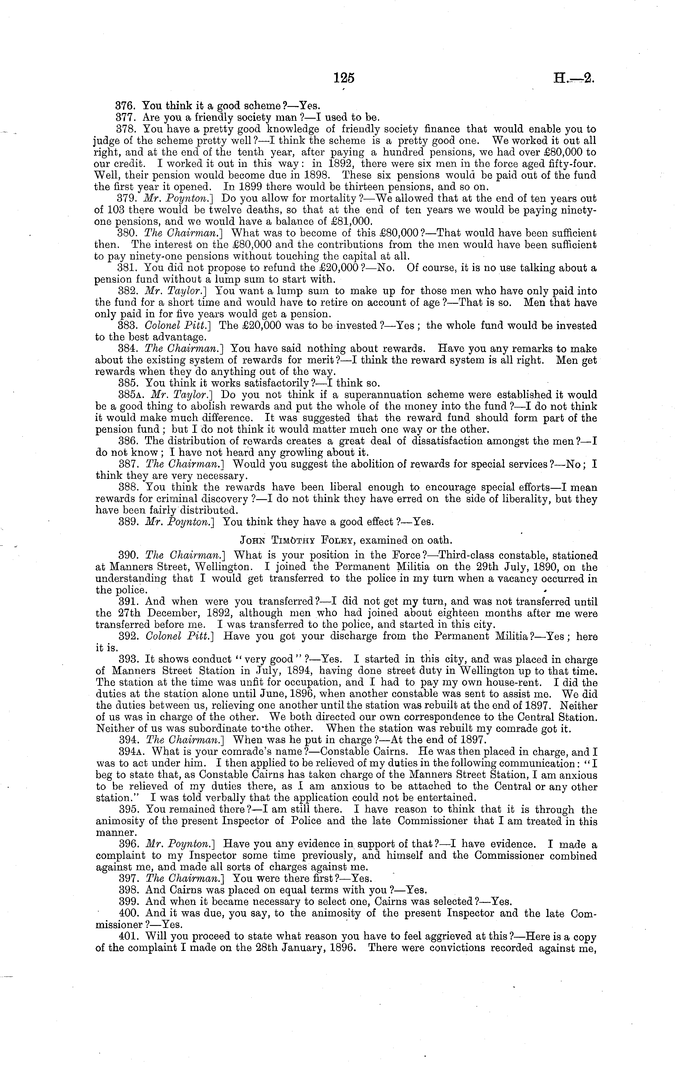 376. You think it a good scheme ?—Yes. 377. Are you a friendly society man ?—I used to be. 378. You have a pretty good knowledge of friendly society finance that would enable you to judge of the scheme pretty well ?—I think the scheme is a pretty good one. We worked it out all right, and at the end of the tenth year, after paying a hundred pensions, we had over £80,000 to our credit. I worked it out in this way :in 1892, there were six men in the force aged fifty-four. Well, their pension would become due in 1898. These six pensions would be paid out of the fund the first year it opened. In 1899 there would be thirteen pensions, and so on. 379. Mr. Poynton.] Do you allow for mortality ? —We allowed that at the end of ten years out of 103 there would be twelve deaths, so that at the end of ten years we would be paying ninetyone pensions, and we would have a balance of £81,000. 380. The Chairman.] What was to become of this £80,000 ? —That would have been sufficient then. The interest on the £80,000 and the contributions from the men would have been sufficient to pay ninety-one pensions without touching the capital at all. 381. You did not propose to refund the £20,000 ? —No. Of course, it is no use talking about a pension fund without a lump sum to start with. 382. Mr. Taylor.] You want a lump sum to make up for those men who have only paid into the fund for a short time and would have to retire on account of age ?—That is so. Men that have only paid in for five years would get a pension. 383. Colonel Pitt.] The £20,000 was to be invested ?—Yes ; the whole fund would be invested to the best advantage. 384. The Chairman.] You have said nothing about rewards. Have you any remarks to make about the existing system of rewards for merit?—l think the reward system is all right. Men get rewards when they do anything out of the way. 385. You think it works satisfactorily?—l think so. 385 a. Mr. Taylor.] Do you not think if a superannuation scheme were established it would be a good thing to abolish rewards and put the whole of the money into the fund ? —I do not think it would make much difference. It was suggested that the reward fund should form part of the pension fund; but Ido not think it would matter much one way or the other. 386. The distribution of rewards creates a great deal of dissatisfaction amongst the men ?—I do not know; I have not heard any growling about it. 387. The Chairman.] Would you suggest the abolition of rewards for special services?—>No; I think they are very necessary. 388. You think the rewards have been liberal enough to encourage special efforts—l mean rewards for criminal discovery ?—I do not think they have erred on the side of liberality, but they have been fairly distributed. 389. Mr. Poynton.] You think they have a good effect ? —Yes. John Timothy Foley, examined on oath. 390. The Chairman.] What is your position in the Force?— Third-class constable, stationed at Manners Street, Wellington. I joined the Permanent Militia on the 29th July, 1890, on the understanding that I would get transferred to the police in my turn when a vacancy occurred in the police. 391. And when were you transferred?—l did not get my turn, and was not transferred until the 27th December, 1892, although men who had joined about eighteen months after me were transferred before me. I was transferred to the police, and started in this city. 392. Colonel Pitt.] Have you got your discharge from the Permanent Militia?— Yes; here it is. 393. It shows conduct "very good" ?—Yes. I started in this city, and was placed in charge of Manners Street Station in July, 1894, having done street duty in Wellington up to that time. The station at the time was unfit for occupation, and I had to pay my own house-rent. I did the duties at the station alone until June, 1896, when another constable was sent to assist me. We did the duties between us, relieving one another until the station was rebuilt at the end of 1897. Neither of us was in charge of the other. We both directed our own correspondence to the Central Station. Neither of us was subordinate to"the other. When the station was rebuilt my comrade got it. 394. The Chairman.] When was he put in charge ? —At the end of 1897. 394 a. What is your comrade's name? —Constable Cairns. He was then placed in charge, and I was to act under him. I then applied to be relieved of my duties in the following communication :" I beg to state that, as Constable Cairns has taken charge of the Manners Street Station, I am anxious to be relieved of my duties there, as I am anxious to be attached to the Central or any other station." I was told verbally that the application could not be entertained. 395. You remained there ? —I am still there. I have reason to think that it is through the animosity of the present Inspector of Police and the late Commissioner that I am treated in this manner. 396. Mr. Poynton.] Have you any evidence in support of that ?—I have evidence. I made a complaint to my Inspector some time previously, and himself and the Commissioner combined against me, and made all sorts of charges against me. 397. The Chairman.] You were there first ?—Yes. 398. And Cairns was placed on equal terms with you ?—Yes. 399. And when it became necessary to select one, Cairns was selected ?—Yes. 400. And it was due, you say, to the animosity of the present Inspector and the late Commissioner ?—Yes. 401. Will you proceed to state what reason you have to feel aggrieved at this ?—Here is a copy of the complaint I made on the 28th January, 1896. There were convictions recorded against me,