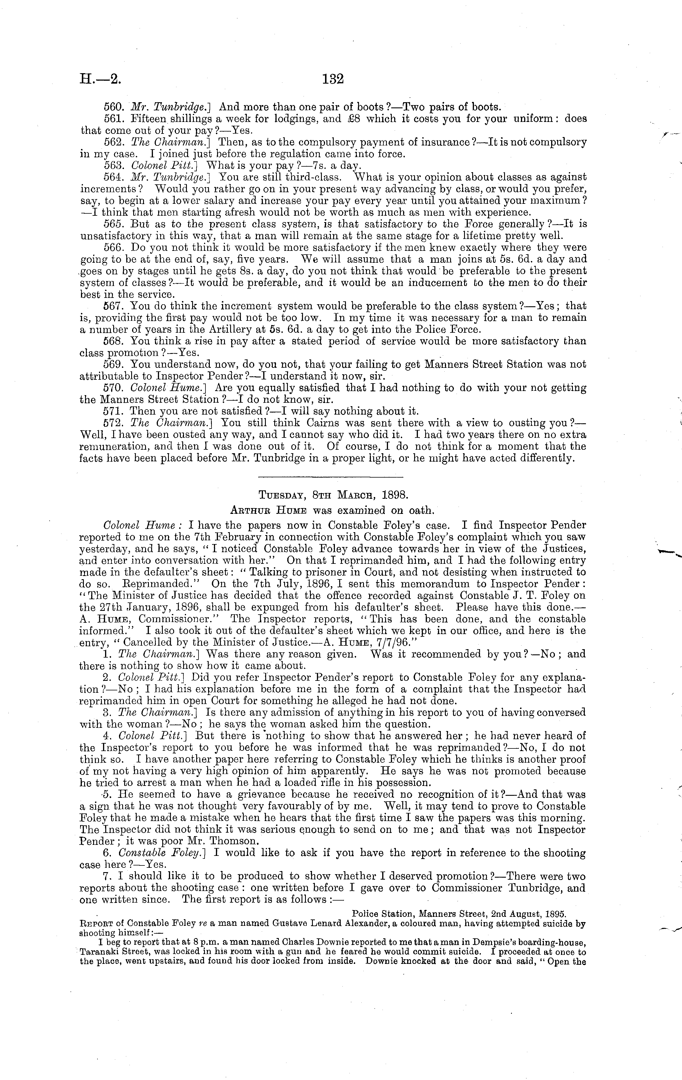 Tuesday, Bth Mabch, 1898. Aethue Hume was examined on oath. Colonel Hume : I have the papers now in Constable Foley's case. I find Inspector Pender reported to me on the 7th February in connection with Constable Foley's complaint which you saw yesterday, and he says, " I noticed Constable Foley advance towards her in view of the Justices, and enter into conversation with her." On that I reprimanded him, and I had the following entry made in the defaulter's sheet: " Talking to prisoner in Court, and not desisting when instructed to do so. Eeprimanded." On the 7th July, 1896, I sent this memorandum to Inspector Pender: "The Minister of Justice has decided that the offence recorded against Constable J. T. Foley on the 27th January, 1896, shall be expunged from his defaulter's sheet. Please have this done. — A. Hume, Commissioner." The Inspector reports, " This has been done, and the constable informed." I also took it out of the defaulter's sheet which we kept in our office, and here is the entry, " Cancelled by the Minister of Justice.—A. Hume, 7/7/96." 1. The Chairman.] Was there any reason given. Was it recommended by you?—No; and there is nothing to show how it came about. 2. Colonel Pitt.] Did you refer Inspector Pender's report to Constable Foley for any explanation ?—No ; I had his explanation before me in the form of a complaint that the Inspector had reprimanded him in open Court for something he alleged he had not done. 3. The Chairman.] Is there any admission of anything in his report to you of having conversed with the woman ?—No ; he says the woman asked him the question. 4. Colonel Pitt.] But there is nothing to show that he answered her ; he had never heard of the Inspector's report to you before he was informed that he was reprimanded?—No, I do not think so. I have another paper here referring to Constable Foley which he thinks is another proof of my not having a very high opinion of him apparently. He says he was not promoted because he tried to arrest a man when he had a loaded rifle in his possession. ■5. He seemed to have a grievance because he received no recognition of it?— And that was a sign that he was not thought very favourably of by me. Well, it may tend to prove to Constable Foley that he made a mistake when he hears that the first time I saw the papers was this morning. The Inspector did not think it was serious enough to send on to me; and that was not Inspector Pender ; it was poor Mr. Thomson. 6. Constable Foley.] I would like to ask if you have the report in reference to the shooting case here? —Yes. 7. I should like it to be produced to show whether I deserved promotion ? —There were two reports about the shooting case : one written before I gave over to Commissioner Tunbridge, and one written since. The first report is as follows : — Police Station, Manners Street, 2nd August, 1895. Eepoet of Constable Foley re a man named Gustave Lenard Alexander, a coloured man, having attempted suicide by shooting himself:— I beg to report that at 8 p.m. a man named Charles Downie reported to me that a man in Dempsie's boarding-house, Taranaki Street, was locked in his room with a gun and he feared he would commit suicide. I proceeded at once to the place, went upstairs, and found his door locked from inside. Downie knocked at the door and said, " Open the