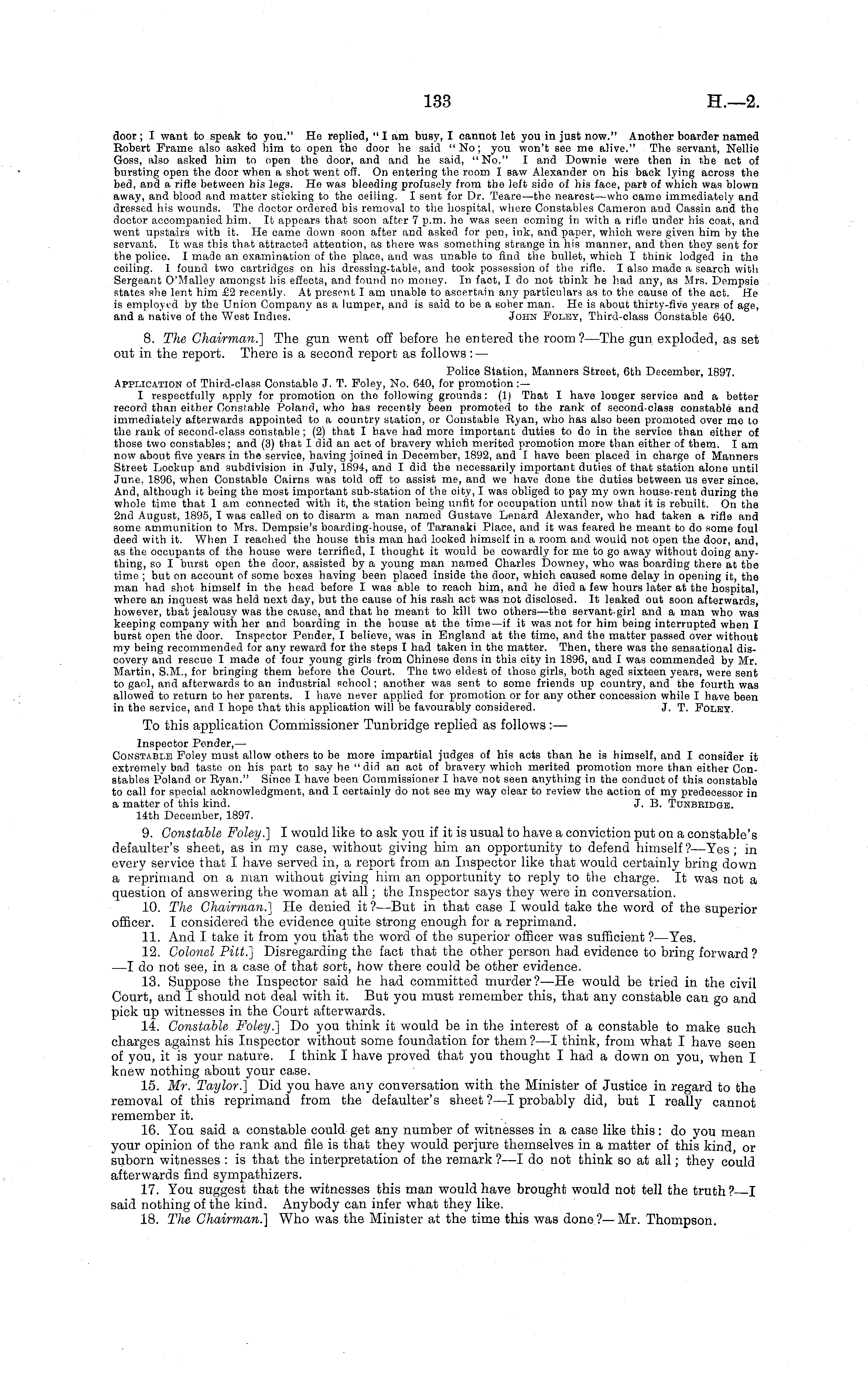 door ; I want to speak to you." He replied, "I am busy, I cannot let you in just now." Another boarder named Robert Frame also asked him to open the door he said "No; you won't see me alive." The servant, Nellie Goss, also asked him to open the door, and and he said, " No." I and Downie were then in the act of bursting open the door when a shot went oft. On entering the room I saw Alexander on his back lying across the bed, and a rifle between his legs. He was bleeding profusely from the left side of his face, part of which was blown away, and blood and matter sticking to the ceiling. I sent for Dr. Teare—the nearest—who came immediately and dressed his wounds. The doctor ordered bis removal to the hospital, where Constables Cameron and Cassin and the doctor accompanied him. It appears that soon after 7 p.m. he was seen coming in with a rifle under his coat, and went upstairs with it. He came down soon after and asked for pen, ink, and paper, which were given him by the servant. It was this that attracted attention, as there was something strange in his manner, and then they sent for the police. I made an examination of the place, and was unable to find the bullet, which I think lodged in the ceiling. I found two cartridges on his dressing-table, and took possession of the rifle. I also made a search with Sergeant O'Malley amongst his effects, and found no money. In fact, I do not think he had any, as Mrs. Dempsie states she lent him £2 recently. At present lam unable to ascertain any particulars as to the cause of the act. He is employed by the Union Company as a lumper, and is said to be a sober man. He is about thirty-five years of age, and a native of the West Indies. John Foley, Third-class Constable 640. 8. The Chairman.'] The gun went off before he entered the room?— The gun exploded, as set out in the report. There is a second report as follows : — Police Station, Manners Stroet, 6th December, 1897. Application of Third-class Constable J. T. Foley, No. 640, for promotion:— I respectfully apply for promotion on tho following grounds: (1) That I have longer service and a better record than either Constable Poland, who has recently been promoted to the rank of second-class constable and immediately afterwards appointed to a country station, or Constable Ryan, who has also been promoted over me to the rank of second-class constable ; (2) that I have had more important duties to do in the service than either of those two constables; and (3) that I did an act of bravery which merited promotion more than either of them. lam now about five years in the service, having joined in December, 1892, and I have been placed in charge of Manners Street Lookup and subdivision in July, 1894, and I did the necessarily important duties of that station alone until June. 1896, when Constable Cairns was told off to assist me, and we have done the duties between us ever since. And, although it being the most important sub-station of the city, I was obliged to pay my own house-rent during the whole time that I am connected with it, the station being unfit for occupation until now that it is rebuilt. On the 2nd August, 1895, I was called on to disarm a man named Gustave Lenard Alexander, who had taken a rifle and some ammunition to Mrs. Dempsie's boarding-house, of Taranaki Place, and it was feared he meant to do some foul deed with it. When I reached the house this man had locked himself in a room and would not open the door, and, as the occupants of the house were terrified, I thought it would be cowardly for me to go away without doing anything, so I burst open the door, assisted by a young man named Charles Downey, who was boarding there at the time ; but on account of some boxes having been placed inside the door, which caused some delay in opening it, the man had shot himself in the head before I was able to reach him, and he died a few hours later at the hospital, where an inquest was held next day, but the cause of his rash act was not disclosed. It leaked out soon afterwards, however, that jealousy was the cause, and that he meant to kill two others—the servant-girl and a man who was keeping company with her and boarding in the house at the time—if it was not for him being interrupted when I burst open the door. Inspector Pender, I believe, was in England at the time, and the matter passed over without my being recommended for any reward for the steps I had taken in the matter. Then, there was the sensational discovery and rescue I made of four young girls from Chinese dens in this city in 1896, and I was commended by Mr. Martin, S.M., for bringing them before the Court. The two eldest of those girls, both aged sixteen years, were sent to gaol, and afterwards to an industrial school; another was sent to some friends up country, and the fourth was allowed to return to her parents. I have never applied for promotion or for any other concession while I have been in the service, and I hope that this application will be favourably considered. J. T. Foley. To this application Commissioner Tunbridge replied as follows: — Inspector Pender, — Constable Foley must allow others to be more impartial judges of his acts than he is himself, and I consider it extremely bad taste on his part to say he " did an act of bravery which merited promotion more than either Constables Poland or Ryan." Since I have been Commissioner I have not seen anything in the conduct of this constable to call for special acknowledgment, and I certainly do not see my way clear to review the action of my predecessor in a matter of this kind. J. B. Tunbbidge. 14th December, 1897. 9. Constable Foley.] I would like to ask you if it is usual to have a conviction put on a constable's defaulter's sheet, as in my case, without giving him an opportunity to defend himself?— Yes ;in every service that I have served in, a report from an Inspector like that would certainly bring down a reprimand on a man without giving him an op