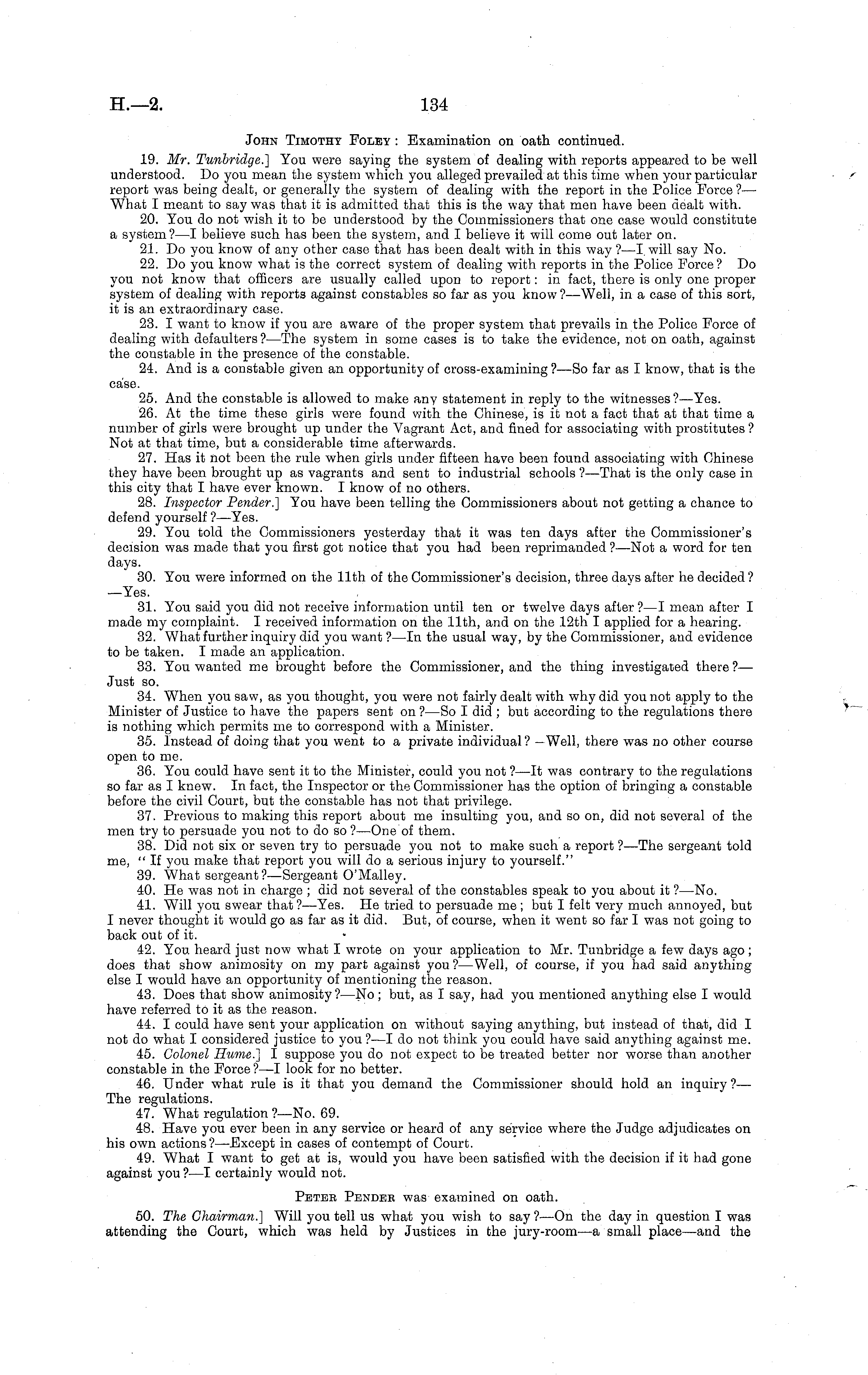 John Timothy Foley : Examination on oath continued. 19. Mr. Tunbridge.] You were saying the system of dealing with reports appeared to be well understood. Do you mean the system which you alleged prevailed at this time when your particular report was being dealt, or generally the system of dealing with the report in the Police Force ? — What I meant to say was that it is admitted that this is the way that men have been dealt with. 20. You do not wish it to be understood by the Commissioners that one case would constitute a system?—l believe such has been the system, and I believe it will come out later on. 21. Do you know of any other case that has been dealt with in this way ?—I. will say No. 22. Do you know what is the correct system of dealing with reports in the Police Force? Do you not know that officers are usually called upon to report: in fact, there is only one proper system of dealing with reports against constables so far as you know ? —Well, in a case of this sort, it is an extraordinary case. 23. I want to know if you are aware of the proper system that prevails in the Police Force of dealing with defaulters ? —The system in some cases is to take the evidence, not on oath, against the constable in the presence of the constable. 24. And is a constable given an opportunity of cross-examining ?—So far as I know, that is the case. 25. And the constable is allowed to make any statement in reply to the witnesses ?—Yes. 26. At the time these girls were found with the Chinese, is it not a fact that at that time a number of girls were brought up under the Vagrant Act, and fined for associating with prostitutes ? Not at that time, but a considerable time afterwards. 27. Has it not been the rule when girls under fifteen have been found associating with Chinese they have been brought up as vagrants and sent to industrial schools ?—That ia the only case in this city that I have ever known. I know of no others. 28. Inspector Pender.] You have been telling the Commissioners about not getting a chance to defend yourself ? —Yes. 29. You told the Commissioners yesterday that it was ten days after the Commissioner's decision was made that you first got notice that you had been reprimanded ? —Not a word for ten days. 30. You were informed on the 11th of the Commissioner's decision, three days after he decided ? —Yes. 31. You said you did not receive information until ten or twelve days after?—l mean after I made my complaint. I received information on the 11th, and on the 12th I applied for a hearing. 32. What further inquiry did you want ?—ln the usual way, by the Commissioner, and evidence to be taken. I made an application. 33. You wanted me brought before the Commissioner, and the thing investigated there ?— Just so. 34. When you saw, as you thought, you were not fairly dealt with why did you not apply to the Minister of Justice to have the papers sent on ? —So I did ; but according to the regulations there is nothing which permits me to correspond with a Minister. 35. Instead of doing that you went to a private individual? —Well, there was no other course open to me. 36. You could have sent it to the Minister, could you not ?—lt was contrary to the regulations so far as I knew. In fact, the Inspector or the Commissioner has the option of bringing a constable before the civil Court, but the constable has not that privilege. 37. Previous to making this report about me insulting you, and so on, did not several of the men try to persuade you not to do so ?—One of them. 38. Did not six or seven try to persuade you not to make such a report ?—The sergeant told me, " If you make that report you will do a serious injury to yourself." 39. What sergeant?— Sergeant O'Malley. 40. He was not in charge ; did not several of the constables speak to you about it ?—No. 41. Will you swear that ?—Yes. He tried to persuade me ; but I felt very much annoyed, but I never thought it would go as far as it did. But, of course, when it went so far I was not going to back out of it. 42. You heard just now what I wrote on your application to Mr. Tunbridge a few days ago; does that show animosity on my part against you ?—Well, of course, if you had said anything else I would have an opportunity of mentioning the reason. 43. Does that show animosity ?—No ; but, as I say, had you mentioned anything else I would have referred to it as the reason. 44. I could have sent your application on without saying anything, but instead of that, did I not do what I considered justice to you ? —I do not think you could have said anything against me. 45. Colonel Hume.] I suppose you do not expect to be treated better nor worse than another constable in the Force ?—I look for no better. 46. Under what rule is it that you demand the Commissioner should hold an inquiry ?— The regulations. 47. What regulation ?—No. 69. 48. Have you ever been in any service or heard of any service where the Judge adjudicates on his own actions? —Except in cases of contempt of Court. 49. What I want to get at is, would you have been satisfied with the decision if it had gone against you ? —I certainly would not. Petek Pendee was examined on oath. 50. The Chairman.] Will you tell us what you wish to say ? —On the day in question I was attending the Court, which was held by Justices in the jury-room—a small place—and the