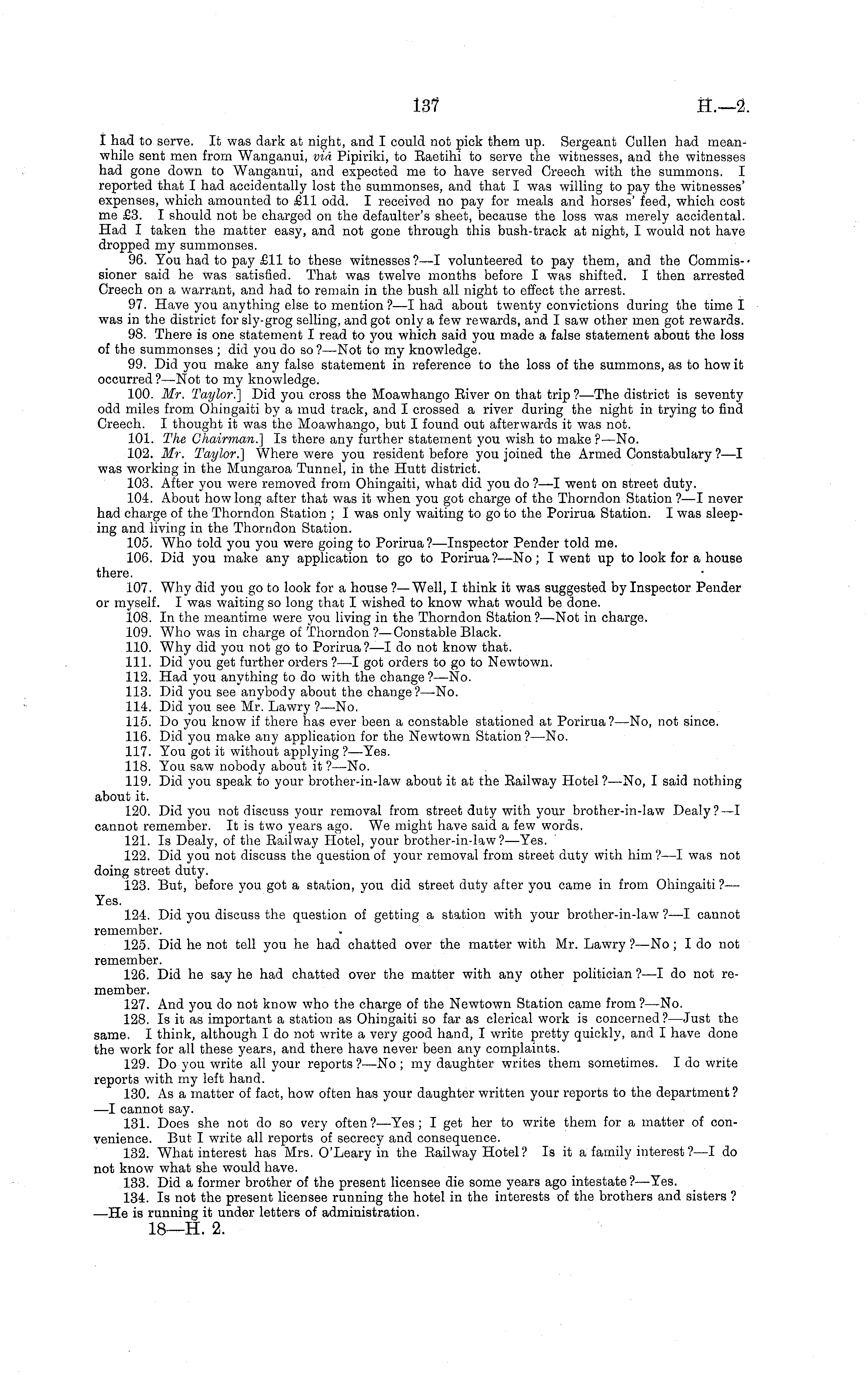 I had to serve. It was dark at night, and I could not pick them up. Sergeant Cullen had meanwhile sent men from Wanganui, via Pipiriki, to Eaetihi to serve the witnesses, and the witnesses had gone down to Wanganui, and expected me to have served Creech with the summons. I reported that I had accidentally lost the summonses, and that I was willing to pay the witnesses' expenses, which amounted to £11 odd. I received no pay for meals and horses' feed, which cost me £3. I should not be charged on the defaulter's sheet, because the loss was merely accidental. Had I taken the matter easy, and not gone through this bush-track at night, I would not have dropped my summonses. 96. You had to pay £11 to these witnesses?—l volunteered to pay them, and the Commissioner said he was satisfied. That was twelve months before I was shifted. I then arrested Creech on a warrant, and had to remain in the bush all night to effect the arrest. 97. Have you anything else to mention ?—I had about twenty convictions during the time I was in the district for sly-grog selling, and got only a few rewards, and I saw other men got rewards. 98. There is one statement I read to you which said you made a false statement about the loss of the summonses ; did you do so ?—Not to my knowledge. 99. Did you make any false statement in reference to the loss of the summons, as to how it occurred ? —Not to my knowledge. 100. Mr. Taylor.] Did you cross the Moawhango Eiver on that trip ?—The district is seventy odd miles from Ohingaiti by a mud track, and I crossed a river during the night in trying to find Creech. I thought it was the Moawhango, but I found out afterwards it was not. 101. The Chairman.] Is there any further statement you wish to make ?—No. 102. Mr. Taylor.] Where were you resident before you joined the Armed Constabulary ?—I was working in the Mungaroa Tunnel, in the Hutt district. 103. After you were removed from Ohingaiti, what did you do ? —I went on street duty. 104. About how long after that was it when you got charge of the Thorndon Station ? —I never had charge of the Thorndon Station ; I was only waiting to go to the Porirua Station. I was sleeping and living in the Thorndon Station. 105. Who told you you were going to Porirua? —Inspector Pender told me. 106. Did you make any application, to go to Porirua?—No; I went up to look for a house there. 107. Why did you go to look for a house ?—Well, I think it was suggested by Inspector Pender or myself. I was waiting so long that I wished to know what would be done. 108. In the meantime were you living in the Thorndon Station ? —Not in charge. 109. Who was in charge of Thorndon ?—Constable Black. 110. Why did you not go to Porirua?—l do not know that. 111. Did you get further orders ? —I got orders to go to Newtown. 112. Had you anything to do with the change?— No. 113. Did you see anybody about the change?— No. 114. Did you see Mr. Lawry ? —No. 115. Do you know if there has ever been a constable stationed at Porirua ?—No, not since. 116. Did you make any application for the Newtown Station?— No. 117. You got it without applying ? —Yes. 118. You saw nobody about it ?—No. 119. Did you speak to your brother-in-law about it at the Eailway Hotel ?—No, I said nothing about it. 120. Did you not discuss your removal from street duty with your brother-in-law Dealy?—l cannot remember. It is two years ago. We might have said a few words. 121. Is Dealy, of the Eailway Hotel, your brother-in-law?— Yes. 122. Did you not discuss the question of your removal from street duty with him?—l was not doing street duty. 123. But, before you got a station, you did street duty after you came in from Ohingaiti ?— Yes. 124. Did you discuss the question of getting a station with your brother-in-law ? —I cannot remember. 125. Did he not tell you he had chatted over the matter with Mr. Lawry ? —No; I do not remember. 126. Did he say he had chatted over the matter with any other politician ?—I do not remember. 127. And you do not know who the charge of the Newtown Station came from?— No. 128. Is it as important a station as Ohingaiti so far as clerical work is concerned? —Just the same. I think, although Ido not write a very good hand, I write pretty quickly, and I have done the work for all these years, and there have never been any complaints. 129. Do you write all your reports ? —No ;my daughter writes them sometimes. Ido write reports with my left hand. 130. As a matter of fact, how often has your daughter written your reports to the department ? —I cannot say. 131. Does she not do so very often?— Yes; I get her to write them for a matter of convenience. But I write all reports of secrecy and consequence. 132. What interest has Mrs. O'Leary in the Eailway Hotel? Is it a family interest?—l do not know what she would have. 133. Did a former brother of the present licensee die some years ago intestate? —Yes. 134. Is not the present licensee running the hotel in the interests of the brothers and sisters ? —He is running it under letters of administration.