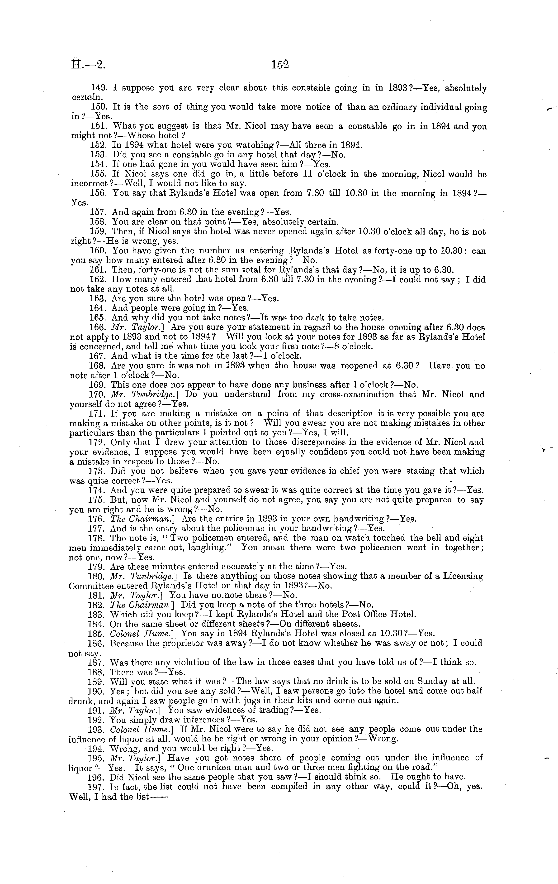149. I suppose yoti are very clear about this constable going in in 1893 ?—Yes, absolutely certain. 150. It is the sort of thing you would take more notice of than an ordinary individual going in ?—Yes. 151. What you suggest is that Mr. Nicol may have seen a constable go in in 1894 and you might not ?—Whose hotel ? 152. In 1894 what hotel were you watohing?—All three in 1894. 153. Did you see a constable go in any hotel that day?— No. 154. If one had gone in you would have seen him ?—Yes. 155. If Nicol says one did go in, a little before 11 o'clock in the morning, Nicol would be incorrect ?—Well, I would not like to say. 156. You say that Kylands's Hotel was open from 7.30 till 10.30 in the morning in 1894 ?— Yes. 157. And again from 6.30 in the evening?— Yes. 158. You are clear on that point ?—Yes, absolutely certain. 159. Then, if Nicol says the hotel was never opened again after 10.30 o'clock all day, he is not right?—He is wrong, yes. 160. You have given the number as entering Eylands's Hotel as forty-one up to 10.30: can you say how many entered after 6.30 in the evening?— No. 161. Then, forty-one is not the sum total for Eylands's that day?—No, it is up to 6.30. 162. How many entered that hotel from 6.30 till 7.30 in the evening?—l could not say ; I did not take any notes at all. 163. Are you sure the hotel was open? —Yes. 164. And people were going in ? —Yes. 165. And why did you not take notes?—lt was too dark to take notes. 166. Mr. Taylor.] Are you sure your statement in regard to the house opening after 6.30 does not apply to 1893 and not to 1894 ? Will you look at your notes for 1893 as far as Eylands's Hotel is concerned, and tell me what time you took your first note ?—8 o'clock. 167. And what is the time for the last?—l o'clock. 168. Are you sure it was not in 1893 when the house was reopened at 6.30 ? Have you no note after 1 o'clock?— No. 169. This one does not appear to have done any business after 1 o'clock?— No. 170. Mr. Tunbridge.] Do you understand from my cross-examination that Mr. Nicol and yourself do not agree ? —Yes. 171. If you are making a mistake on a point of that description it is very possible you are making a mistake on other points, is it not ? Will you swear you are not making mistakes in other particulars than the particulars I pointed out to you ?—Yes, I will. 172. Only that I drew your attention to those discrepancies in the evidence of Mr. Nicol and your evidence, I suppose you would have been equally confident you could not have been making a mistake in respect to those ?—No. 173. Did you not believe when you gave your evidence in chief yon were stating that which was quite correct ?—Yes. 174. And you were quite prepared to swear it was quite correct at the time you gave it ?—Yes. 175. But, now Mr. Nicol and yourself do not agree, you say you are not quite prepared to say you are right and he is wrong ? —No. 176. The Chairman.] Are the entries in 1893 in your own handwriting ?—Yes. 177. And is the entry about the policeman in your handwriting ?—Yes. 178. The note is, " Two policemen entered, and the man on watch touched the bell and eight men immediately came out, laughing." You mean there were two policemen went in together; not one, now?— Yes. 179. Are these minutes entered accurately at the time ? —Yes. 180. Mr. Tunbridge.] Is there anything on those notes showing that a member of a Licensing Committee entered Eylands's Hotel on that day in 1893?—N0. 181. Mr. Taylor.] You have no,note there ?—No. 182. The Chairman.] Did you keep a note of the three hotels?— No. 183. Which did you keep ?—I kept Eylands's Hotel and the Post Office Hotel. 184. On the same sheet or different sheets ?—On different sheets. 185. Colonel Hzime.] You say in 1894 Eylands's Hotel was closed at 10.30?— Yes. 186. Because the proprietor was away?—-I do not know whether he was away or not; I could not say. 187. Was there any violation of the law in those cases that you have told us of ?—I think so. 188. There was?— Yes. 189. Will you state what it was ?—The law says that no drink is to be sold on Sunday at all. 190. Yes ; but did you see any sold?— Well, I saw persons go into the hotel and come out half drunk, and again I saw people go in with jugs in their kits and come out again. 191. Mr. Taylor.] You saw evidences of trading?— Yes. 192. You simply draw inferences? —Yes. 193. Colonel Hume.] If Mr. Nicol were to say he did not see any people come out under the influence of liquor at all, would he be right or wrong in your opinion? —Wrong. 194. Wrong, and you would be right ?—Yes. 195. Mr. Taylor.] Have you got notes there of people coming out under the influence of liquor ? —Yes. It says, " One drunken man and two or three men fighting on the road." 196. Did Nicol see the same people that you saw ?—I should think so. He ought to have. 197. In fact, the list could not have been compiled in any other way, could it?—Oh, yes. Well, I had the list