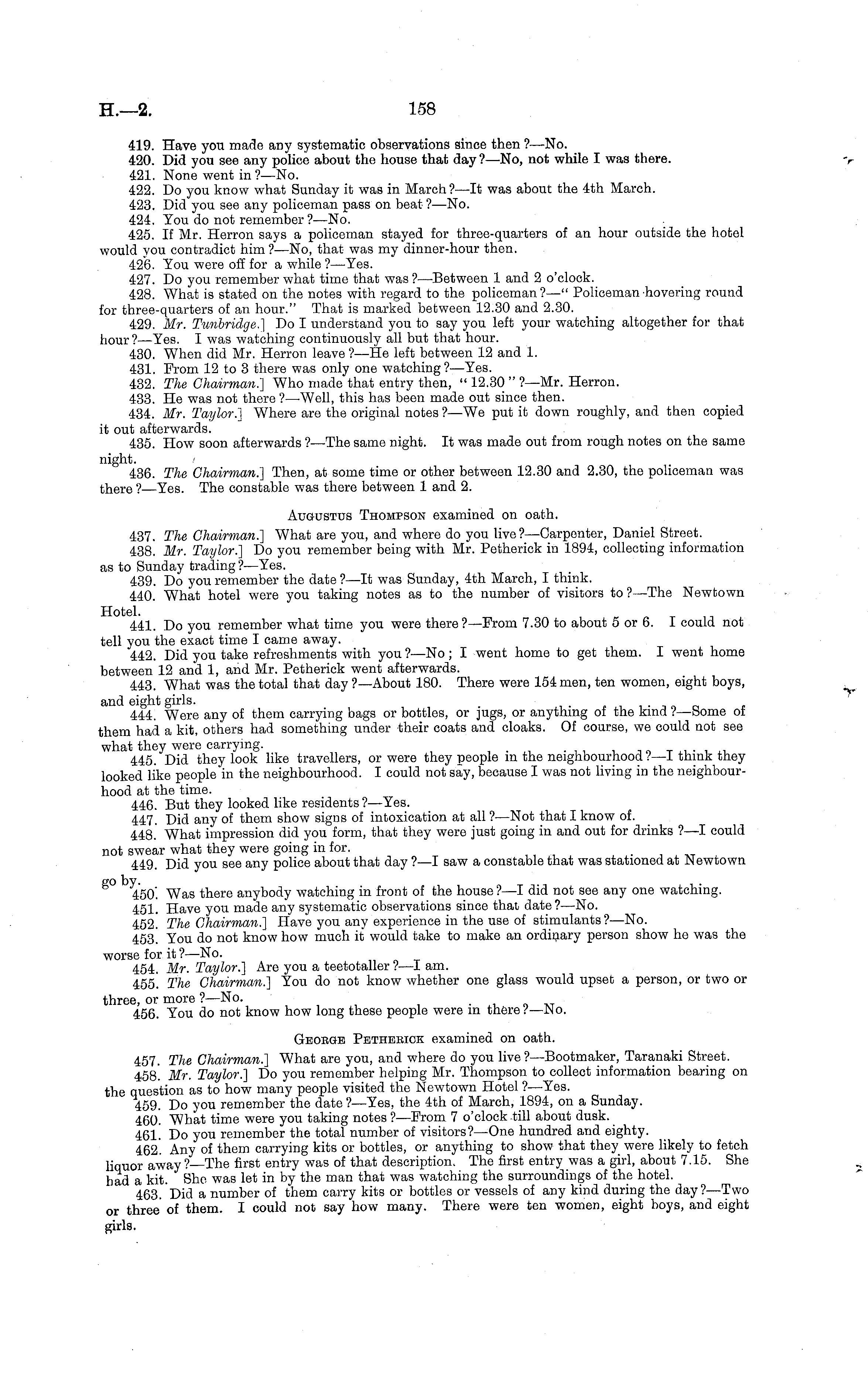 419. Have you made any systematic observations since then ?—No. 420. Did you see any police about the house that day ?—No, not while I was there. 421. None went in?— No. 422. Do you know what Sunday it was in March? —It was about the 4th March. 423. Did you see any policeman pass on beat ?—No. 424. You do not remember ? —No. 425. If Mr. Herron says a policeman stayed for three-quarters of an hour outside the hotel would you contradict him ?—No, that was my dinner-hour then. 426. You were off for a while ?—Yes. 427. Do you remember what time that was?— Between 1 and 2 o'clock. 428. What is stated on the notes with regard to the policeman ?—" Policeman hovering round for three-quarters of an hour." That is marked between 12.30 and 2.30. 429. Mr. Tunbridge.] Do I understand you to say you left your watching altogether for that hour? —Yes. I was watching continuously all but that hour. 430. When did Mr. Herron leave?—He left between 12 and 1. 431. From 12 to 3 there was only one watching?— Yes. 432. The Chairman.] Who made that entry then, " 12.30 " ?—Mr. Herron. 433. He was not there ?—Well, this has been made out since then. 434. Mr. Taylor.] Where are the original notes ? —We put it down roughly, and then copied it out afterwards. 435. How soon afterwards ?—The same night. It was made out from rough notes on the same night. 436. The Chairman.] Then, at some time or other between 12.30 and 2.30, the policeman was there ?—Yes. The constable was there between 1 and 2. Augustus Thompson examined on oath. 437. The Chairman.] What are you, and where do you live?— Carpenter, Daniel Street. 438. Mr. Taylor.] Do you remember being with Mr. Petherick in 1894, collecting information as to Sunday trading ?—Yes. 439. Do you remember the date ?—lt was Sunday, 4th March, I think. 440. What hotel were you taking notes as to the number of visitors to ? —The Newtown Hotel. 441. Do you remember what time you were there? —From 7.30 to about sor 6. I could not tell you the exact time I came away. 442. Did you take refreshments with you ?—No ; I went home to get them. I went home between 12 and 1, and Mr. Petherick went afterwards. 443. What was the total that day ?—About 180. There were 154 men, ten women, eight boys, and eight girls. 444. Were any of them carrying bags or bottles, or jugs, or anything of the kind ?—Some of them had a kit, others had something under their coats and cloaks. Of course, we could not see what they were carrying. 445. Did they look like travellers, or were they people in the neighbourhood ?—I think they looked like people in the neighbourhood. I could not say, because I was not living in the neighbourhood at the time. 446. But they looked like residents ? —Yes. 447. Did any of them show signs of intoxication at all ?—Not that I know of. 448. What impression did you form, that they were just going in and out for drinks ? —I could not swear what they were going in for. _ 449. Did you see any police about that day ?—I saw a constable that was stationed at Newtown go by. 450. Was there anybody watching in front of the house ?—I did not see any one watching. 451. Have you made any systematic observations since that date? —No. 452. The Chairman.] Have you any experience in the use of stimulants? —No. 453. You do not know how much it would take to make an ordinary person show he was the worse for it ?—No. 454. Mr. Taylor.] Are you a teetotaller ?—I am. 455! The Chairman.] You do not know whether one glass would upset a person, or two or three, or more ?—No. _ ' 456. You do not know how long these people were in there > —JNo. Gboege Pbthebick examined on oath. 457. The What are you, and where do you live?— Bootmaker, Taranaki Street. 458. Mr. Taylor.] Do you remember helping Mr. Thompson to collect information bearing on the question as to how many people visited the Newtown Hotel ?—Yes. 459. Do you remember the date ?—Yes, the 4th of March, 1894, on a Sunday. 460. What time were you taking notes ?—From 7 o'clock till about dusk. 461. Do you remember the total number of visitors? —One hundred and eighty. 462. Any of them carrying kits or bottles, or anything to show that they were likely to fetch liquor away? The first entry was of that description. The first entry was a girl, about 7.15. She had a kit. She was let in by the man that was watching the surroundings of the hotel. 463 Did a number of them carry kits or bottles or vessels of any kind during the day? —Two or three of them. I could not say how many. There were ten women, eight boys, and eight girls.
