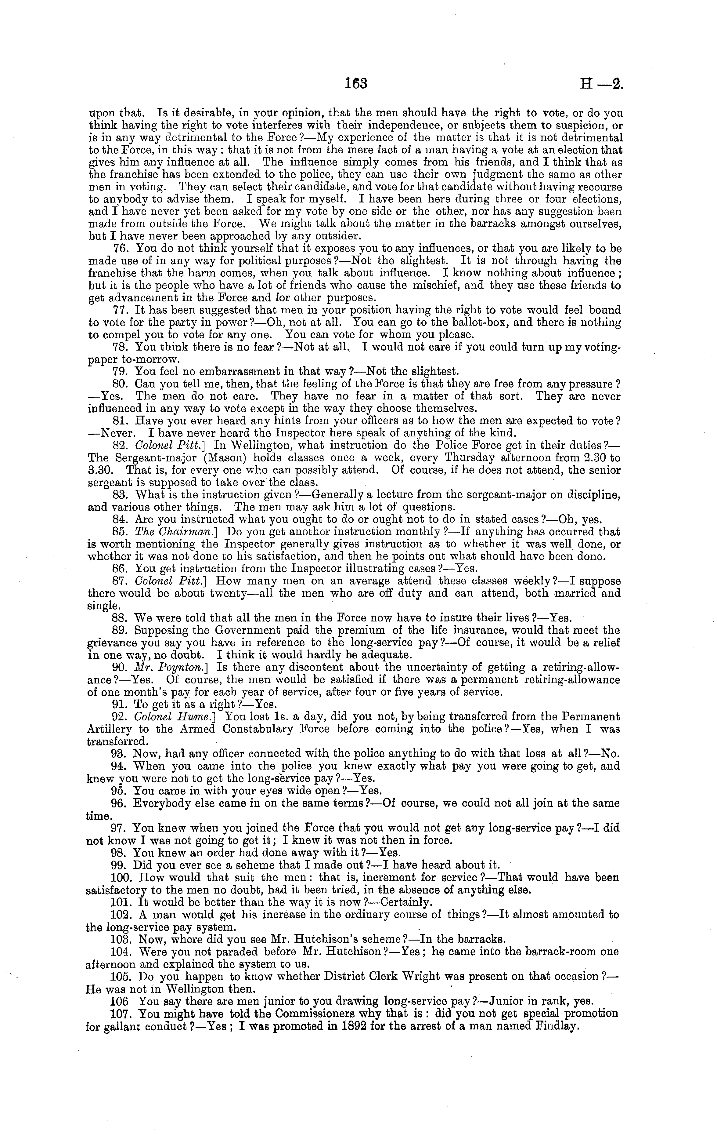 upon that. Is it desirable, in your opinion, that the men should have the right to vote, or do you think having the right to vote interferes with their independence, or subjects them to suspicion, or is in any way detrimental to the Force ? —My experience of the matter is that it is not detrimental to the Force, in this way : that it is not from the mere fact of a man having a vote at an election that gives him any influence at all. The influence simply comes from his friends, and I think that as the franchise has been extended to the police, they can use their own judgment the same as other men in voting. They can select their candidate, and vote for that candidate without having recourse to anybody to advise them. I speak for myself. I have been here during three or four elections, and I have never yet been asked for my vote by one side or the other, nor has any suggestion been made from outside the Force. We might talk about the matter in the barracks amongst ourselves, but I have never been approached by any outsider. 76. You do not think yourself that it exposes you to any influences, or that you are likely to be made use of in any way for political purposes?— Not the slightest. It is not through having the franchise that the harm comes, when you talk about influence. I know nothing about influence ; but it is the people who have a lot of friends who cause the mischief, and they use these friends to get advancement in the Force and for other purposes. 77. It has been suggested that men in your position having the right to vote would feel bound to vote for the party in power?—Oh, not at all. You can go to the ballot-box, and there is nothing to compel you to vote for any one. You can vote for whom you please. 78. You think there is no fear ?—Not at all. I would not care if you could turn up my votingpaper to-morrow. 79. You feel no embarrassment in that way ?—Not the slightest. 80. Can you tell me, then, that the feeling of the Force is that they are free from any pressure ? —Yes. The men do not care. They have no fear in a matter of that sort. They are never influenced in any way to vote except in the way they choose themselves. 81. Have you ever heard any hints from your officers as to how the men are expected to vote? —Never. I have never heard the Inspector here speak of anything of the kind. 82. Colonel Pitt.] In Wellington, what instruction do the Police Force get in their duties ?— The Sergeant-major (Mason) holds classes once a week, every Thursday afternoon from 2.30 to 3.30. That is, for every one who can possibly attend. Of course, if he does not attend, the senior sergeant is supposed to take over the class. 83. What is the instruction given ? —Generally a lecture from the sergeant-major on discipline, and various other things. The men may ask him a lot of questions. 84. Are you instructed what you ought to do or ought not to do in stated cases ?—Oh, yes. 85. The Chairman.] Do you get another instruction monthly ?—lf anything has occurred that is worth mentioning the Inspector generally gives instruction as to whether it was well done, or whether it was not done to his satisfaction, and then he points out what should have been done. 86. You get instruction from the Inspector illustrating cases ?—Yes. 87. Colonel Pitt.] How many men on an average attend these classes weekly ?—I suppose there would be about twenty—all the men who are off duty and can attend, both married and single. 88. We were told that all the men in the Force now have to insure their lives ? —Yes. 89. Supposing the Government paid the premium of the life insurance, would that meet the grievance you say you have in reference to the long-service pay ? —Of course, it would be a relief in one way, no doubt. I think it would hardly be adequate. 90. Mr. Poynton.] Is there any discontent about the uncertainty of getting a retiring-allow-ance ? —Yes. Of course, the men would be satisfied if there was a permanent retiring-allowance of one month's pay for each year of service, after four or five years of service. 91. To get it as a right ?—Yes. 92. Colonel Hume.] You lost Is. a day, did you not, by being transferred from the Permanent Artillery to the Armed Constabulary Force before coming into the police?— Yes, when I was transferred. 93. Now, had any officer connected with the police anything to do with that loss at all ?—■Nβ. 94. When you came into the police you knew exactly what pay you were going to get, and knew you were not to get the long-service pay ?—Yes. 95. You came in with your eyes wide open?— Yes. 96. Everybody else came in on the same terms ? —Of course, we could not all join at the same time. 97. You knew when you joined the Force that you would not get any long-service pay?—l did not know I was not going to get it; I knew it was not then in force. 98. You knew an order had done away with it ?—Yes. 99. Did you ever see a scheme that I made out ? —I have heard about it. 100. How would that suit the men : that is, increment for service ?—That would have been satisfactory to the men no doubt, had it been tried, in the absence of anything else. 101. It would be better than the way it is now ?—Certainly. 102. A man would get his increase in the ordinary course of things?—lt almost amounted to the long-service pay system. 103. Now, where did you see Mr. Hutchison's scheme ?—ln the barracks. 104. Were you not paraded before Mr. Hutchison?—Yes ; he came into the barrack-room one afternoon and explained the system to us. 105. Do you happen to know whether District Clerk Wright was present on that occasion ?— He was not in Wellington then. 106 You say there are men junior to you drawing long-service pay?— Junior in rank, yes. 107. You might have told the Commissioners why that is : did you not get special promotion for gallant conduct ?—Yes ; I was promoted in 1892 for the arrest of a man named Fiudlay.