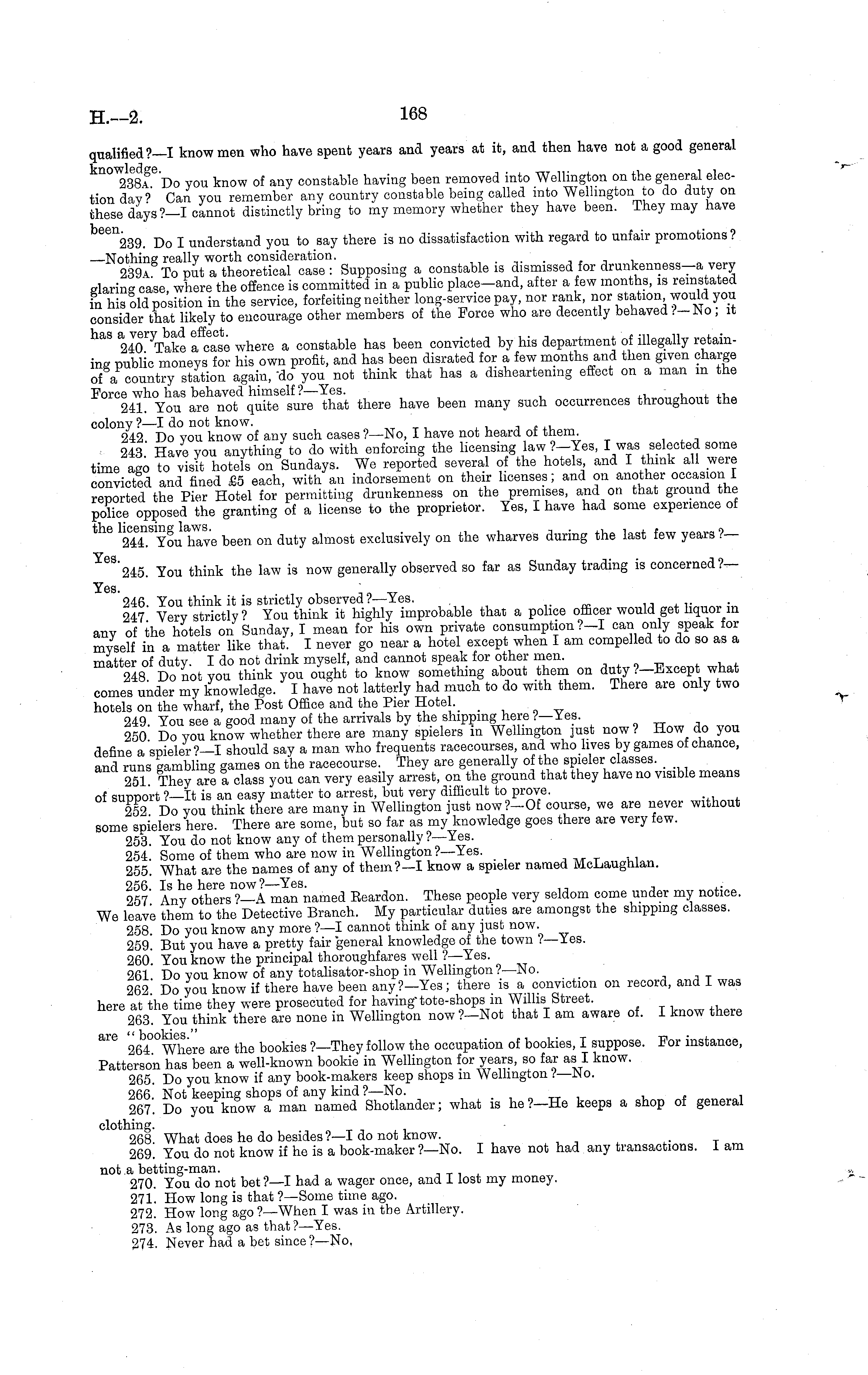 qualified?—l know men who have spent years and years at it, and then have not a good general you know of any constable having been removed into Wellington on the general election day? Can you remember any country constable being called into Wellington to do duty on these days?—l cannot distinctly bring to my memory whether they have been. They may have beell 239. Do I understand you to say there is no dissatisfaction with regard to unfair promotions? Nothing really worth consideration. . 239 aTo put a theoretical case : Supposing a constable is dismissed for drunkenness-a very glaring case, where the offence is committed in a public place-and, after a few months, is reinstated in his old position in the service, forfeiting neither long-service pay, nor rank, nor station would you consider that likely to encourage other members of the Force who are decently behaved ?-No; it has c ect. & congtable hag been conv i c ted by his department of illegally retaining public moneys for his own profit, and has been disrated for a few months and then given charge of a country station again, 'do you not think that has a disheartening effect on a man in the Force who has behaved himself ?—Yes. 241. You are not quite sure that there have been many such occurrences throughout the colony ?—I do not know. 242 Do you know of any such cases ?—No, I have not heard of them 243 Have you anything to do with enforcing the licensing law ?-Yes, I was selected some time ago to visit hotels on Sundays. We reported several of the hotels and I think all were convicted and fined £5 each, with an indorsement on their licenses; and on another occasion I reported the Pier Hotel for permitting drunkenness on the premises, and on that ground the P oHce opposed the granting of a license to the proprietor. Yes, I have had some experience of the c 4e4 ns ™S u a^ e been on duty almost exclusively on the wharves during the last few years ?— YeS- 245. You think the law is now generally observed so far as Sunday trading is concerned?— Yes. 246 You think it is strictly observed ? —Yes. 247' Very strictly? You think it highly improbable that a police officer would get liquor m any of the hotels on Sunday, I mean for his own private consumption ?-I can only speak for myself in a matter like that. I never go near a hotel except when lam compelled to do so as a matter of duty. Ido not drink myself, and cannot speak for other men. 248 Do not you think you ought to know something about them on duty ?-Except what comes under my knowledge. I have not latterly had much to do with them. There are only two hotels on the wharf, the Post Office and the Pier HoteL . 249. You see a good many of the arrivals by the shipping here ?— Yes. . 250 Do you know whether there are many spielers in Wellington just now? How do you define a spieler ?-I should say a man who frequents racecourses, and who lives by games of chance, and runs gambling games on the racecourse. They are generally of the spieler classes. and runs gamo g they nQ meang of support ?—lt is an easy matter to arrest, but very difficult to prove. 252 Do you think there are many in Wellington just now?-Of course, we are never without some spielers here. There are some, but so far as my knowledge goes there are very few. 253. You do not know any of them personally ?—Yes. 254 Some of them who are now in Wellington?— Yes. 255. What are the names of any of them?—l know a spieler named McLaughlan. 256 Is he here now? —Yes. ~ , ~ 257 Any others ?—A man named Eeardon. These people very seldom come under my notice. We leave them to the Detective Branch. My particular duties are amongst the shipping classes. 258. Do you know any more ?—I cannot think of any just now. 259. But you have a pretty fair general knowledge of the town ?—Yes. 260. You know the principal thoroughfares well ?—Yes. 261 Do you know of any totalisator-shop in Wellington?— No. 262 Do you know if there have been any ?-Yes ; there is a conviction on record, and I was here at the time they were prosecuted for having' tote-shops m Willis Street. 263. You think there are none in Wellington now ?-Not that lam aware of. I know there arG 264°°Where are the bookies ?—They follow the occupation of bookies, I suppose. For instance, Patterson has been a well-known bookie in Wellington for years, so far as I know. 265. Do you know if any book-makers keep shops m Wellington >— JNo. 266 Not keeping shops of any kind ? —No. 267. Do you know a man named Shotlander; what is he ?—He keeps a shop of general clothing. 268 What does he do besides ?—I do not know. 269. You do not know if he is a book-maker ?—No. I have not had any transactions. lam not a betting-man. 270. You do not bet? —I had a wager once, and I lost my money. 271. How long is that ?—Some time ago. 272. How long ago ? —When I was in the Artillery. 273. As long ago as that ? —Yes. 274. Never had a bet since ? —No,
