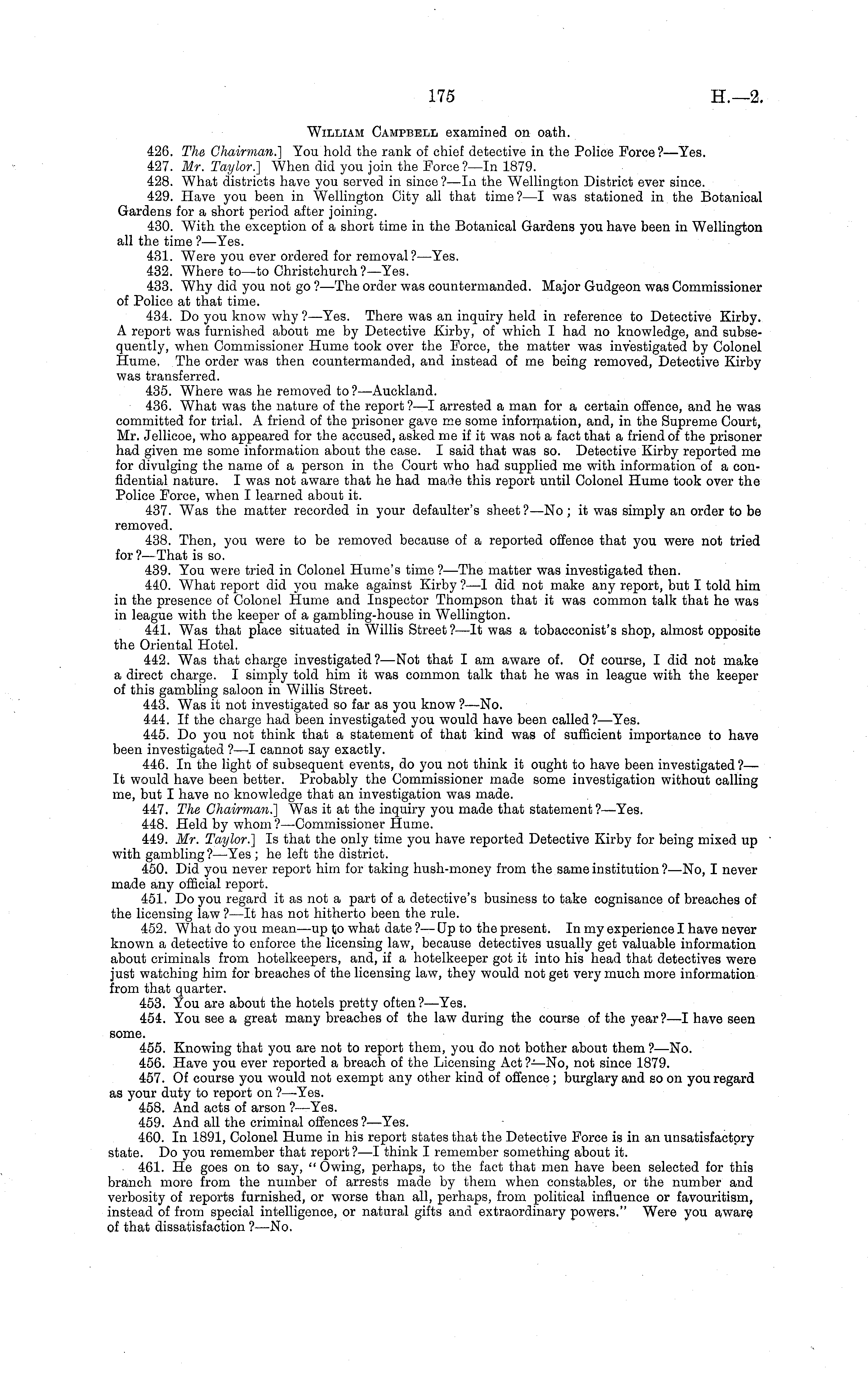 William Campbell examined on oath. 426. The Chairman.'] You hold the rank of chief detective in the Police Force ?—Yes. 427. Mr. Taylor.] When did you join the Force?—ln 1879. 428. What districts have you served in since ? —ln the Wellington District ever since. 429. Have you been in Wellington City all that time?—l was stationed in the Botanical Gardens for a short period after joining. 430. With the exception of a short time in the Botanical Gardens you have been in Wellington all the time ?—Yes. 431. Were you ever ordered for removal? —Yes. 432. Where to—to Christchurch ?—Yes. 433. Why did you not go ?—The order was countermanded. Major Gudgeon was Commissioner of Police at that time. 434. Do you know why ? —Yes. There was an inquiry held in reference to Detective Kirby. A report was furnished about me by Detective Kirby, of which I had no knowledge, and subsequently, when Commissioner Hume took over the Force, the matter was investigated by Colonel Hume. The order was then countermanded, and instead of me being removed, Detective Kirby was transferred. 435. Where was he removed to?— Auckland. 436. What was the nature of the report ?—I arrested a man for a certain offence, and he was committed for trial. A friend of the prisoner gave me some information, and, in the Supreme Court, Mr. Jellicoe, who appeared for the accused, asked me if it was not a fact that a friend of the prisoner had given me some information about the case. I said that was so. Detective Kirby reported me for divulging the name of a person in the Court who had supplied me with information of a confidential nature. I was not aware that he had made this report until Colonel Hume took over the Police Force, when I learned about it. 437. Was the matter recorded in your defaulter's sheet?—No ; it was simply an order to be removed. 438. Then, you were to be removed because of a reported offence that you were not tried for?— That is so. 439. You were tried in Colonel Hume's time ?—The matter was investigated then. 440. What report did you make against Kirby ?—I did not make any report, but I told him in the presence of Colonel Hume and Inspector Thompson that it was common talk that he was in league with the keeper of a gambling-house in Wellington. 441. Was that place situated in Willis Street?—lt was a tobacconist's shop, almost opposite the Oriental Hotel. 442. Was that charge investigated?— Not that I am aware of. Of course, I did not make a direct charge. I simply told him it was common talk that he was in league with the keeper of this gambling saloon in Willis Street. 443. Was it not investigated so far as you know ?—No. 444. If the charge had been investigated you would have been called ?—Yes. 445. Do you not think that a statement of that kind was of sufficient importance to have been investigated ?—I cannot say exactly. 446. In the light of subsequent events, do you not think it ought to have been investigated ?— It would have been better. Probably the Commissioner made some investigation without calling me, but I have no knowledge that an investigation was made. 447. The Chairman.] Was it at the inquiry you made that statement?— Yes. 448. Held by whom ?—Commissioner Hume. 449. Mr. Taylor.] Is that the only time you have reported Detective Kirby for being mixed up with gambling?— Yes; he left the district. 450. Did you never report him for taking hush-money from the same institution ? —No, I never made any official report. 451. Do you regard it as not a part of a detective's business to take cognisance of breaches of the licensing law ? —lt has not hitherto been the rule. 452. What do you mean —up to what date ?— Up to the present. In my experience I have never known a detective to enforce the licensing law, because detectives usually get valuable information about criminals from hotelkeepers, and, if a hotelkeeper got it into his head that detectives were just watching him for breaches of the licensing law, they would not get very much more information from that quarter. 453. You are about the hotels pretty often?— Yes. 454. You see a great many breaches of the law during the course of the year?—l have seen some. 455. Knowing that you are not to report them, you do not bother about them ? —No. 456. Have you ever reported a breach of the Licensing Act ?- —No, not since 1879. 457. Of course you would not exempt any other kind of offence; burglary and so on you regard as your duty to report on ?—-Yes. 458. And acts of arson ?—Yes. 459. And all the criminal offences ?—Yes. 460. In 1891, Colonel Hume in his report states that the Detective Force is in an unsatisfactory state. Do you remember that report? —I think I remember something about it. 461. He goes on to say, " Owing, perhaps, to the fact that men have been selected for this branch more from the number of arrests made by them when constables, or the number and verbosity of reports furnished, or worse than all, perhaps, from political influence or favouritism, instead of from special intelligence, or natural gifts and extraordinary powers." Were you aware of that dissatisfaction ? —No.
