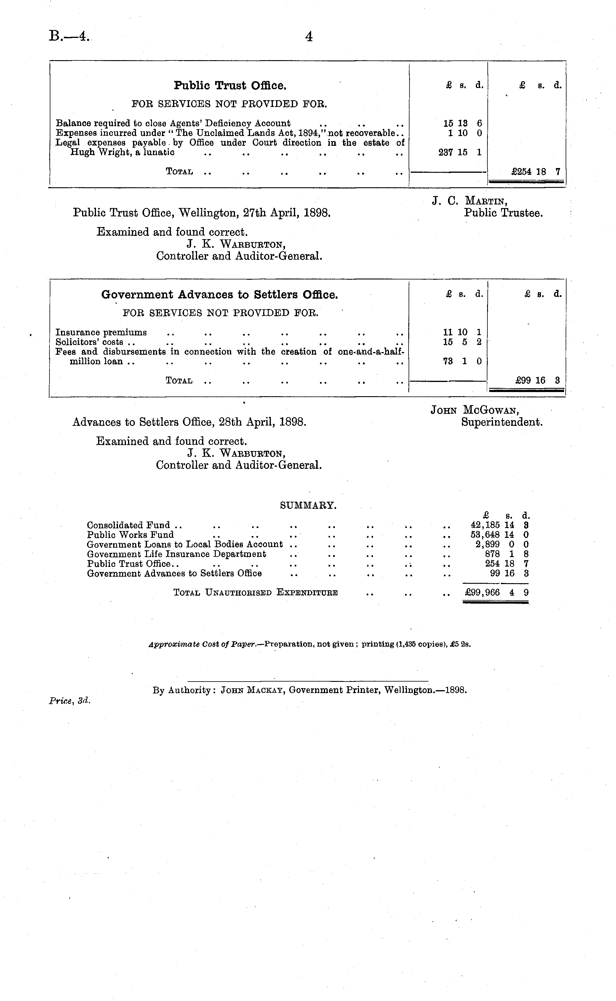 John McGowan, Advances to Settlers Office, 28th April, 1898. Superintendent. Examined and found correct. J. K. Warburton, Controller and Auditor-General. SUMMARY. £ s. d. Consolidated Fund .. .. .. .. .. .. .. .. 42,185 14 8 Public Works Fund .. ... .. .. .. .. .. 53,648 14 0 Government Loans to Local Bodies Account .. .. .. .. .. 2,899 0 0 Government Life Insurance Department .. .. .. .. .. 878 1 8 Public Trust Office.. .. .. .. .. .. .-. .. 254 18 7 Government Advances to Settlers Office .. .. .. .. .. 99 16 3 Total Unauthobisbd Expendituee .. .. .. £99,966 4 9