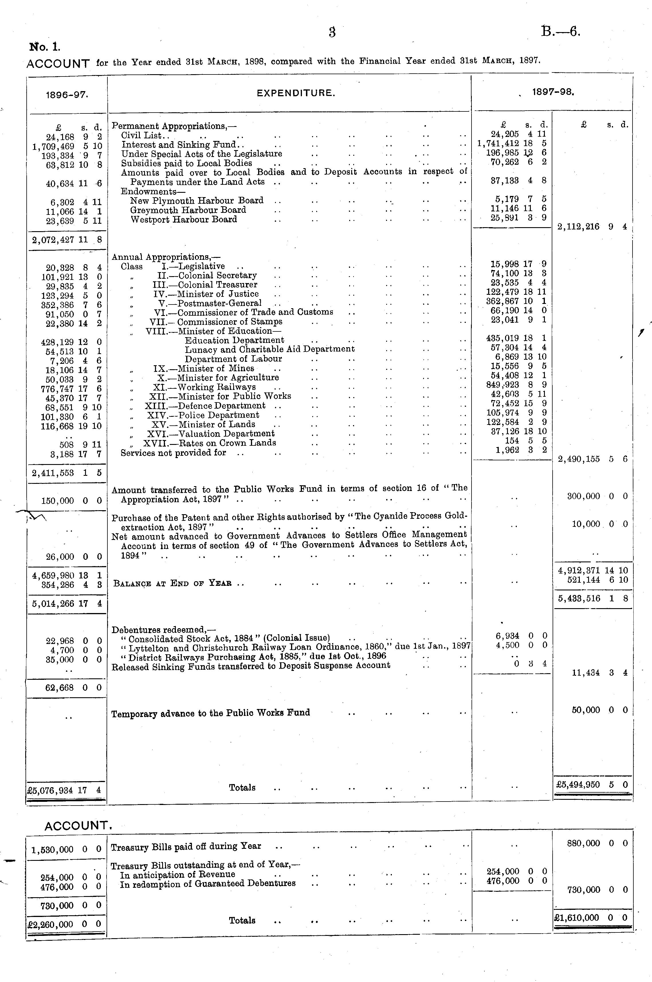 1896-97. EXPENDITURE. 189 '-98. £ s. d. 24,168 9 2 1,709,469 5 10 193,334 9 7 63,812 10 8 40,634 11 -6 Permanent Appropriations, — Civil List Interest and Sinking Fund Under Special Acts of the Legislature .. .. .. ... Subsidies paid to Local Bodies Amounts paid over to Local Bodies and to Deposit Accounts in respect of Payments under the Land Acts Endowments— New Plymouth Harbour Board Greymouth Harbour Board Westport Harbour Board .. ■• ■■ ... ...... £ s. d. 24,205 4 11 1,741,412 18 5 196,985 Hi 6 70,262 6 2 37,133 4 8 £ s. d. 6,302 4 11 11,066 14 1 23,639 5 11 5,179 7 5 11,146 11 6 25,391 3 9 2,112,216 9 4 2,072,427 11 .8 20,328 8 4 101,921 13 0 29,835 4 2 123,294 5 0 352,386 7 6 91,050 0 7 22,380 14 2 428,129 12 0 54,513 10 1 7,206 4 6 18,106 14 7 50,033 9 2 776,747 17 6 45,370 17 7 68,551 9 10 101,330 6 1 116,668 19 10 Annual Appropriations, — Class I.—Legislative II. —Colonial Secretary .. III.—Colonial Treasurer IV. —Minister of Justice V.—Postmaster-General VI. —Commissioner of Trade and Customs VII.- Commissioner of Stamps „ VIII. —Minister of Education — Education Department Lunacy and Charitable Aid Department Department of Labour IX.—Minister of Mines X. —Minister for Agriculture XL —Working Railways XII. —Minister for Public Works XIII.—Defence Department XIV. —Police Department XV. —Minister of Lands XVI.—Valuation Department „ XVII.—Rates on Crown Lands Services not provided for .. 15,998 17 9 74,100 13 3 23,535 4 4 122,479 18 11 362,867 10 1 66,190 14 0 23,041 9 1 435,019 18 1 57,304 14 4 6,869 13 10 15,556 9 5 54,408 12 1 849 ,-923 8 9 42,603 5 11 72,452 15 9 105,974 9 9 122,584 2 9 37,126 18 10 154 5 5 1,962 3 2 508 9 11 3,188 17 7 2,490,155 5 6 2,411,553 1 5 Amount transferred to the Public Works Fund in terms of seotion 16 of "The Appropriation Act, 1897 " .. 300,000 0 0 150,000 0 0 % Purchase of the Patent and other Rights authorised by "The Cyanide Process Goldextraction Act, 1897 " Net amount advanced to Government Advances to Settlers Office Management Account in terms of section 49 of " The Government Advances to Settlers Act, 1894" .. .. .. .. •• •• 10,000 0 0 26,000 0 0 4,659,980 13 1 354,286 4 3 Balancje at End op Year .. .. .. 4,912,371 14 10 521,144 6 10 5,433,516 1 8 5,014,266 17 4 22,968 0 0 4,700 0 0 35,000 0 0 Debentures redeemed, — " Consolidated Stock Act, 1884 " (Colonial Issue) " Lyttelton and Christchurch Railway Loan Ordinance, 1860," due 1st Jan., 1897 " District Railways Purchasing Act, 1885," due 1st Oct., 1896 Released Sinking Funds transferred to Deposit Suspense Account 6,934 0 0 4,500 0 0 0 3 4 11,434 3 4 62,668 0 0 Temporary advanoe to the Public Works Fund 50,000 0 0 £5,494,950 5 0 Totals £5,076,934 17 4 ACCOUNT. Treasury Bills paid off during Year 880,000 0 0 1,530,000 0 0 254,000 0 0 476,000 0 0 Treasury Bills outstanding at end of Year,— In anticipation of Revenue In redemption of Guaranteed Debentures 254,000 0 0 476,000 0 0 730,000 0 0 730,000 0 0 Totals £1,610,000 0 0 £2,260,000 0 0