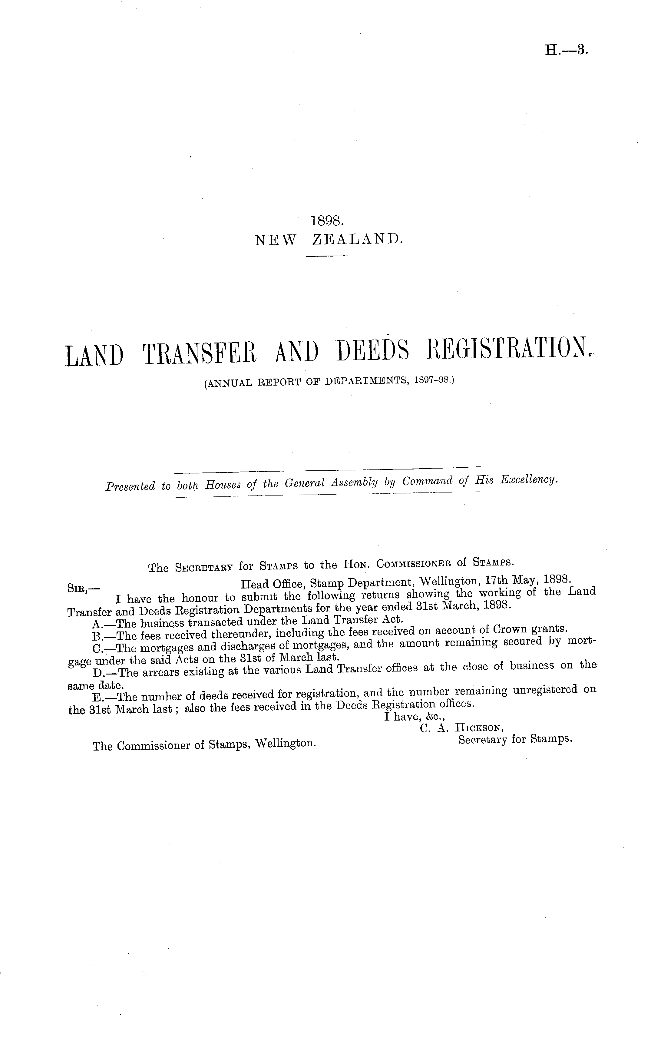 The Secketaby for Stamps to the Hon. Commissionee of Stamps. q m _ Head Office, Stamp Department, Wellington, 17th May, 1898. I have the honour to submit the following returns showing the working of the Land Transfer and Deeds Eegistration Departments for the year ended 31st March, 1898. A —The business transacted under the Land Transfer Act. B— The fees received thereunder, including the fees received on account of Crown grants. C.-The mortgages and discharges of mortgages, and the amount remaining secured by morion pp under the said Acts on the 31st of March last. . gS D -The arrears existing at the various Land Transfer offices at the close of business on the Same E d !!.The number of deeds received for registration, and the number remaining unregistered on the 31st March last; also the fees received in the Deeds Eegistration offices. I have, &c, C. A. Hickson, The Commissioner of Stamps, Wellington. Secretary for Stamps.