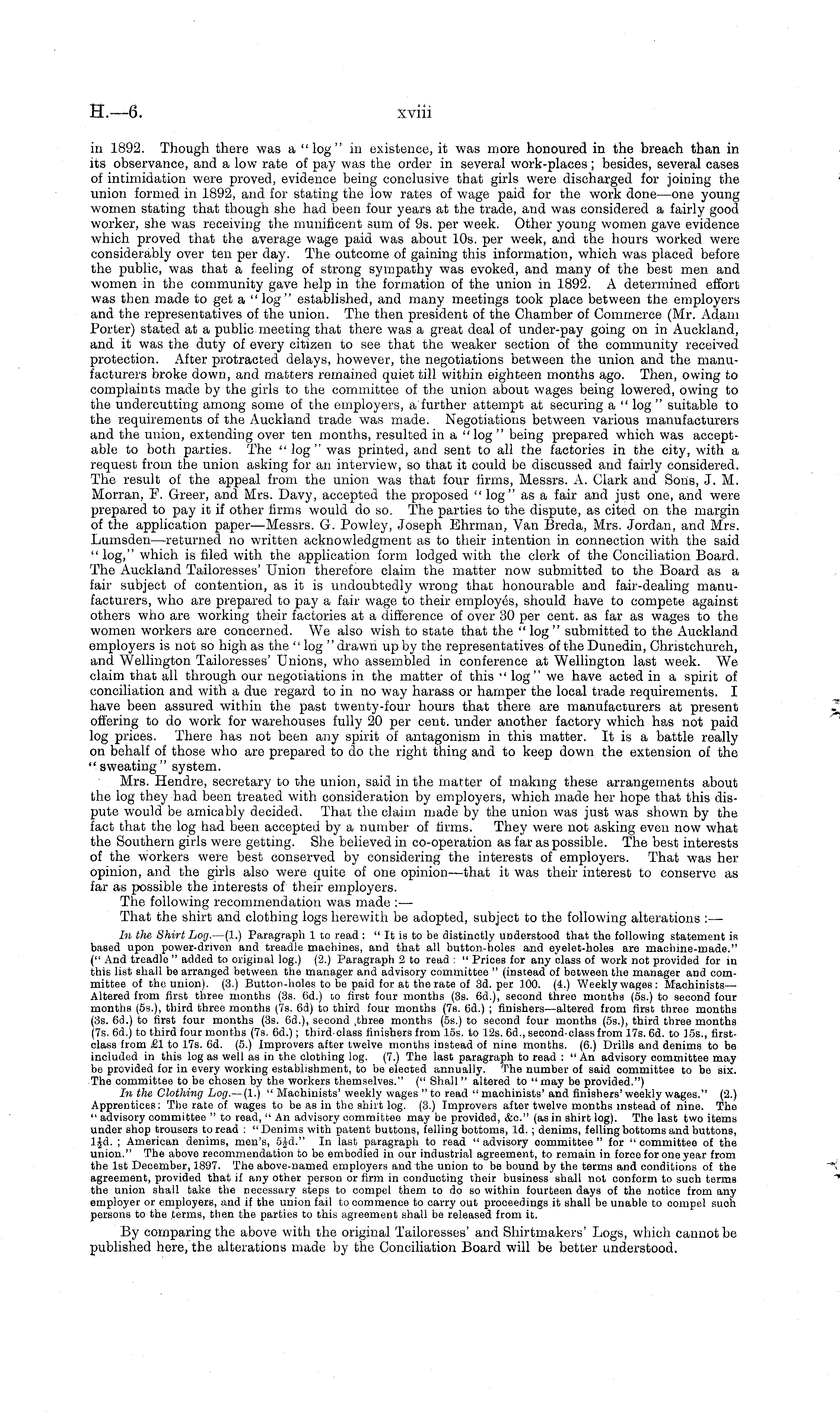 in 1892. Though there was a "log" in existence, it was more honoured in the breach than in its observance, and a low rate of pay was the order in several work-places; besides, several cases of intimidation were proved, evidence being conclusive that girls were discharged for joining the union formed in 1892, and for stating the low rates of wage paid for the work done—one young women stating that though she had been four years at the trade, and was considered a fairly good worker, she was receiving the munificent sum of 9s. per week. Other young women gave evidence which proved that the average wage paid was about 10s. per week, and the hours worked were considerably over ten per day. The outcome of gaining this information, which was placed before the public, was that a feeling of strong sympathy was evoked, and many of the best men and women in the community gave help in the formation of the union in 1892. A determined effort was then made to get a "log" established, and many meetings took place between the employers and the representatives of the union. The then president of the Chamber of Commerce (Mr. Adam Porter) stated at a public meeting that there was a great deal of under-pay going on in Auckland, and it was the duty of every citizen to see that the weaker section of the community received protection. After protracted delays, however, the negotiations between the union and the manufacturers broke down, and matters remained quiet till within eighteen months ago. Then, owing to complaints made by the girls to the committee of the union about wages being lowered, owing to the undercutting among some of the employers, a further attempt at securing a " log" suitable to the requirements of the Auckland trade was made. Negotiations between various manufacturers and the union, extending over ten months, resulted in a "log " being prepared which was acceptable to both parties. The " log " was printed, and sent to all the factories in the city, with a request from the union asking for an interview, so that it could be discussed and fairly considered. The result of the appeal from the union was that four firms, Messrs. A. Clark and Sons, J. M. Morran, F. Greer, and Mrs. Davy, accepted the proposed " log" as a fair and just one, and were prepared to pay it if other firms would do so. The parties to the dispute, as cited on the margin of the application paper —Messrs. G. Powley, Joseph Ehrman, Van Breda, Mrs. Jordan, and Mrs. Lumsden—returned no written acknowledgment as to their intention in connection with the said " log," which is filed with the application form lodged with the clerk of the Conciliation Board. The Auckland Tailoresses' Union therefore claim the matter now submitted to the Board as a fair subject of contention, as it is undoubtedly wrong that honourable and fair-dealing manufacturers, who are prepared to pay a fair wage to their employes, should have to compete against others who are working their factories at a difference of over 30 per cent, as far as wages to the women workers are concerned. We also wish to state that the " log " submitted to the Auckland employers is not so high as the " log "drawn up by the representatives of the Dunedin, Christchurch, and Wellington Tailoresses' Unions, who assembled in conference at Wellington last week. We claim that all through our negotiations in the matter of this " log" we have acted in a spirit of conciliation and with a due regard to in no way harass or hamper the local trade requirements. I have been assured within the past twenty-four hours that there are manufacturers at present offering to do work for warehouses fully 20 per cent, under another factory which has not paid log prices. There has not been any spirit of antagonism in this matter. It is a battle really on behalf of those who are prepared to do the right thing and to keep down the extension of the " sweating " system. Mrs. Hendre, secretary to the union, said in the matter of making these arrangements about the log they had been treated with consideration by employers, which made her hope that this dispute would be amicably decided. That the claim made by the union was just was shown by the fact that the log had been accepted by a number of firms. They were not asking even now what the Southern girls were getting. She believed in co-operation as far as possible. The best interests of the workers were best conserved by considering the interests of employers. That was her opinion, and the girls also were quite of one opinion—that it was their interest to conserve as far as possible the interests of' their employers. The following recommendation was made : — That the shirt and clothing logs herewith be adopted, subject to the following alterations :— In the Shirt Log. —(l.) Paragraph 1 to read : " It is to be distinctly understood that the following statement is based upon power-driven and treadle machines, and that all button-holes and eyelet-holes are machine-made." (" And treadle " added to original log.) (2.) Paragraph 2to read : " Prices for any class of work not provided for in this list shall be arranged between the manager and advisory committee " (instead of between the manager and committee of the union). (3.) Button-holes to be paid for at the rate of 3d. per 100. (4.) Weekly wages: Machinists— Altered from first three months (3s. 6d.) to first four months (3s. 6d.), second three months (55.) to second four months (55.), third three months (7s. 6d) to third four months (7s. 6d.) ; finishers —altered from first three months (3s. 6d.) to first four months (3s. 6d.), second .three months (55.) to second four months (55.), third three months (7s. 6d.j to third four months (7s. 6d.); third-class finishers from 15s. to 12s. 6d., second-class from 17s. 6d. to 155., firstclass from £1 to 17s. 6d. (5.) Improvers after twelve months instead of nine months. (6.) Drills and denims to be included in this log as well as in the clothing log. (7.) Th