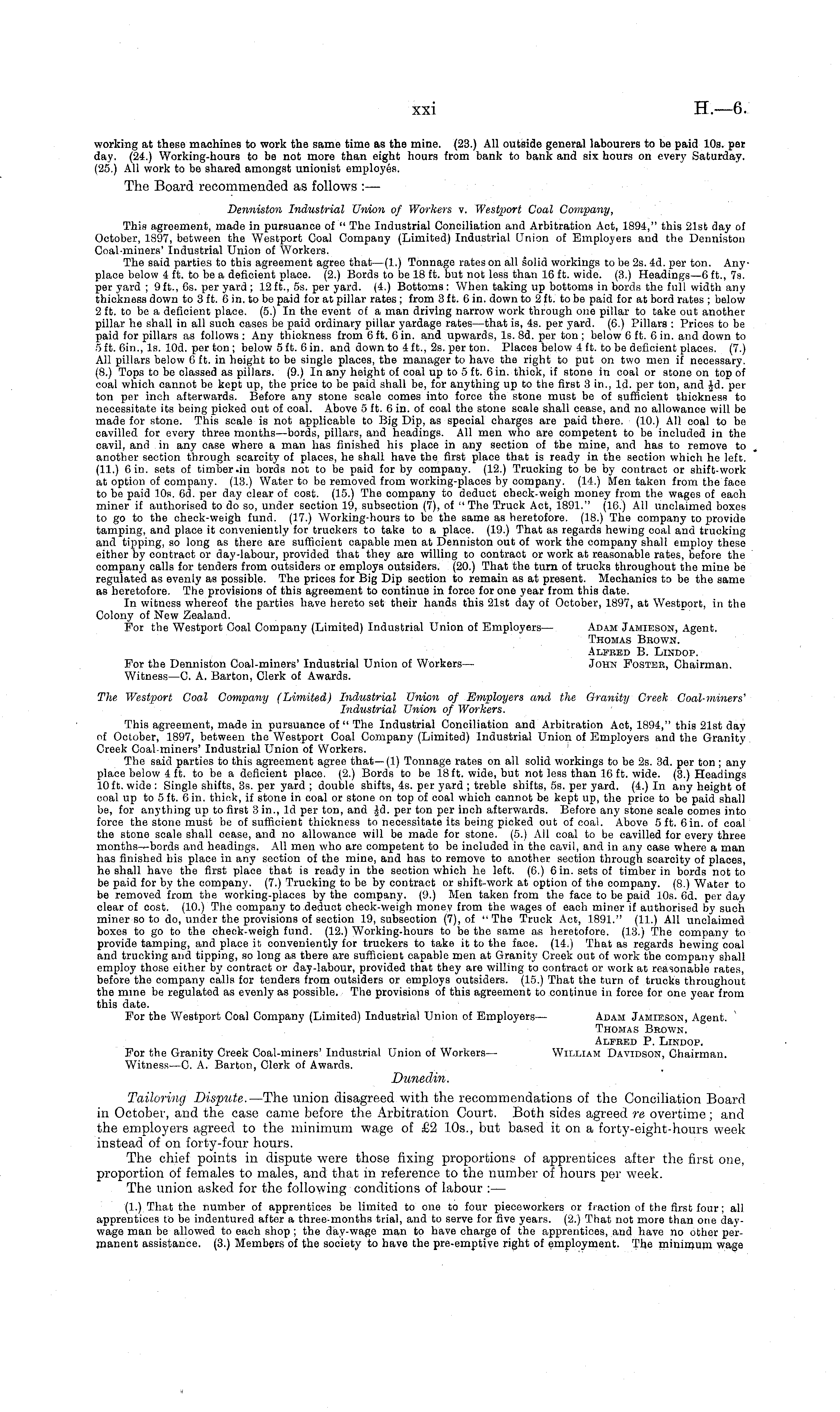 working at these machines to work the same time as the mine. (23.) All outside general labourers to be paid 10s. per day. (24.) Working-hours to be not more than eight hours from bank to bank and six hours on every Saturday. (25.) All work to be shared amongst unionist employes. The Board recommended as follows :— Denniston Industrial Union of Workers v. Westport Coal Company, This agreement, made in pursuance of " The Industrial Conciliation and Arbitration Act, 1894," this 21st day of October, 1897, between the Westport Coal Company (Limited) Industrial Union of Employers and the Denniston Coal-miners' Industrial Union of Workers. The said parties to this agreement agree that —(1.) Tonnage rates on all solid workings to be 2s. 4d. per ton. Any place below 4 ft. to be a deficient place. (2.) Bords to be 18 ft. but not less than 16 ft. wide. (3.) Headings—6 ft., 7s. per yard ; 9ft., 6s. per yard ; 12ft., ss. per yard. (4.) Bottoms: When taking up bottoms in bords the full width any thickness down to 3 ft. 6 in. to be paid for at pillar rates ; from 3 ft. 6 in. down to 2 ft. to be paid for at bord rates ; below 2 ft. to be a deficient place. (5.) In the event of a man driving narrow work through one pillar to take out another pillar he shall in all such cases be paid ordinary pillar yardage rates—that is, 4s. per yard. (6.) Pillars : Prices to be paid for pillars as follows : Any thickness from 6 ft. 6 in. and upwards, Is. Bd. per ton ; below 6 ft. 6 in. and down to 5 ft. 6in., Is. lOd. per ton ; below 5 ft. 6 in. and down to 4 ft., 2s. per ton. Places below 4 ft. to be deficient places. (7.) All pillars below 6 ft. in height to be single places, the manager to have the right to put on two men if necessary. (8.) Tops to be classed as pillars. (9.) In any height of coal up to 5 ft. 6 in. thick, if stone in coal or stone on top of coal which cannot be kept up, the price to be paid shall be, for anything up to the first 3 in., Id. per ton, and Jd. per ton per inch afterwards. Before any stone scale comes into force the stone must be of sufficient thickness to necessitate its being picked out of coal. Above 5 ft. 6 in. of coal the stone scale shall cease, and no allowance will be made for stone. This scale is not applicable to Big Dip, as special charges are paid there. (10.) All coal to be cavilled for every three months—bords, pillars, and headings. All men who are competent to be included in the cavil, and in any case where a man has finished his place in any section of the mine, and has to remove to another section through scarcity of places, he shall have the first place that is ready in the section which he left. (11.) 6 in. sets of timber .in bords not to be paid for by company. (12.) Trucking to be by contract or shift-work at option of company. (13.) Water to be removed from working-places by company. (14.) Men taken from the face to be paid 10a. 6d. per day clear of cost. (15.) The company to deduct check-weigh money from the wages of each miner if authorised to do so, under section 19, subsection (7), of "The Truck Act, 1891." (16.) All unclaimed boxes to go to the check-weigh fund. (17.) Working-hours to be the same as heretofore. (18.) The company to provide tamping, and place it conveniently for truckers to take to a place. (19.) That as regards hewing coal and trucking and tipping, so long as there are sufficient capable men at Denniston out of work the company shall employ these either by contract or day-labour, provided that they are willing to contract or work at reasonable rates, before the company calls for tenders from outsiders or employs outsiders. (20.) That the turn of trucks throughout the mine be regulated as evenly as possible. The prices for Big Dip section to remain as at present. Mechanics to be the same as heretofore. The provisions of this agreement to continue in force for one year from this date. In witness whereof the parties have hereto set their hands this 21st day of October, 1897, at Westport, in the Colony of New Zealand. For the Westport Coal Company (Limited) Industrial Union of Employers— Adam Jamieson, Agent. Thomas Bbown. Alfbed B. Lindop. For the Denniston Coal-miners' Industrial Union of Workers— John Fosteb, Chairman. Witness —C. A. Barton, Clerk of Awards. The Westport Coal Company (Limited) Industrial Union of Employers and the Granity Creek Coal-miners' Industrial Union of Workers. This agreement, made in pursuance of " The Industrial Conciliation and Arbitration Act, 1894," this 21st day of October, 1897, between the Westport Coal Company (Limited) Industrial Union of Employers and the Granity Creek Coal-miners' Industrial Union of Workers. The said parties to this agreement agree that—(l) Tonnage rates on all solid workings to be 2s. 3d. per ton ; any place below 4 ft. to be a deficient place. (2.) Bords to be 18 ft. wide, but not less than 16 ft. wide. (3.) Headings 10 ft. wide : Single shifts, 3s. per yard ; double shifts, 4s. per yard ; treble shifts, ss. per yard. (4.) In any height of coal up to 5 ft. 6 in. thick, if stone in coal or stone on top of coal which cannot be kept up, the price to be paid shall be, for anything up to first 3 in., Id per ton, and Jd. per ton per inch afterwards. Before any stone scale comes into force the stone must be of sufficient thickness to necessitate its being picked out of coal. Above 5 ft. 6in. of coal the stone scale shall cease, and no allowance will be made for stone. (5.) All coal to be cavilled for every three months—bords and headings. All men who are competent to be included in the cavil, and in any case where a man has finished his place in any section of the mine, and has to remove to another section through scarcity of places, he shall have the first place that is ready in the section which he left. (6.) 6 in. sets of timber in bords not to be paid for by the company. (7.) Trucking to be by contract or shift-work at option of the company. (8.) Water to be removed from t