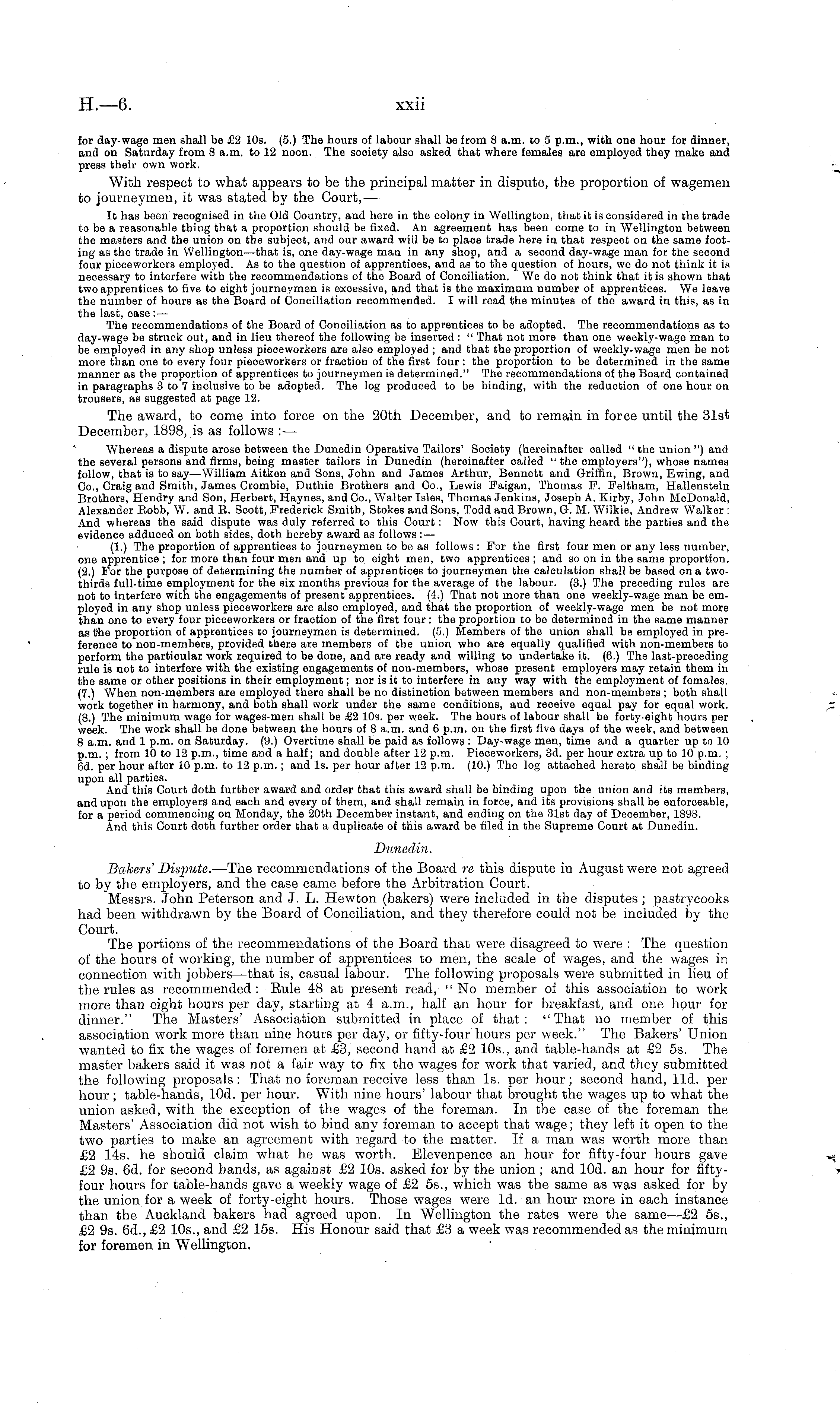 for day-wage men shall be £2 10s. (5.) The hours of labour shall be from 8 a.m. to 5 p.m., with one hour for dinner, and on Saturday from 8 a.m. to 12 noon. The society also asked that where females are employed they make and press their own work. With respect to what appears to be the principal matter in dispute, the proportion of wagemen to journeymen, it was stated by the Court, — It has been recognised in the Old Country, and here in the colony in Wellington, that it is considered in the trade to be a reasonable thing that a proportion should be fixed. An agreement has been come to in Wellington between the masters and the union on the subject, and our award will be to place trade here in that respect on the same footing as the trade in Wellington—that is, one day-wage man in any shop, and a second day-wage man for the second four pieceworkers employed. As to the question of apprentices, and as to the question of hours, we do not think it is necessary to interfere with the recommendations of the Board of Conciliation. We do not think that it is shown that two apprentices to five to eight journeymen is excessive, and that is the maximum number of apprentices. We leave the number of hours as the Board of Conciliation recommended. I will read the minutes of the award in this, as in the last, case :— The recommendations of the Board of Conciliation as to apprentices to be adopted. The recommendations as to day-wage be struck out, and in lieu thereof the following be inserted : " That not more than one weekly-wage man to be employed in any shop unless pieceworkers are also employed ; and that the proportion of weekly-wage men be not more than one to every four pieceworkers or fraction of the first four : the proportion to be determined in the same manner as the proportion of apprentices to journeymen is determined." The recommendations of the Board contained in paragraphs 3to 7 inclusive to be adopted. The log produced to be binding, with the reduotion of one hour on trousers, as suggested at page 12. The award, to come into force on the 20th December, and to remain in force until the 31st December, 1898, is as follows :— Whereas a dispute arose between the Dunedin Operative Tailors' Society (hereinafter called " the union ") and the several persons and firms, being master tailors in Dunedin (hereinafter called " the employers"), whose names follow, that is to say —William Aitken and Sons, John and James Arthur, Bennett and Griffin, Brown, Ewing, and Co., Craig and Smith, James Crombie, Duthie Brothers and Co., Lewis Faigan, Thomas F. Feltham, Hallensteiu Brothers, Hendry and Son, Herbert, Haynes, and Co., Walter Isles, Thomas Jenkins, Joseph A. Kirby, John McDonald, Alexander Bobb, W. and B. Scott, Frederick Smith, Stokes and Sons, Todd and Brown, G. M. Wilkie, Andrew Walker : And whereas the said dispute was duly referred to this Court: Now this Court, having heard the parties and the evidence adduced on both sides, doth hereby award as follows: — (1.) The proportion of apprentices to journeymen to be as follows : For the first four men or any less number, one apprentice ; for more than four men and up to eight men, two apprentices; and so on in the same proportion. (2.) For the purpose of determining the number of apprentices to journeymen the calculation shall be based on a twothirds full-time employment for the six months previous for the average of the labour. (3.) The preceding rules are not to interfere with the engagements of present apprentices. (4.) That not more than one weekly-wage man be employed in any shop unless pieceworkers are also employed, and that the proportion of weekly-wage men be not more than one to every four pieceworkers or fraction of the first four: the proportion to be determined in the same manner as the proportion of apprentices to journeymen is determined. (5.) Members of the union shall be employed in preference to non-members, provided there are members of the union who are equally qualified with non-members to perform the particular work required to be done, and are ready and willing to undertake it. (6.) The last-preceding rule is not to interfere with the existing engagements of non-members, whose present employers may retain them in the same or other positions in their employment; nor is it to interfere in any way with the employment of females. (7.) When non-members are employed there shall be no distinction between members and non-members ; both shall work together in harmony, and both shall work under the same conditions, and receive equal pay for equal work. (8.) The minimum wage for wages-men shall be £2 10s. per week. The hours of labour shall be forty-eight hours per week. The work shall be done between the hours of 8 a.m. and 6 p.m. on the first five days of the week, and between 8 a.m. and 1 p.m. on Saturday. (9.) Overtime shall be paid as follows : Day-wage men, time and a quarter up to 10 p.m. ; from 10 to 12 p.m., time and a half; and double after 12 p.m. Pieceworkers, 3d. per hour extra up to 10 p.m. ; 6d. per hour after 10 p.m. to 12 p.m. ; and la. per hour after 12 p.m. (10.) The log attached hereto shall be binding upon all parties. And this Court doth further award and order that this award shall be binding upon the union and its members, and upon the employers and each and every of them, and shall remain in force, and its provisions shall be enforceable, for a period commencing on Monday, the 20th December instant, and ending on the 31st day of December, 1898. And this Court doth further order that a duplicate of this award be filed in the Supreme Court at Dunedin. Dunedin. Bakers' Dispute.— -The recommendations of the Board re this dispute in August were not agreed to by the employers, and the case came before the Arbitration Court. Messrs. John Peterson and J. L. Hewton (bakers) were included in the disputes ; pastrycooks had been withdrawn by the Board of Conciliation, and they therefore could not be included by