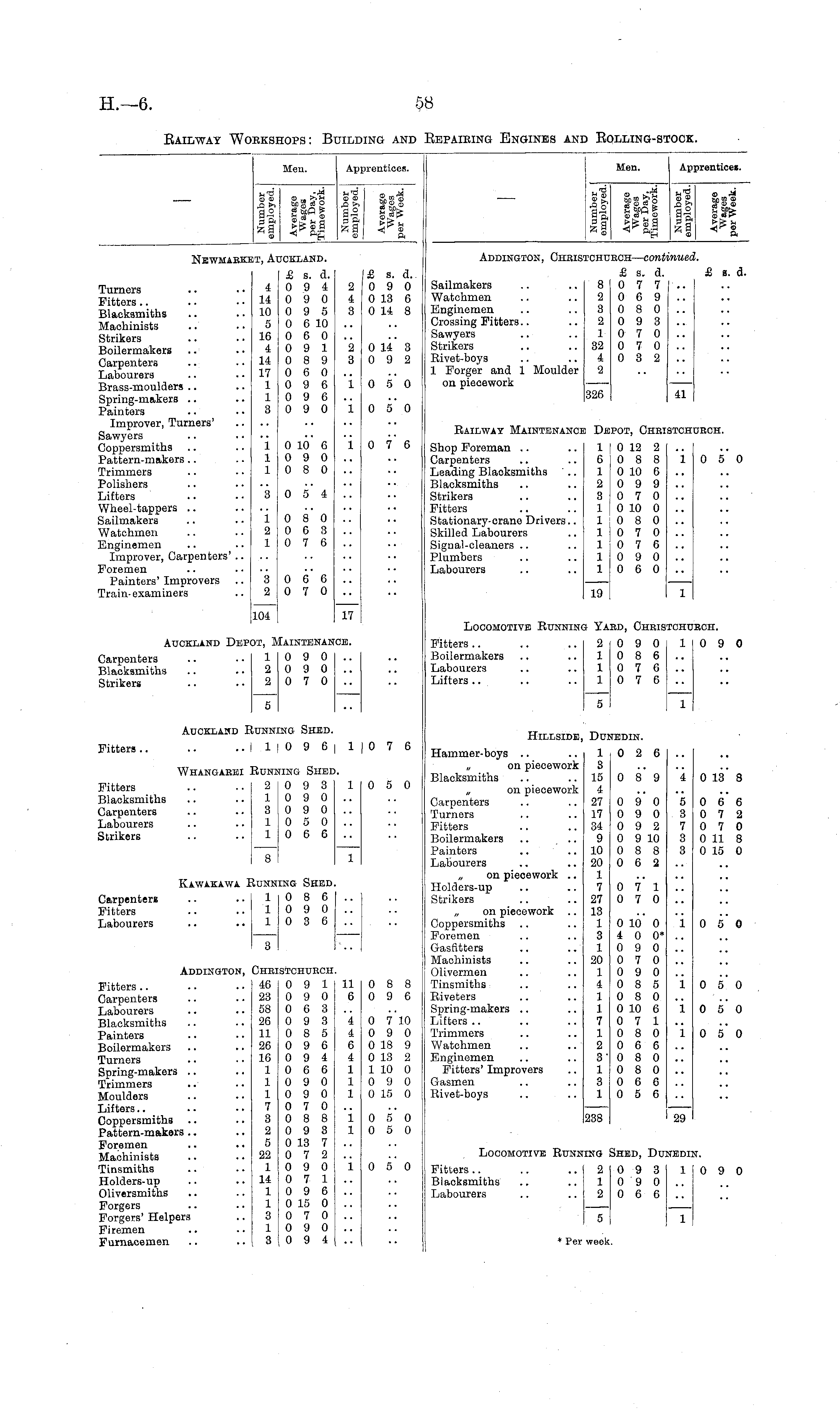 Men. Ap; )rentices. Men. Apprentices. A ►> A3 tl! cS o *4-c3 Q O a ft Sa ft . 13 ..id H 01 OJ ."CJ OS Sod 5.3 O EC 1 4) O c3 CJ a2 g SbQ & a & S ca" 2 A g < ftg g CD 32 Sft o 4* <D _ a Newmabki IT, Al JCKLAND. Addington, Chbistchtj ICH rECH — continued. ',UCl Turners Fitters Blacksmiths Machinists Strikers Boilermakers Carpenters Labourers Brass-moulders Spring-makers Painters Improver, Turners' Sawyers Coppersmiths Pattern-makers Trimmers Polishers Lifters Wheel-tappers Sailmakers Watchmen Enginemen Improver, Carpenters' .. Foremen Painters' Improvers Train-examiners 4 14 10 5 16 4 14 17 1 1 3 £ s. d. 0 9 4 0 9 0 0 9 5 0 6 10 0 6 0 0 9 1 0 8 9 0 6 0 0 9 6 0 9 6 0 9 0 2 4 3 £ s. d. 0 9 0 0 13 6 0 14 8 Sailmakers .. .. 8 Watchmen .. .. 2 Enginemen .. .. 3 Crossing Fitters.. .. 2 Sawyers .. .. 1 Strikers .. ..32 Rivet-boys .. .. 4 1 Forger and 1 Moulder 2 on piecework 326 8 2 3 2 1 32 4 2 £ s. d. £ s. d 0 7 7.. 0 6 9.. 0 8 0.. 0 9 3.. 0 7 0 .. 0 7 0.. 0 3 2.. £ s. d. - 2 3 0 li' 3 0 9 2 i 0 5' 0 326 41 41 l 0 50 IPOT, Cheistchuech. [JECH. Railway Maintenance De 1 1 1 0 10 6 0 9 0 0 8 0 i 0 7 6 I De STCHi .3 1 2 1 0 5' 4 0 8 0 0 6 3 0 7 6 Shop Foreman .. .. 1 j Carpenters .. .. 6 Leading Blacksmiths ' .. 1 Blacksmiths .. .. 2 Strikers .. .. 3 Fitters .. .. 1 j Stationary-crane Drivers.. 1 Skilled Labourers .. 1 - Signal-cleaners .. .. 1 Plumbers .. .. 1 Labourers .. .. 1 19 1 i 6 I 1 2 3 1 [ 1 1 i 1 I 1 1 0 12 2 .. 0 8 8 10 5 0 0 10 6 0 9 9.. 0 7 0.. [ 0 10 0 .. 0 8 0.. 0 7 0.. j 0 7 6 .. 0 9 0.. 0 6 0.. 1 i 0 50 3 2 0 66 0 7 0 19 ed, Cheistchuech. 0 9 0 10 9 0 0 8 6.. 0 7 6.. 0 7 6.. 1 1 104 17 Locomotive Running Ya: i Ya: Auckland Depi OT, IV 1 2 2 Iaintenan :ce. Carpenters Blacksmiths Strikers 0 9 0 0 9 0 0 7 0 Fitters .. .. .. 2 i Boilermakers .. .. 1 Labourers .. .. 1 Lifters .. .. .. 1 5 2 I 1 1 1 5 5 Auckland if tUNNl [ng Shed. 0 7 6 Hillside, Dui STEDIN. Fitters .. .. .. I I 1 0 9 6 Hammer-boys .. .. 1 „ on piecework 3 Blacksmiths .. .. 15 „ on piecework 4 Carpenters .. 27 Turners .. .. 17 Fitters .. ..34 Boilermakers .. .. 9 Painters .. .. 10 Labourers .. .. 20 on piecework .. 1 Holders-up .. .. 7 Strikers .. ..27 „ on piecework .. 13 Coppersmiths .. .. 1 Foremen .. .. 3 Gasfitters .. .. 1 Machinists .. ..20 Olivermen .. .. 1 Tinsmiths .. .. 4 Riveters .. .. 1 Spring-makers .. .. 1 Lifters .. .. .. 7 Trimmers .. .. 1 Watchmen .. .. 2 Enginemen .. .. 3" Fitters' Improvers .. 1 Gasmen .. .. 3 Rivet-boys .. .. 1 0 2 6.. Whangaeei '. Runis wng Shed 0 9 3 0 9 0 0 9 0 0 5 0 0 6 6 0 5 0 0 8 9 4 0 13 - 8 "i I. Fitters Blacksmiths Carpenters Labourers Strikers 2 1 3 1 1 1 0 9 0 5 0 6 6 0 9 0 3 0 7 2 0 9 2 7 0 7 0 0 9 10 3 0 11 8 0 8 8 3 0 15 0 0 6 2.. 5 3 7 3 8 8 1 Kawakawa I Carpenters Fitters Labourers Uunn: 1 1 1 ing Shed, 0 8 6 0 9 0 0 3 6 0 7 1.. .. 0 7 0.. 0 10 0 10 5 0 4 0 0*.. 0 9 0.. 0 7 0.. 0 9 0.. 0 8 5 10 5 0 0 8 0 .. 0 10 6 10 5 0 0 7 1.. 0 8 0 10 5 0 0 6 6.. 0 8 0.. 0 8 0.. 0 6 6.. 0 5 6.. 1 29 1 3 Addington, Fitters Carpenters Labourers Blacksmiths Painters Boilermakers Turners Spring-makers Trimmers Moulders Lifters Coppersmiths Pattern-makers Foremen Machinists Tinsmiths Holders-up Oliversmiths Forgers Forgers' Helpers Firemen Furnacemen Chbi 46 23 58 26 11 26 16 1 1 1 7 3 2 5 22 1 14 1 1 3 1 3 :STCHUHCH 0 9 1 0 9 0 0 6 3 0 9 3 0 8 5 0 9 6 0 9 4 0 6 6 0 9 0 0 9 0 0 7 0 0 8 8 0 9 3 0 13 7 0 7 2 0 9 0 0 7 1 0 9 6 0 15 0 0 7 0 0 9 0 0 9 4 11 6 4 4 6 4 1 1 1 0 8 8 0 9 6 0 7 10 0 9 0 0 18 9 0 13 2 1 10 0 0 9 0 0 15 0 i i i i 1 0 50 0 5 0 338 1 29 1 0 50 Locomotive Running i Shed, Dunedin. 0 9 3 10 9 0 0 9 0.. 0 6 6.. NEDII I, Fitters .. .. .. 3 Blacksmiths .. .. 1 Labourers .. .. 3 5 1 0 9 0 1 * Per week
