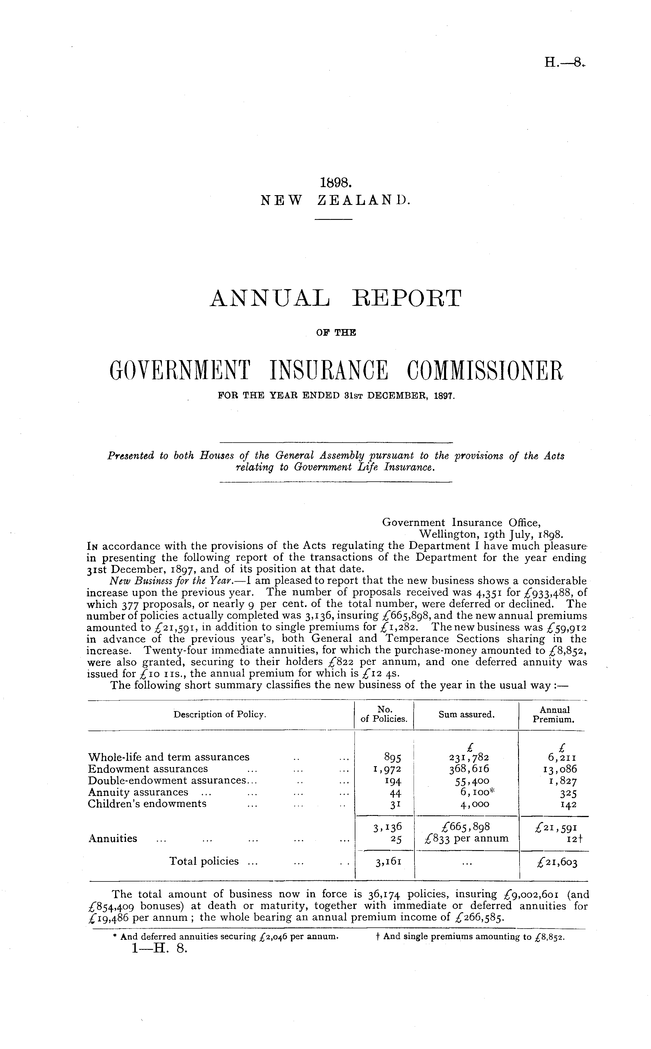 Government Insurance Office, Wellington, 19th July, 1898. In accordance with the provisions of the Acts regulating the Department I have much pleasure in presenting the following report of the transactions of the Department for the year ending 31st December, 1897, and of its position at that date. New Business for the Year. —l am pleased to report that the new business shows a considerable increase upon the previous year. The number of proposals received was 4,351 for £933,488, of which 377 proposals, or nearly 9 per cent, of the total number, were deferred or declined. The number of policies actually completed was 3,136, insuring and the new annual premiums amounted to in addition to single premiums for £1,282. The new business was in advance of the previous year's, both General and Temperance Sections sharing in the increase. Twenty-four immediate annuities, for which the purchase-money amounted to were also granted, securing to their holders £822 per annum, and one deferred annuity was issued for us., the annual premium for which is £12 4s. The following short summary classifies the new business of the year in the usual way :—