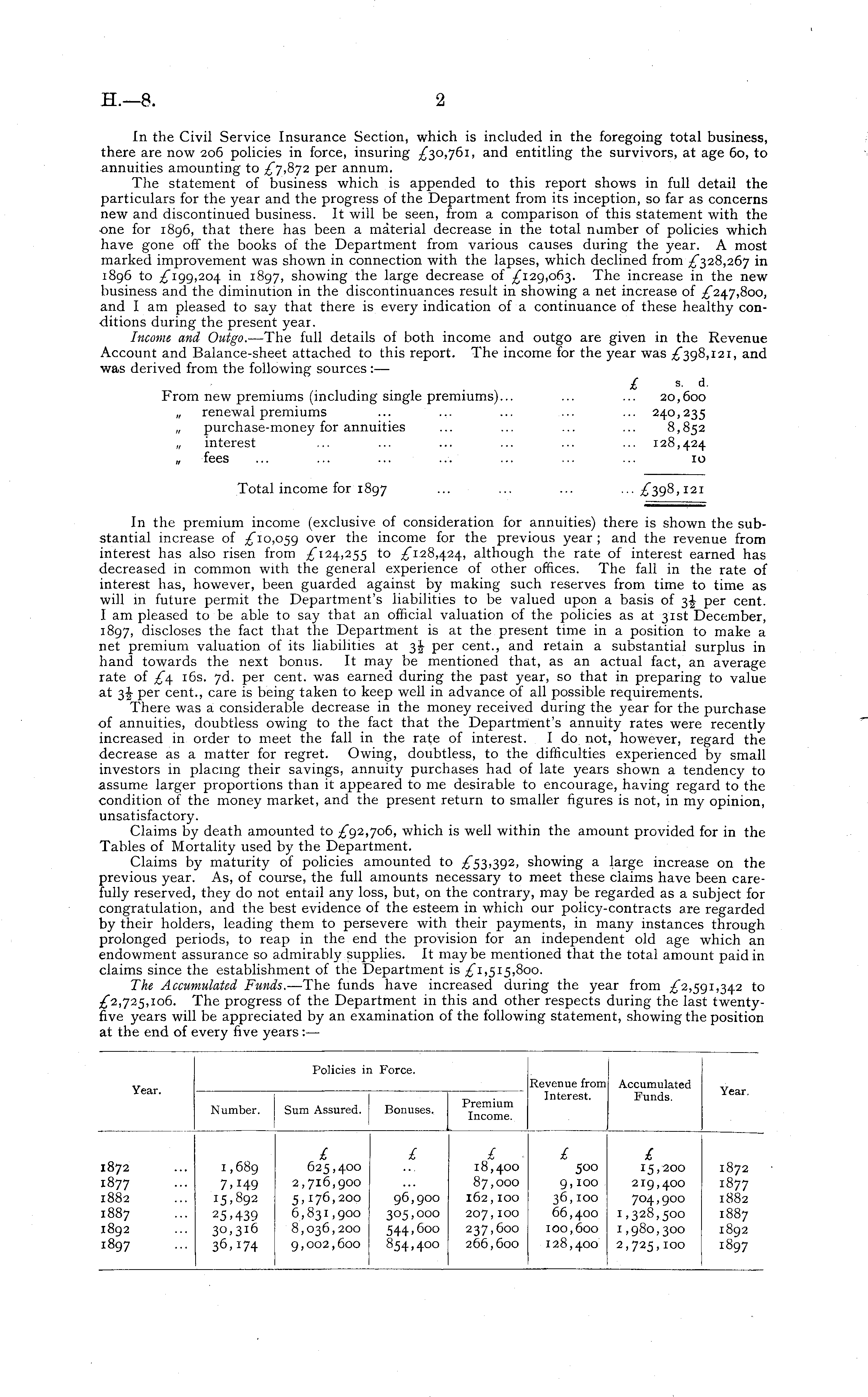 In the Civil Service Insurance Section, which is included in the foregoing total business, there are now 206 policies in force, insuring and entitling the survivors, at age 60, to annuities amounting to per annum. The statement of business which is appended to this report shows in full detail the particulars for the year and the progress of the Department from its inception, so far as concerns new and discontinued business. It will be seen, from a comparison of this statement with the ■one for 1896, that there has been a material decrease in the total number of policies which have gone off the books of the Department from various causes during the year. A most marked improvement was shown in connection with the lapses, which declined from in 1896 to ,£"199,204 in 1897, showing the large decrease of The increase in the new business and the diminution in the discontinuances result in showing a net increase of and I am pleased to say that there is every indication of a continuance of these healthy conditions during the present year. Income and Outgo. —The full details of both income and outgo are given in the Revenue Account and Balance-sheet attached to this report. The income for the year was and was derived from the following sources:— £ s - d - From new premiums (including single premiums)... ... ... 20,600 „ renewal premiums ... ... ... ... ... 240,235 „ purchase-money for annuities ... ... ... ... 8,852 „ interest ... ... ... ... ... ... 128,424 „ fees ... ... ... ... ... ... ... 10 Total income for 1897 ... ... ... ... 121 In the premium income (exclusive of consideration for annuities) there is shown the substantial increase of over the income for the previous year ; and the revenue from interest has also risen from to although the rate of interest earned has decreased in common with the general experience of other offices. The fall in the rate of interest has, however, been guarded against by making such reserves from time to time as will in future permit the Department's liabilities to be valued upon a basis of 3J per cent. I am pleased to be able to say that an official valuation of the policies as at 31st December, 1897, discloses the fact that the Department is at the present time in a position to make a net premium valuation of its liabilities at 3J per cent., and retain a substantial surplus in hand towards the next bonus. It may be mentioned that, as an actual fact, an average rate of £\ 16s. 7d. per cent, was earned during the past year, so that in preparing to value at 3|- per cent., care is being taken to keep well in advance of all possible requirements. There was a considerable decrease in the money received during the year for the purchase of annuities, doubtless owing to the fact that the Department's annuity rates were recently increased in order to meet the fall in the rate of interest. Ido not, however, regard the decrease as a matter for regret. Owing, doubtless, to the difficulties experienced by small investors in placing their savings, annuity purchases had of late years shown a tendency to assume larger proportions than it appeared to me desirable to encourage, having regard to the condition of the money market, and the present return to smaller figures is not, in my opinion, unsatisfactory. Claims by death amounted to which is well within the amount provided for in the Tables of Mortality used by the Department. Claims by maturity of policies amounted to showing a large increase on the previous year. As, of course, the full amounts necessary to meet these claims have been carefully reserved, they do not entail any loss, but, on the contrary, may be regarded as a subject for congratulation, and the best evidence of the esteem in which our policy-contracts are regarded by their holders, leading them to persevere with their payments, in many instances through prolonged periods, to reap in the end the provision for an independent old age which an endowment assurance so admirably supplies. It may be mentioned that the total amount paid in claims since the establishment of the Department is The Accumulated Funds. —The funds have increased during the year from to The progress of the Department in this and other respects during the last twentyfive years will be appreciated by an examination of the following statement, showing the position at the end of every five years : —