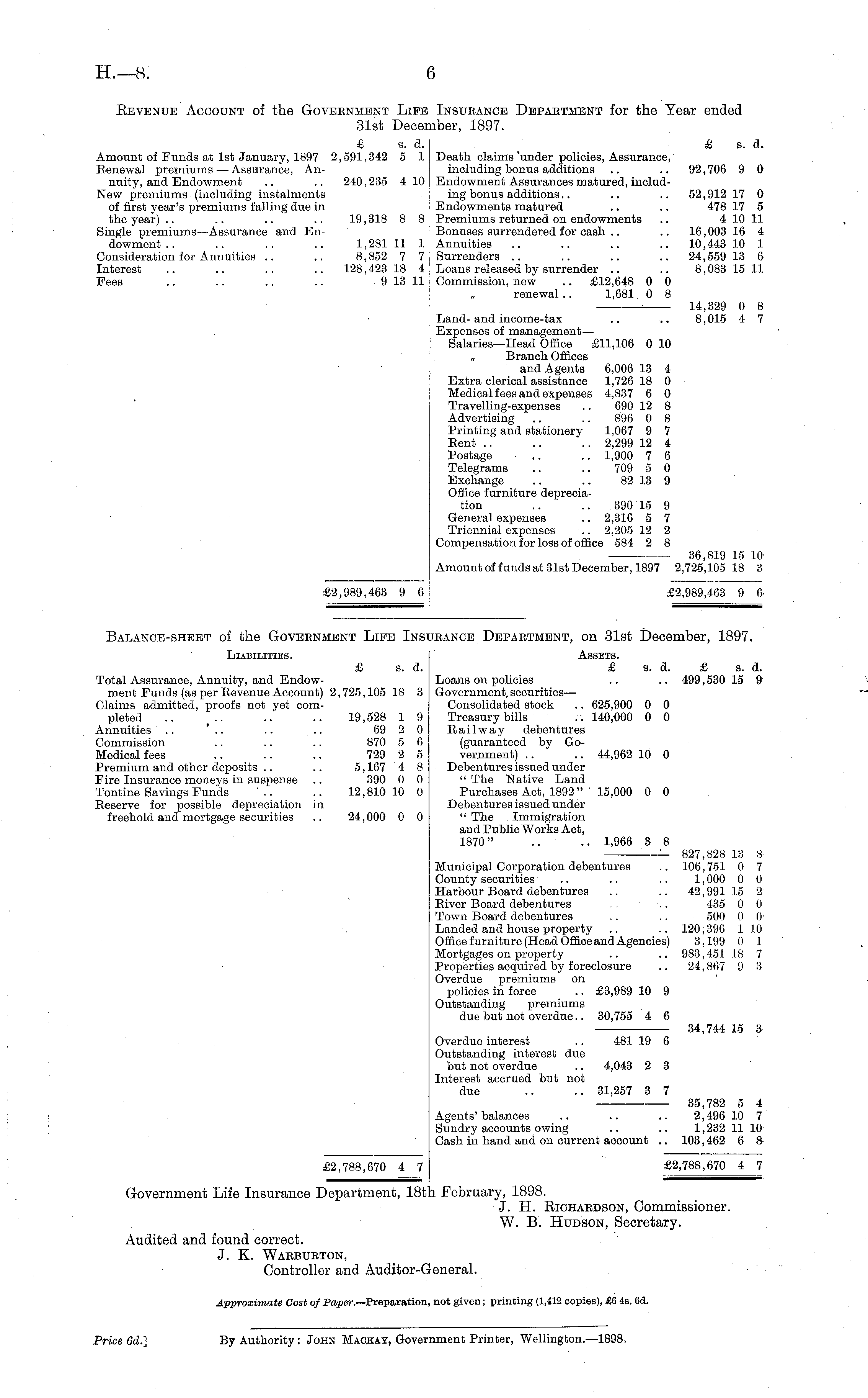 Eevbnub Account of the Government Life Insubance Depaetmbnt for the Year ended 31st December, 1897. £ s. d. £ s. d. Amount of Funds at Ist January, 1897 2,591,342 5 1 Death claims'under policies, Assurance, Renewal premiums — Assurance, An- including bonus additions .. .. 92,706 9 0 nuity, and Endowment .. .. 240,235 410 Endowment Assurances matured, includNew premiums (including instalments ing bonus additions.. .. .. 52,912 17 0 of first year's premiums falling due in Endowments matured .. .. 478 17 5 the year) .. .. .. .. 19,318 8 8 Premiums returned on endowments .. 410 11 Single premiums—Assurance and En- Bonuses surrendered for cash .. .. 16,003 16 4 dowment.. .. .. .. 1,281 11 1 Annuities .. .. .. .. 10,443 10 1 Consideration for Annuities .. .. 8,852 7 7 Surrenders .. .. .. .. 24,559 13 6 Interest .. .. .. .. 128,423 18 4 Loans released by surrender .. .. 8,083 15 11 Fees .. .. .. .. 9 13 11 Commission, new .. £12,648 0 0 renewal .. 1,681 0 8 . 14,329 0 8 Land-and income-tax .. .. 8,015 4 7 Expenses of management— Salaries—Head Office £11,106 010 „ Branch Offices and Agents 6,006 13 4 Extra clerical assistance 1,726 18 0 Medical fees and expenses 4,837 6 0 Travelling-expenses .. 690 12 8 Advertising .. .. 896 0 8 Printing and stationery 1,067 9 7 Eent .. .. .. 2,299 12 4 Postage .. .. 1,900 7 6 Telegrams .. .. 709 5 0 Exchange .. .. 82 13 9 Office furniture depreciation .. .. 390 IS 9 General expenses .. 2,316 5 7 Triennial expenses .. 2,205 12 2 Compensation for loss of office 584 2 8 36,819 15 10 Amount of funds at 31st December, 1897 2,725,105 18 3 £2,989,463 9 6 £2,989,463 9 6