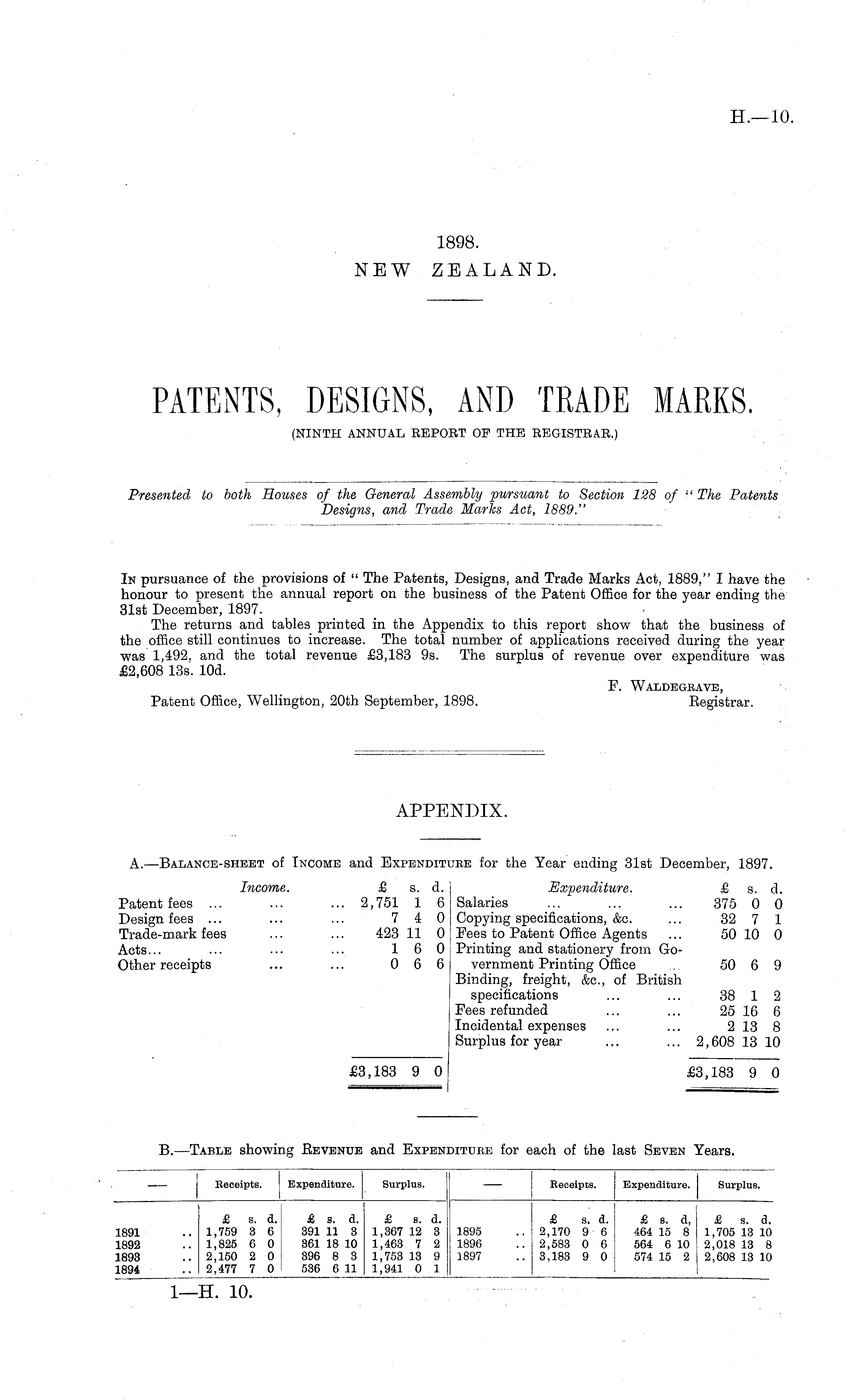 In pursuance of the provisions of " The Patents, Designs, and Trade Marks Act, 1889," I have the. honour to present the annual report on the business of the Patent Office for the year ending the 31st December, 1897. The returns and tables printed in the Appendix to this report show that the business of the office still continues to increase. The total number of applications received during the year was 1,492. and the total revenue £3,183 9s. The surplus of revenue over expenditure was £2,608 13s. 10d. P. Waldegrave, Patent Office, Wellington, 20th September, 1898. Eegistrar.