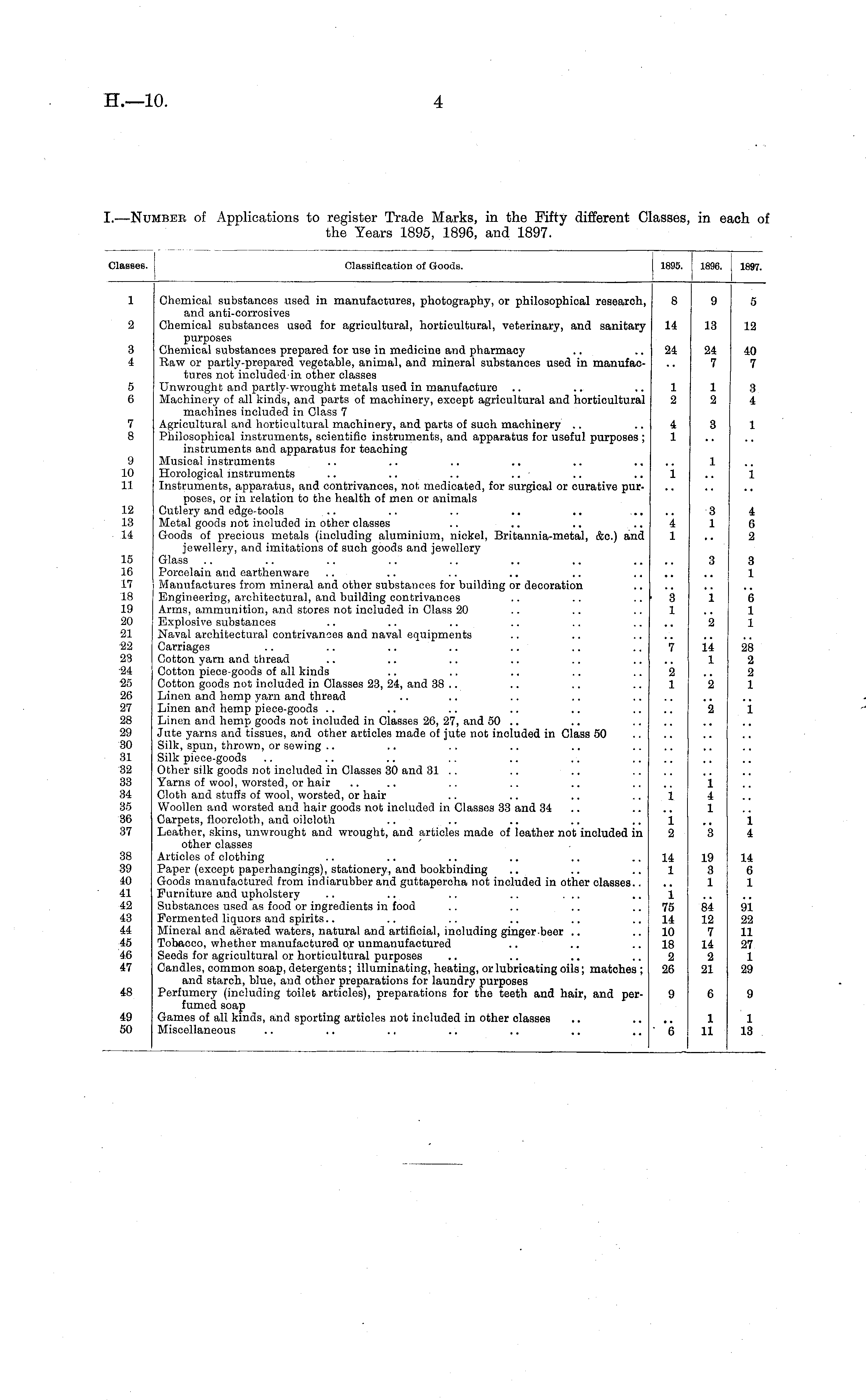 I. —Number of Applications to register Trade Marks, in the Fifty different Classes, in each of the Years 1895, 1896, and 1897.