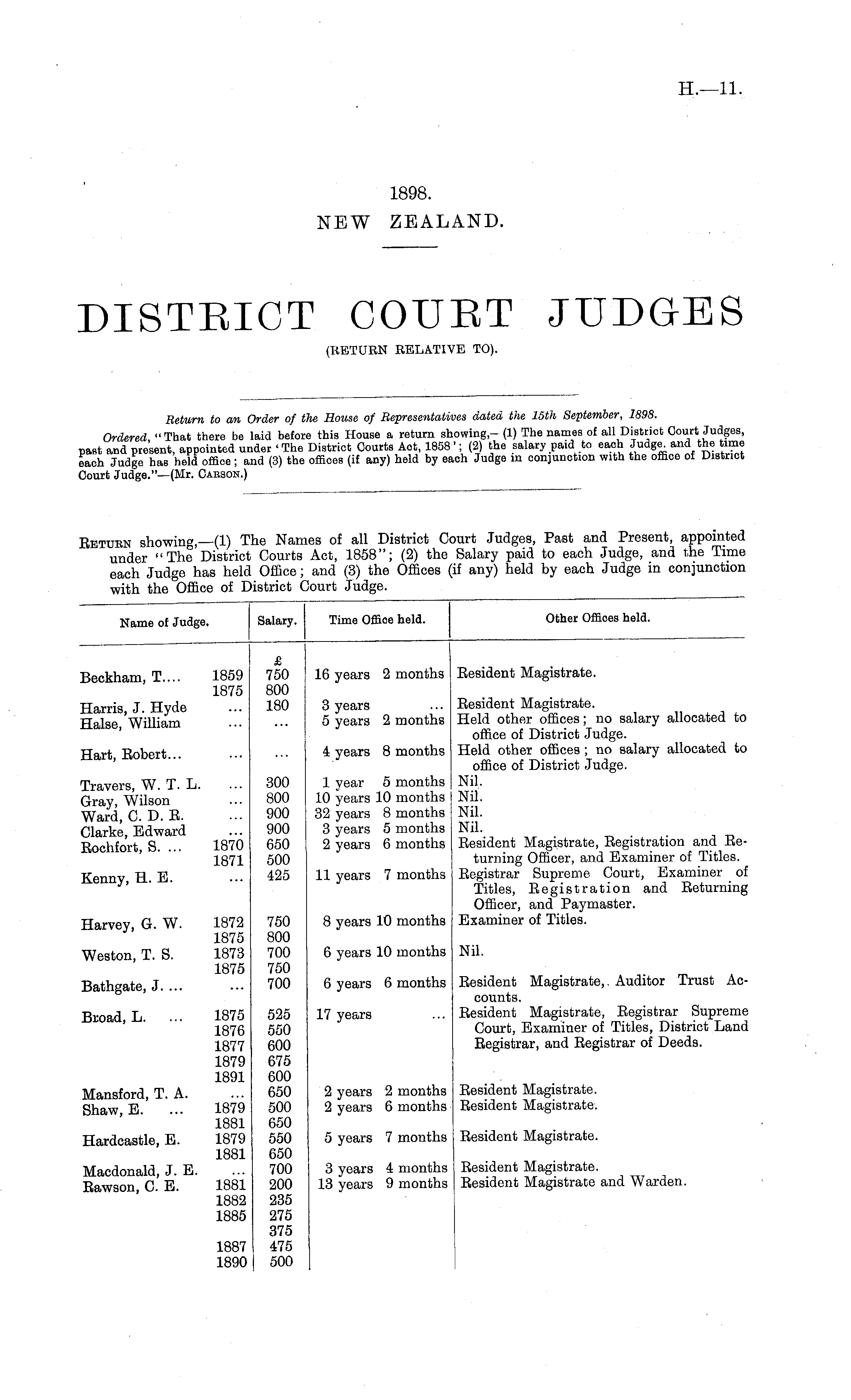 Return to an Order of the House of Representatives dated the 15th September, 1898. Ordered "That there be laid before this House a return showing,- (1) The names of all District Court Judges, past and present, appointed under 'The District Courts Act, 1858'; (2) the salary paid to each Judge, and the time each Judge has held office; and (3) the offices (if any) held by each Judge in conjunction with the office of District Court Judge."—(Mr. Caeson.)