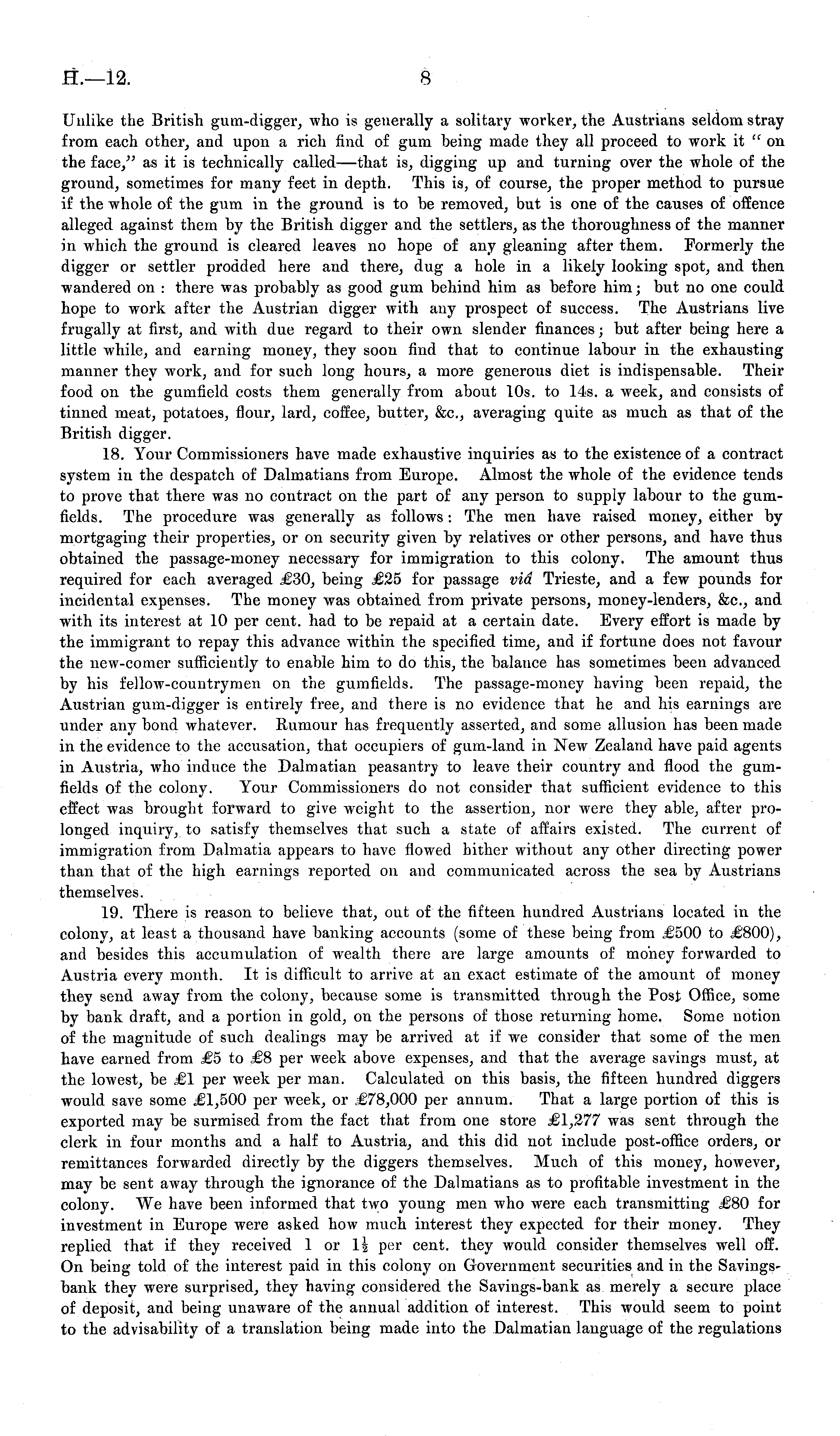 Unlike the British gum-digger, who is generally a solitary worker, the Austrians seldom stray from each other, and upon a rich find of gum being made they all proceed to work it " on the face," as it is technically called —that is, digging up and turning over the whole of the ground, sometimes for many feet in depth. This is, of course, the proper method to pursue if the whole of the gum in the ground is to be removed, but is one of the causes of offence alleged against them by the British digger and the settlers, as the thoroughness of the manner in which the ground is cleared leaves no hope of any gleaning after them. Formerly the digger or settler prodded here and there, dug a hole in a likely looking spot, and then wandered on : there was probably as good gum behind him as before him; but no one could hope to work after the Austrian digger with any prospect of success. The Austrians live frugally at first, and with due regard to their own slender finances ; but after being here a little while, and earning money, they soon find that to continue labour in the exhausting manner they work, and for such long hours, a more generous diet is indispensable. Their food on the gumfield costs them generally from about 10s. to 14s. a week, and consists of tinned meat, potatoes, flour, lard, coffee, butter, &c, averaging quite as much as that of the British digger. 18. Your Commissioners have made exhaustive inquiries as to the existence of a contract system in the despatch of Dalmatians from Europe. Almost the whole of the evidence tends to prove that there was no contract on the part of any person to supply labour to the gumfields. The procedure was generally as follows: The men have raised money, either by mortgaging their properties, or on security given by relatives or other persons, and have thus obtained the passage-money necessary for immigration to this colony. The amount thus required for each averaged £30, being £25 for passage via Trieste, and a few pounds for incidental expenses. The money was obtained from private persons, money-lenders, &c, and with its interest at 10 per cent, had to be repaid at a certain date. Every effort is made by the immigrant to repay this advance within the specified time, and if fortune does not favour the new-comer sufficiently to enable him to do this, the balance has sometimes been advanced by his fellow-countrymen on the gumfields. The passage-money having been repaid, the Austrian gum-digger is entirely free, and there is no evidence that he and his earnings are under any bond whatever. Rumour has frequently asserted, and some allusion has been made in the evidence to the accusation, that occupiers of gum-land in New Zealand have paid agents in Austria, who induce the Dalmatian peasantry to leave their country and flood the gumfields of the colony. Your Commissioners do not consider that sufficient evidence to this effect was brought forward to give weight to the assertion, nor were they able, after prolonged inquiry, to satisfy themselves that such a state of affairs existed. The current of immigration from Dalmatia appears to have flowed hither without any other directing power than that of the high earnings reported on and communicated across the sea by Austrians themselves. 19. There is reason to believe that, out of the fifteen hundred Austrians located in the colony, at least a thousand have banking accounts (some of these being from £500 to £800), and besides this accumulation of wealth there are large amounts of money forwarded to Austria every month. It is difficult to arrive at an exact estimate of the amount of money they send away from the colony, because some is transmitted through the Post Office, some by bank draft, and a portion in gold, on the persons of those returning home. Some notion of the magnitude of such dealings may be arrived at if we consider that some of the men have earned from £5 to £8 per week above expenses, and that the average savings must, at the lowest, be £1 per week per man. Calculated on this basis, the fifteen hundred diggers would save some £1,500 per week, or £78,000 per annum. That a large portion of this is exported may be surmised from the fact that from one store £1,277 was sent through the clerk in four months and a half to Austria, and this did not include post-office orders, or remittances forwarded directly by the diggers themselves. Much of this money, however, may be sent away through the ignorance of the Dalmatians as to profitable investment in the colony. We have been informed that two young men who were each transmitting £80 for investment in Europe were asked how much interest they expected for their money. They replied that if they received 1 or H per cent, they would consider themselves well off. On being told of the interest paid in this colony on Government securities and in the Savingsbank they were surprised, they having considered the Savings-bank as merely a secure place of deposit, and being unaware of the annual addition of interest. This would seem to point to the advisability of a translation being made into the Dalmatian language of the regulations